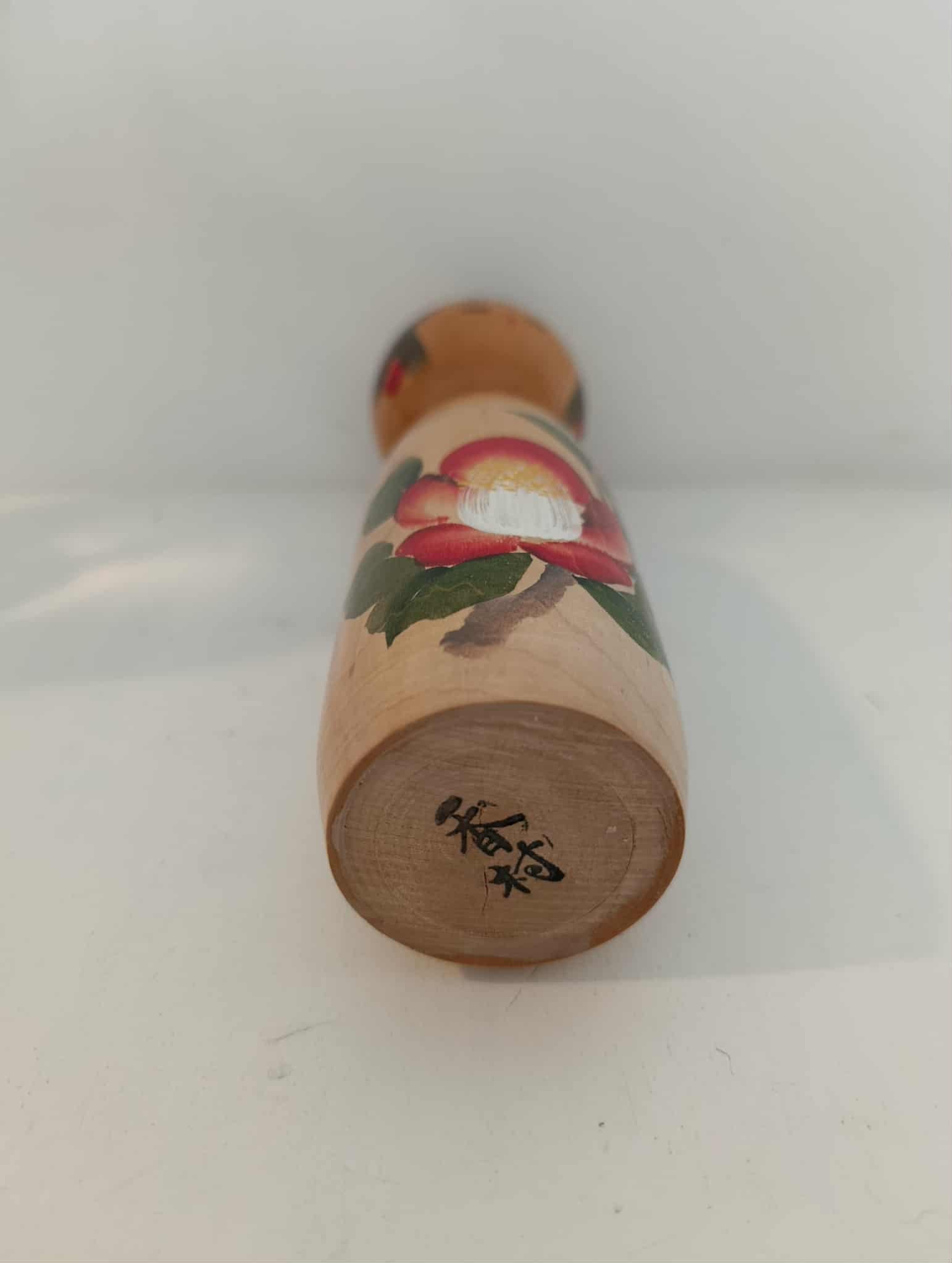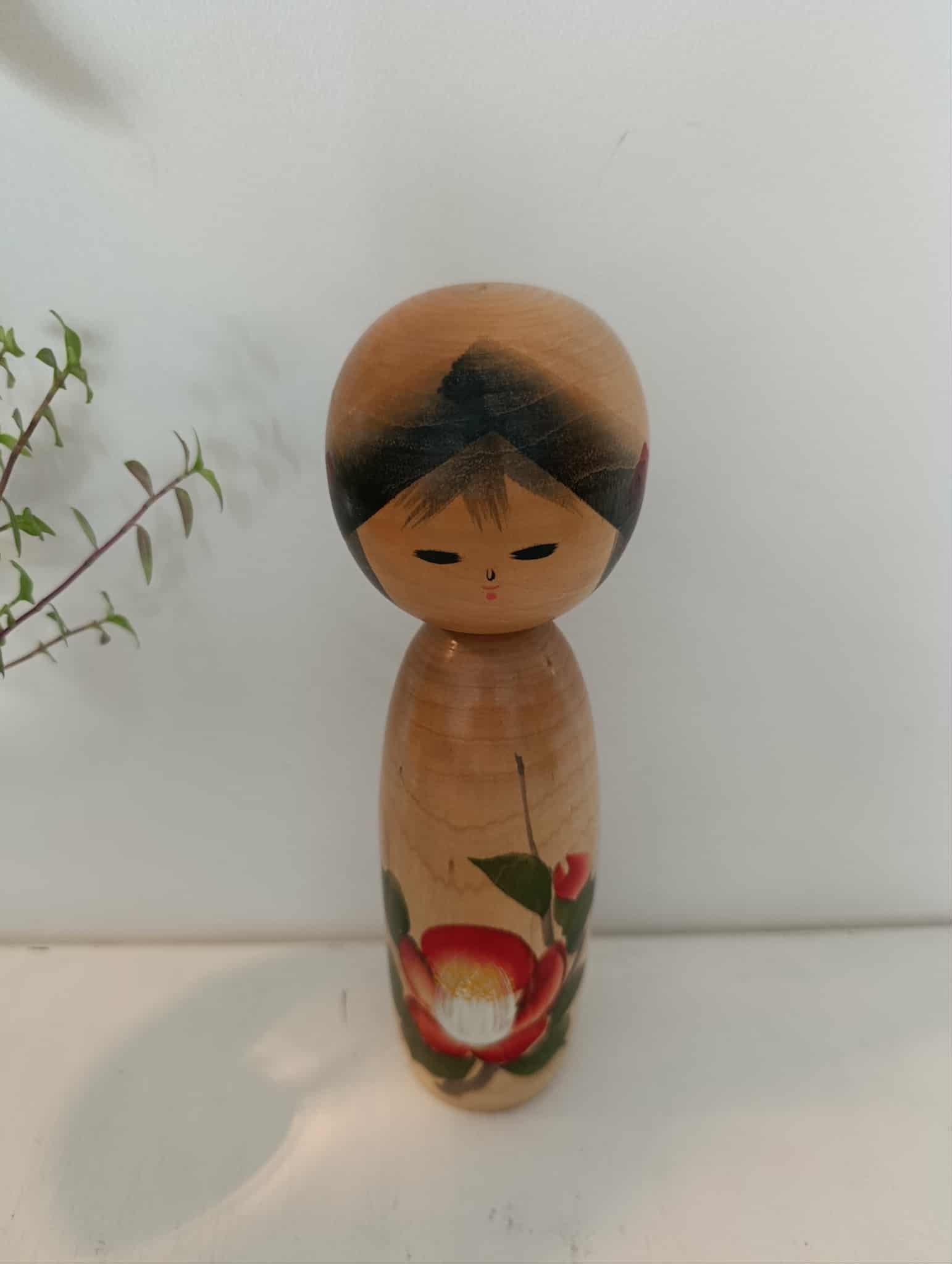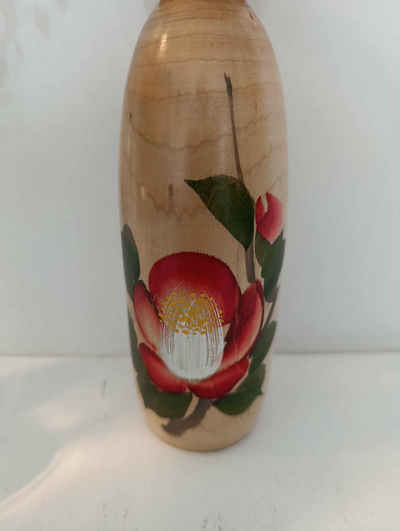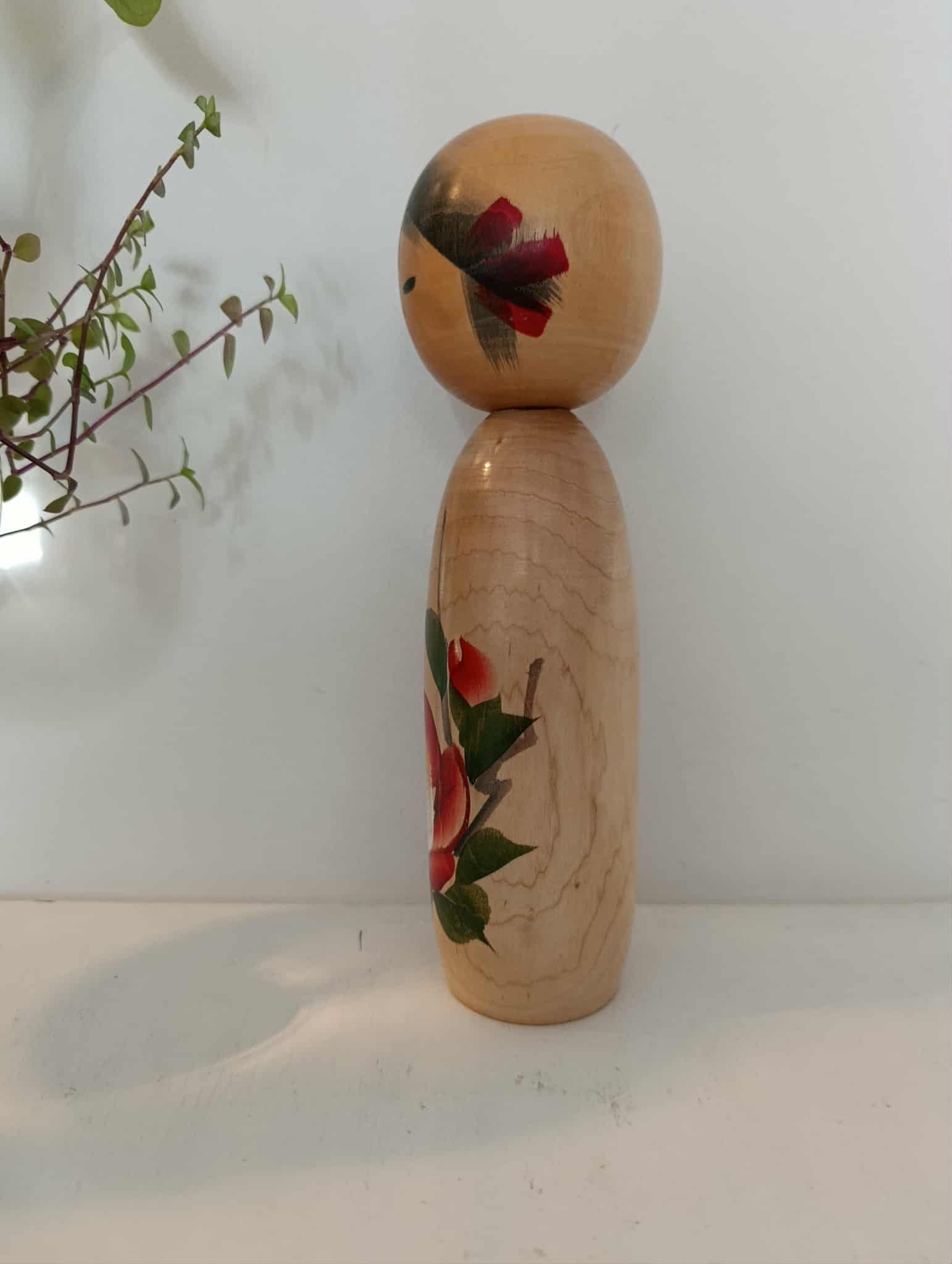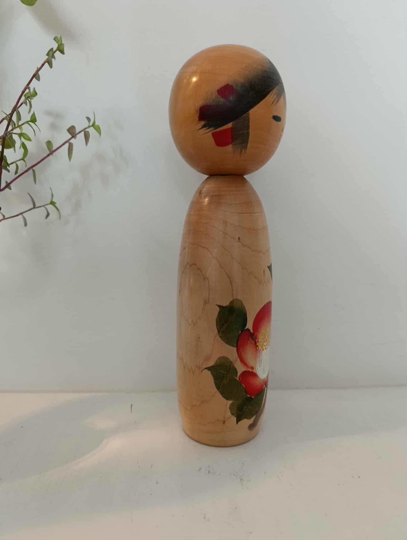 Kokeshi sosaku vintage par Sato Kouson . Parée d'un kimono éclatant ( camélia ) , cette pièce est une petite beauté ! Au Japon, le Camélia s'appelle « TSUBAKI » , forte valeur culturelle liée au cérémonial sacré de l'empire. Le Camélia devient l'emblème des Samouraï . Hauteur 24 cm, Années 80.