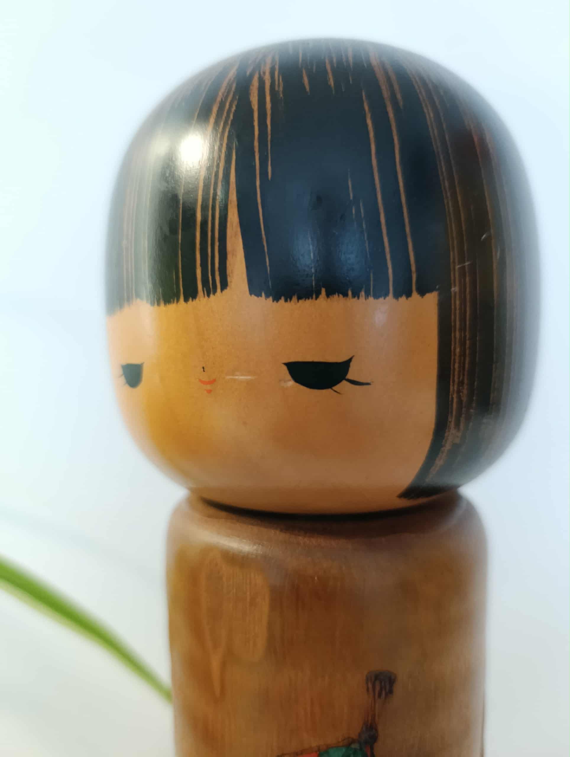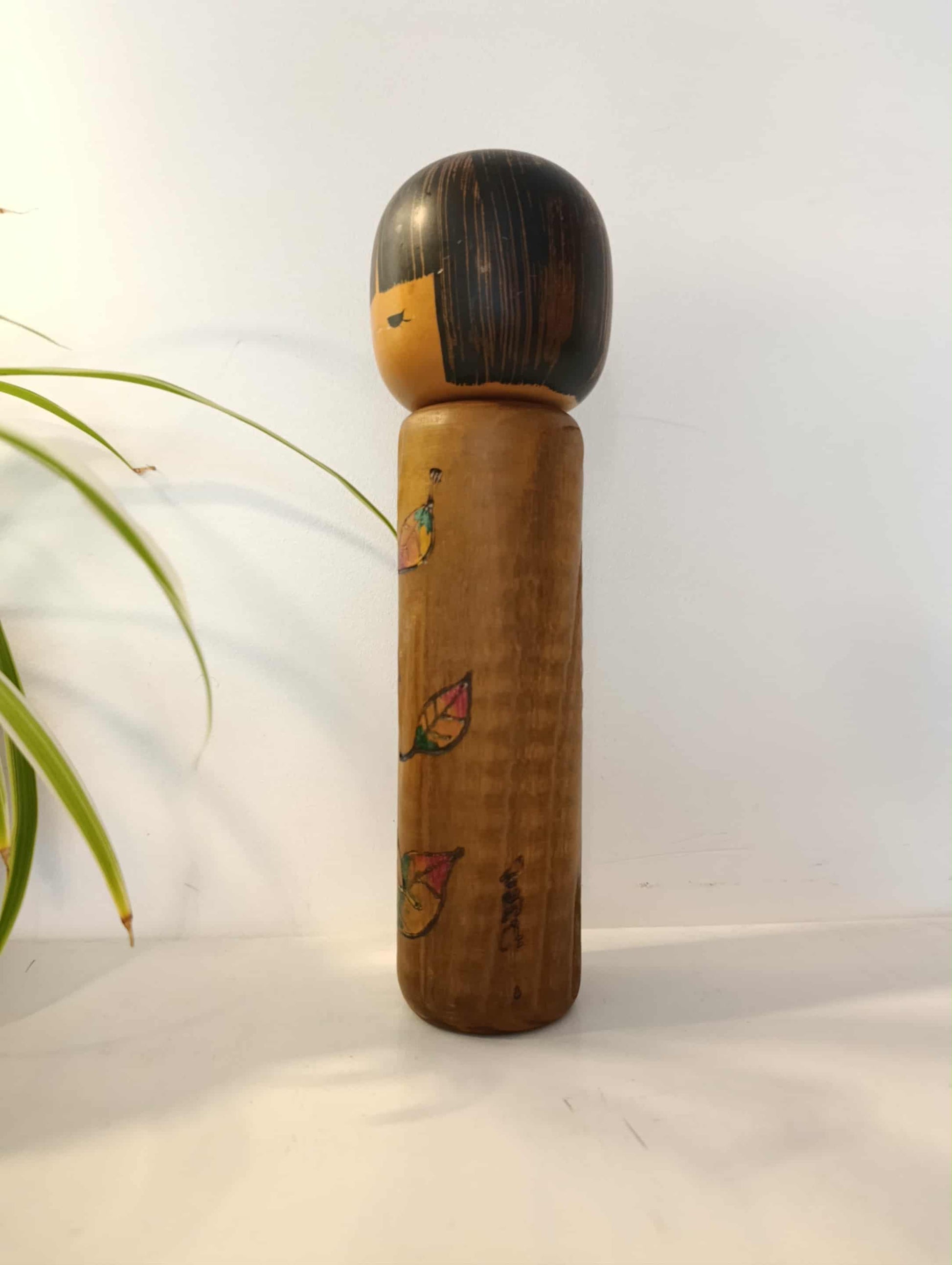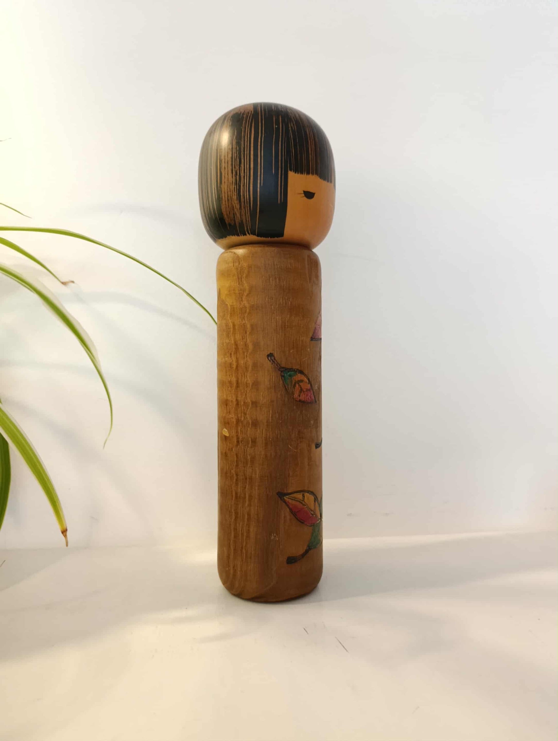 Kokeshi sosaku vintage, par Okamoto Usaburo (1917-2009) . Feuilles d'automne aux douces teintes planant sur un joli kimono légèrement ondulé... Année 2001, hauteur 30 cm.
