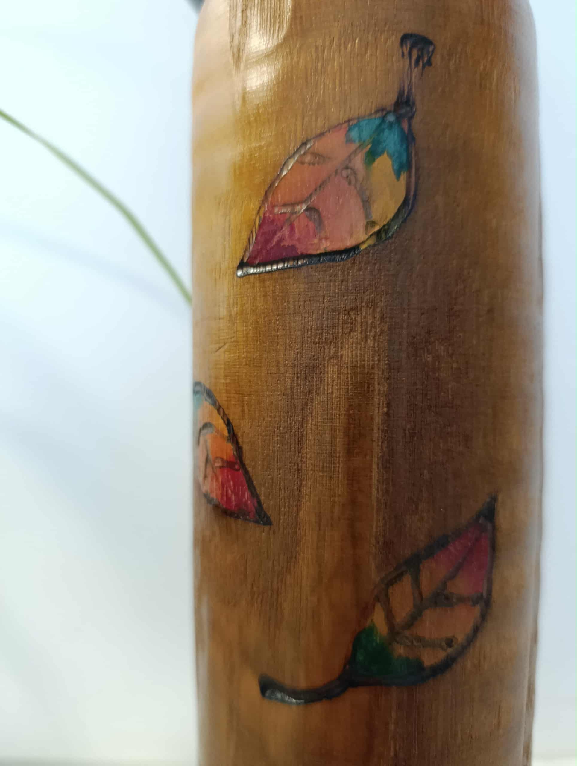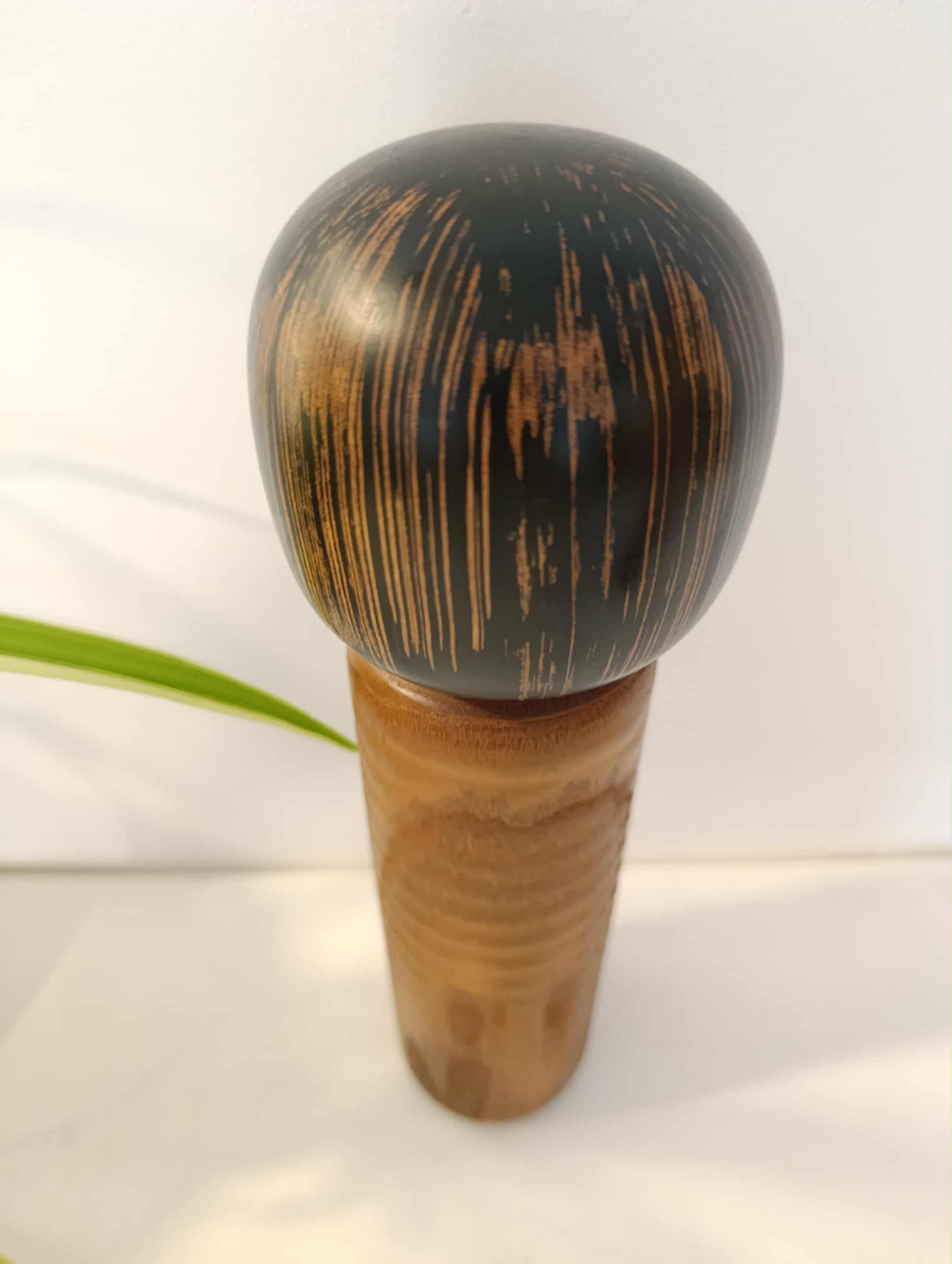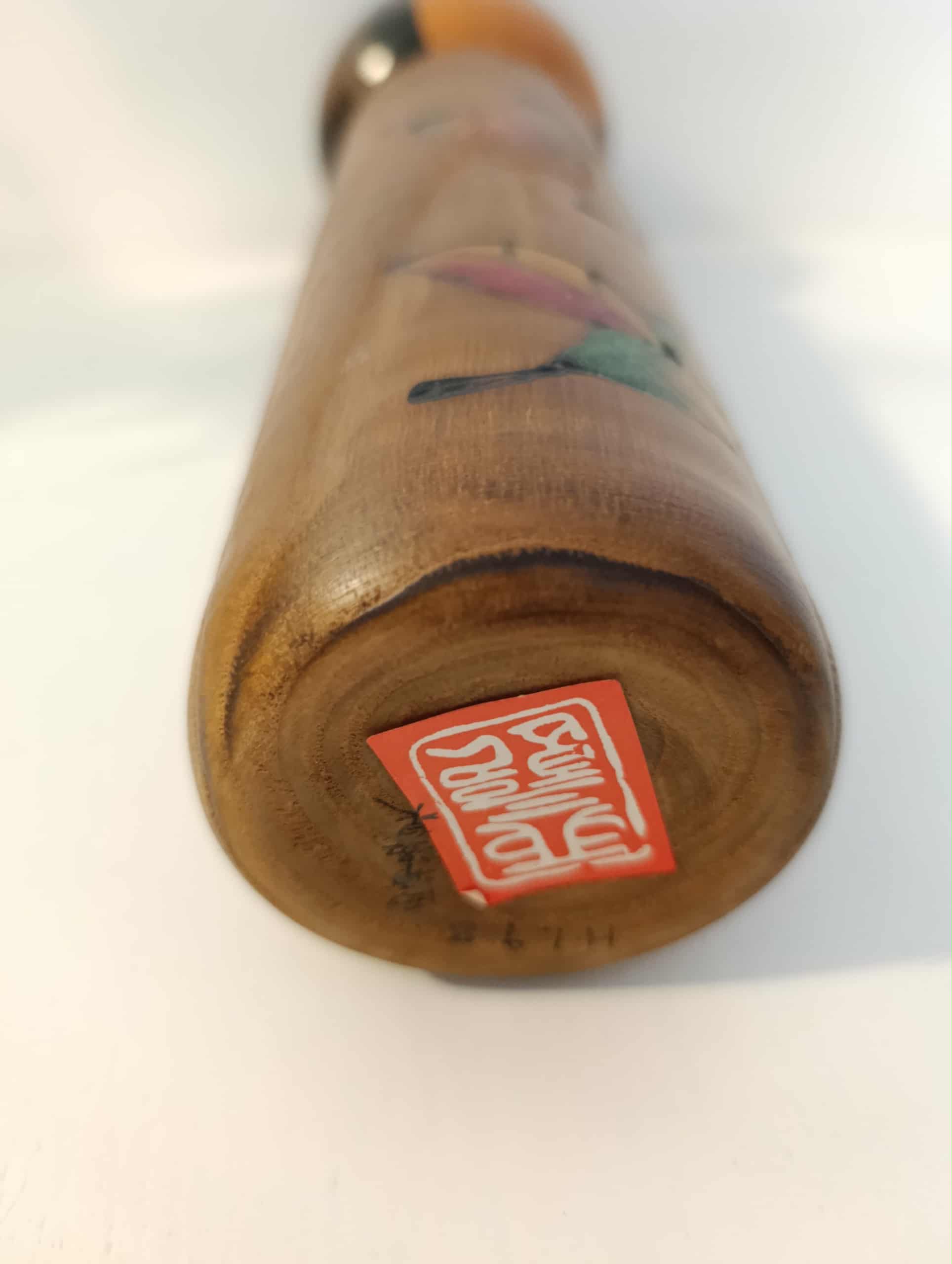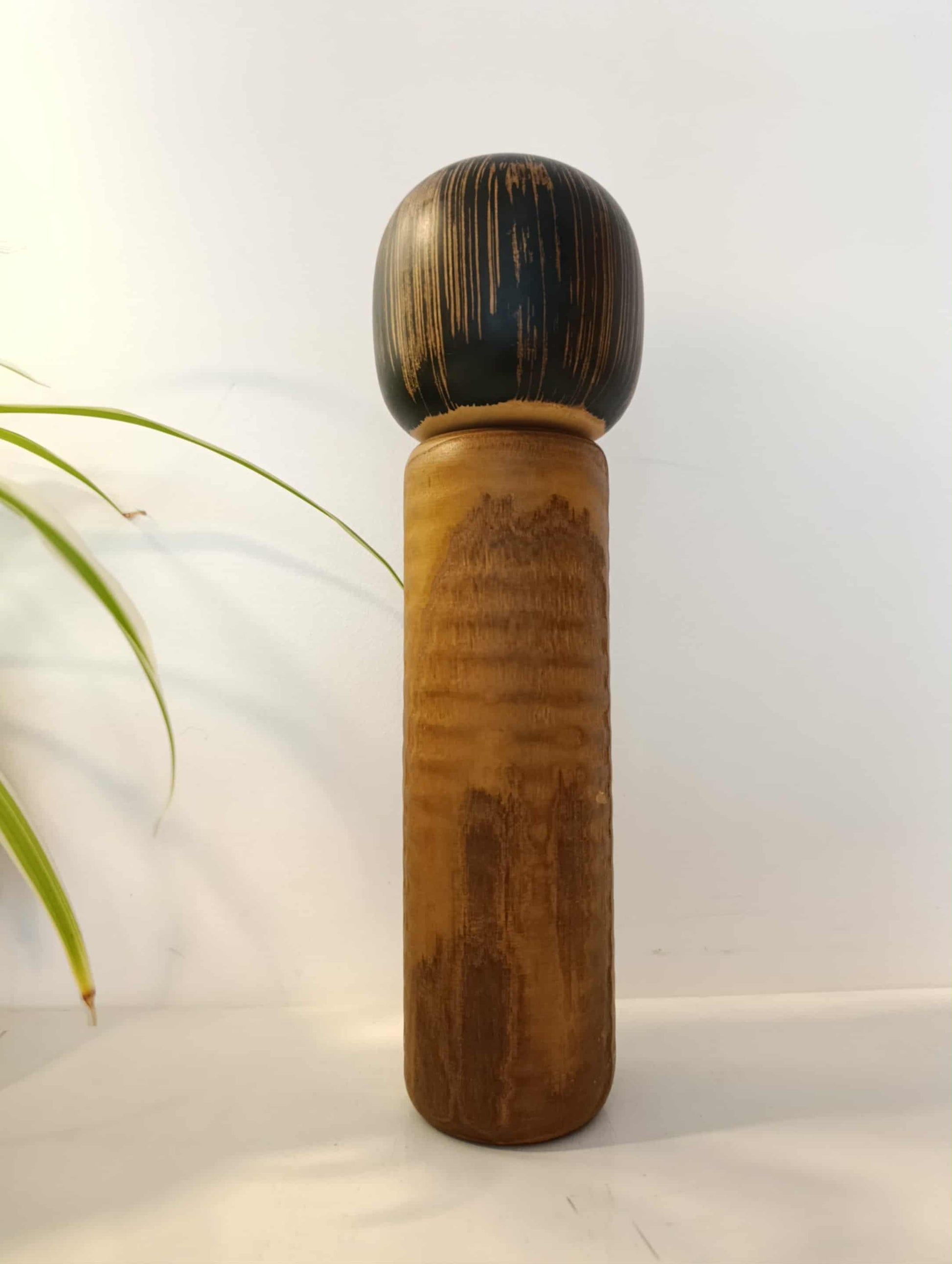 Kokeshi sosaku vintage, par Okamoto Usaburo (1917-2009) . Feuilles d'automne aux douces teintes planant sur un joli kimono légèrement ondulé... Année 2001, hauteur 30 cm.