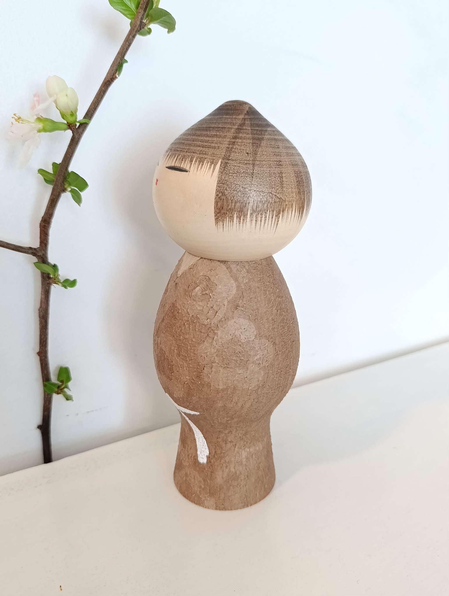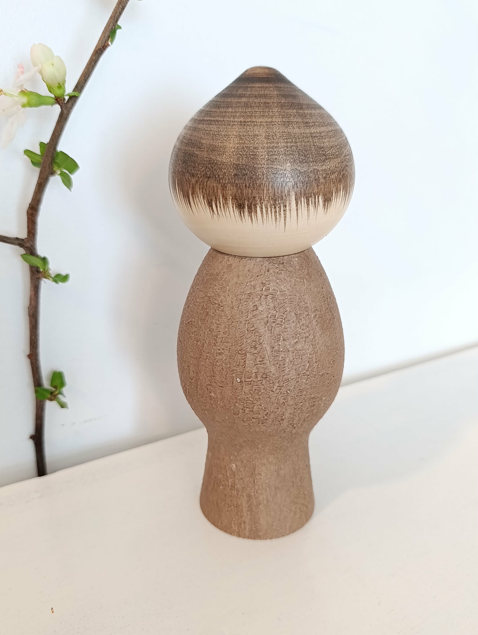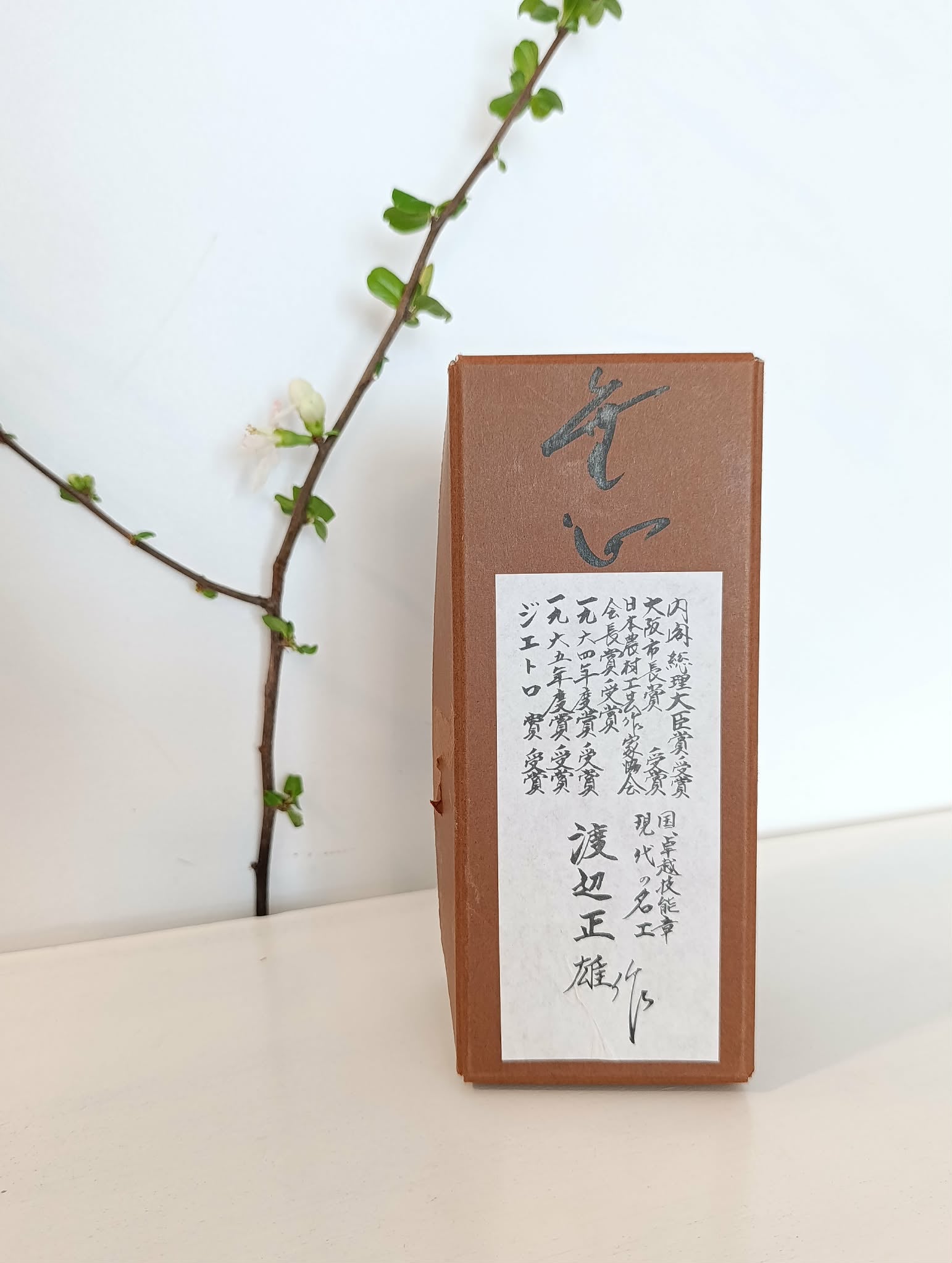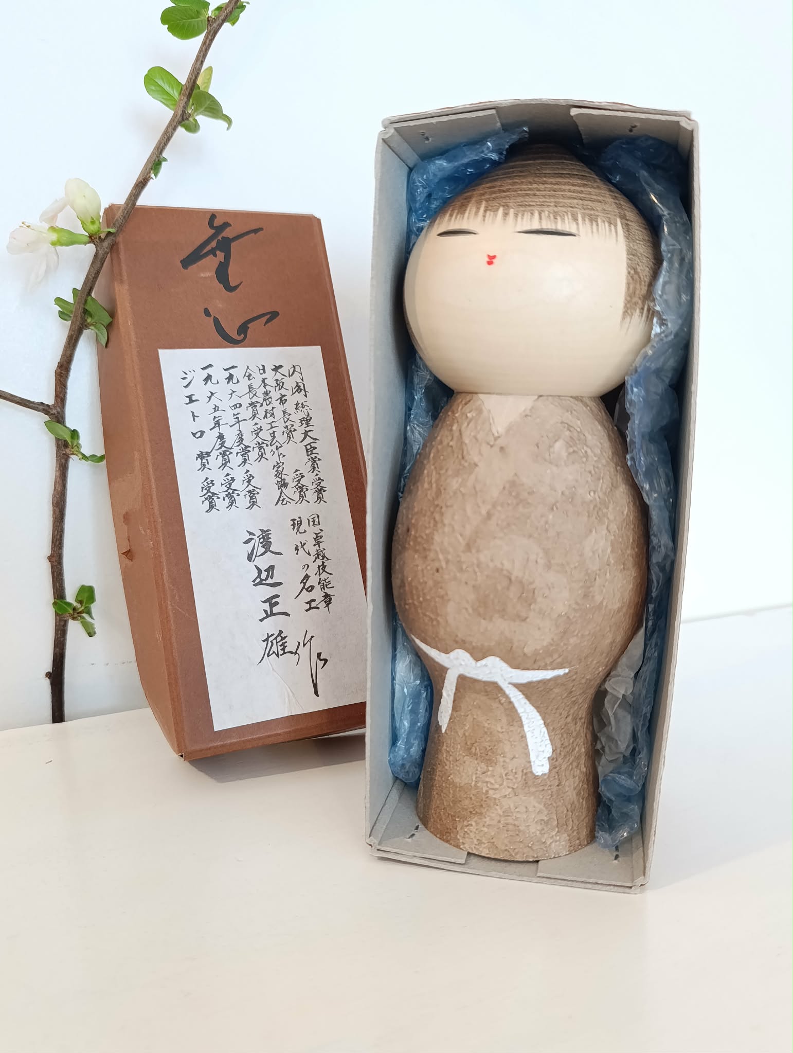 Fameuse sosaku vintage "Mushin" par le tout aussi fameux Watanabe Masao (1917-2007) ! Kokeshi souvent déclinée en de differentes dimensions, si réussie, si pleine de signification(s) . Il ne lui manque rien... Celle-ci particulièrement, puisque jamais utilisée, ancienne mais neuve, parfaite condition donc, dans sa boîte d'origine... Hauteur 21 cm. Années 60/70.