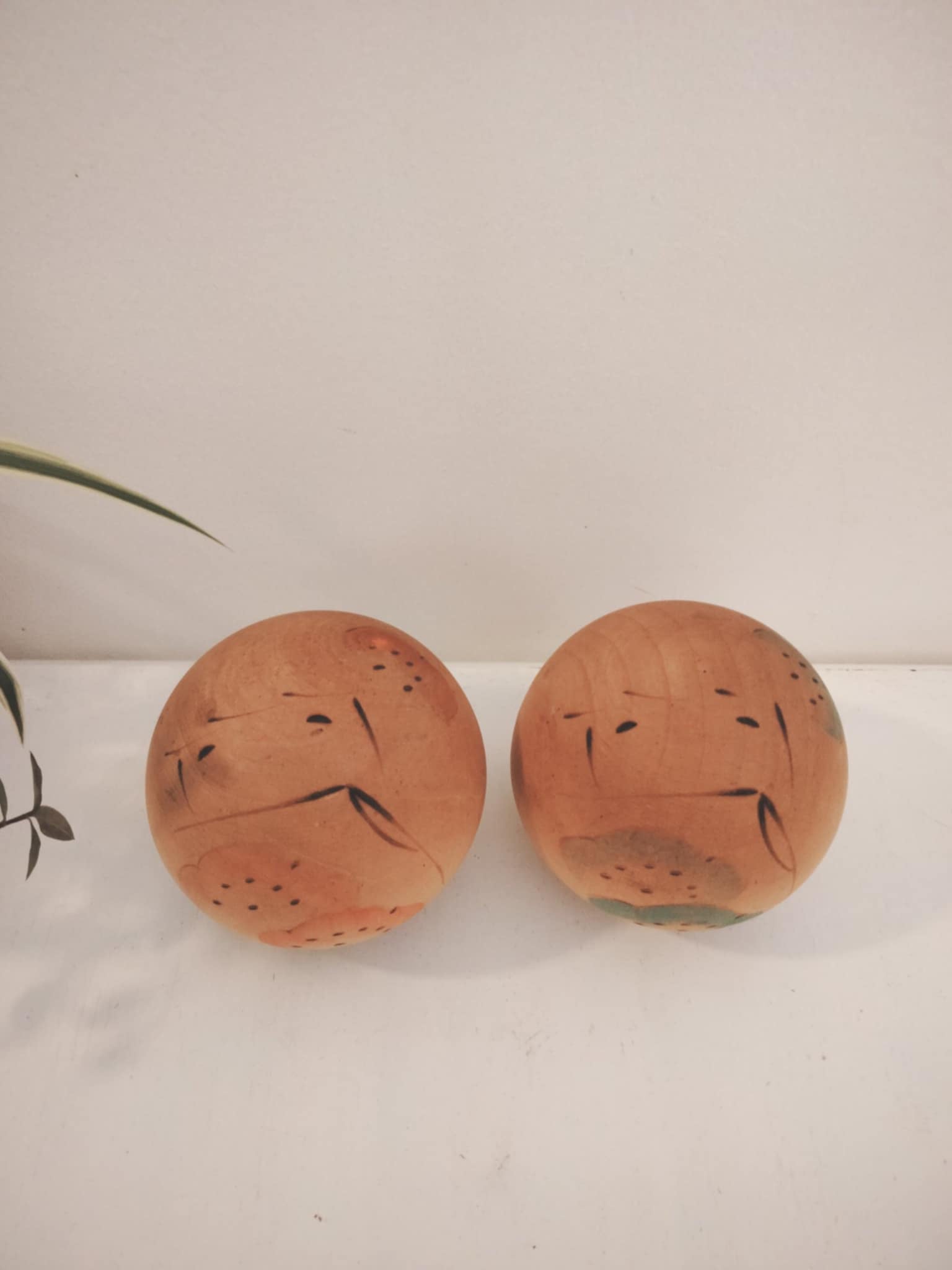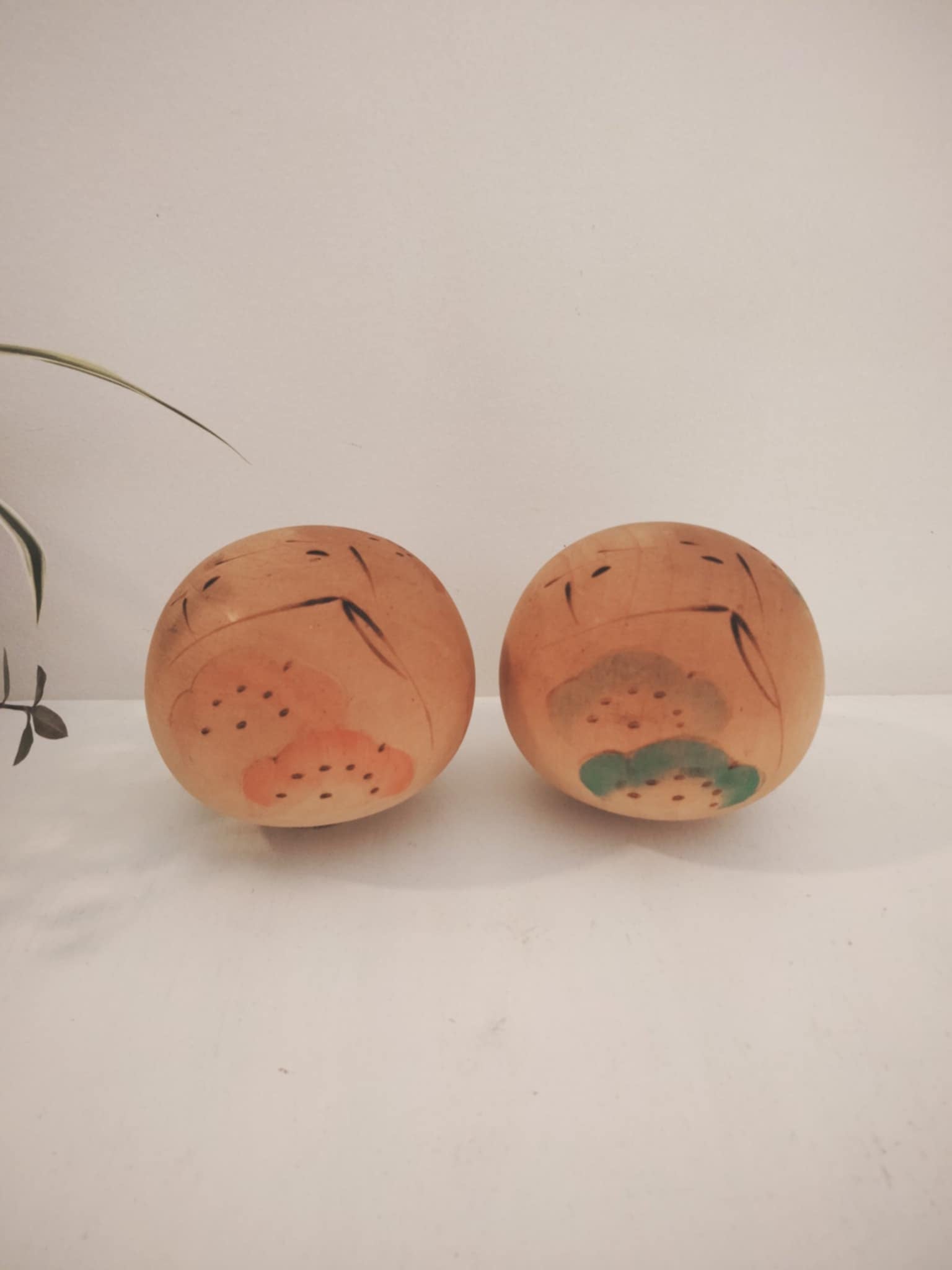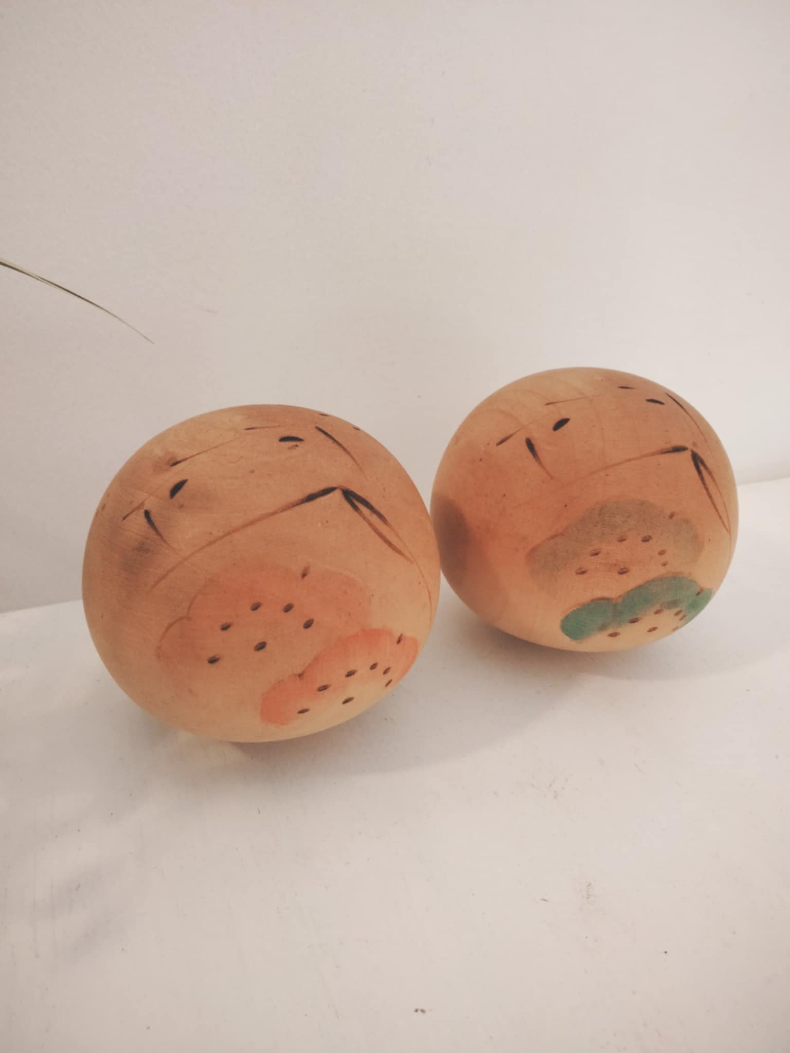 Duo kokeshi par le célèbre Usaburo , qui aura goûté à tous les styles. Beau choix de bois pour ces 2 petites pyrogravées , aux teintes douces... Ø 7.5cm chacune. Années 90/2000 .