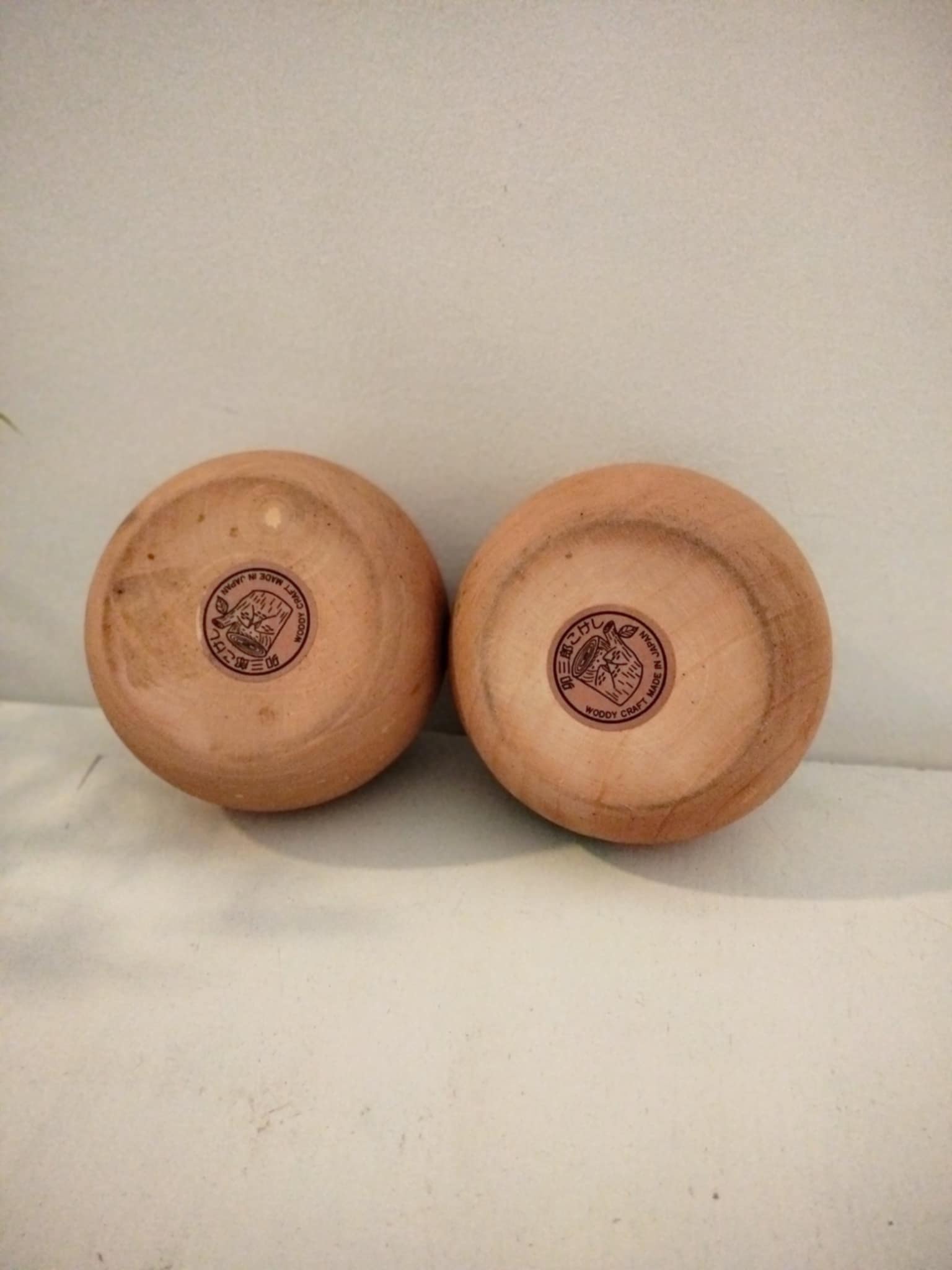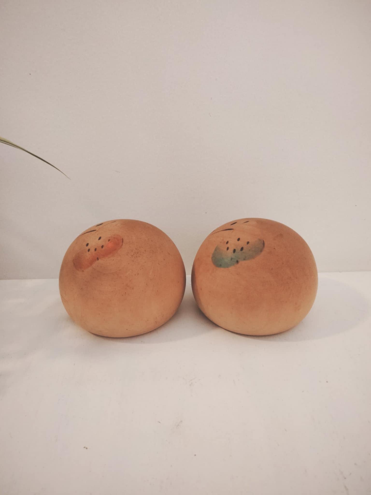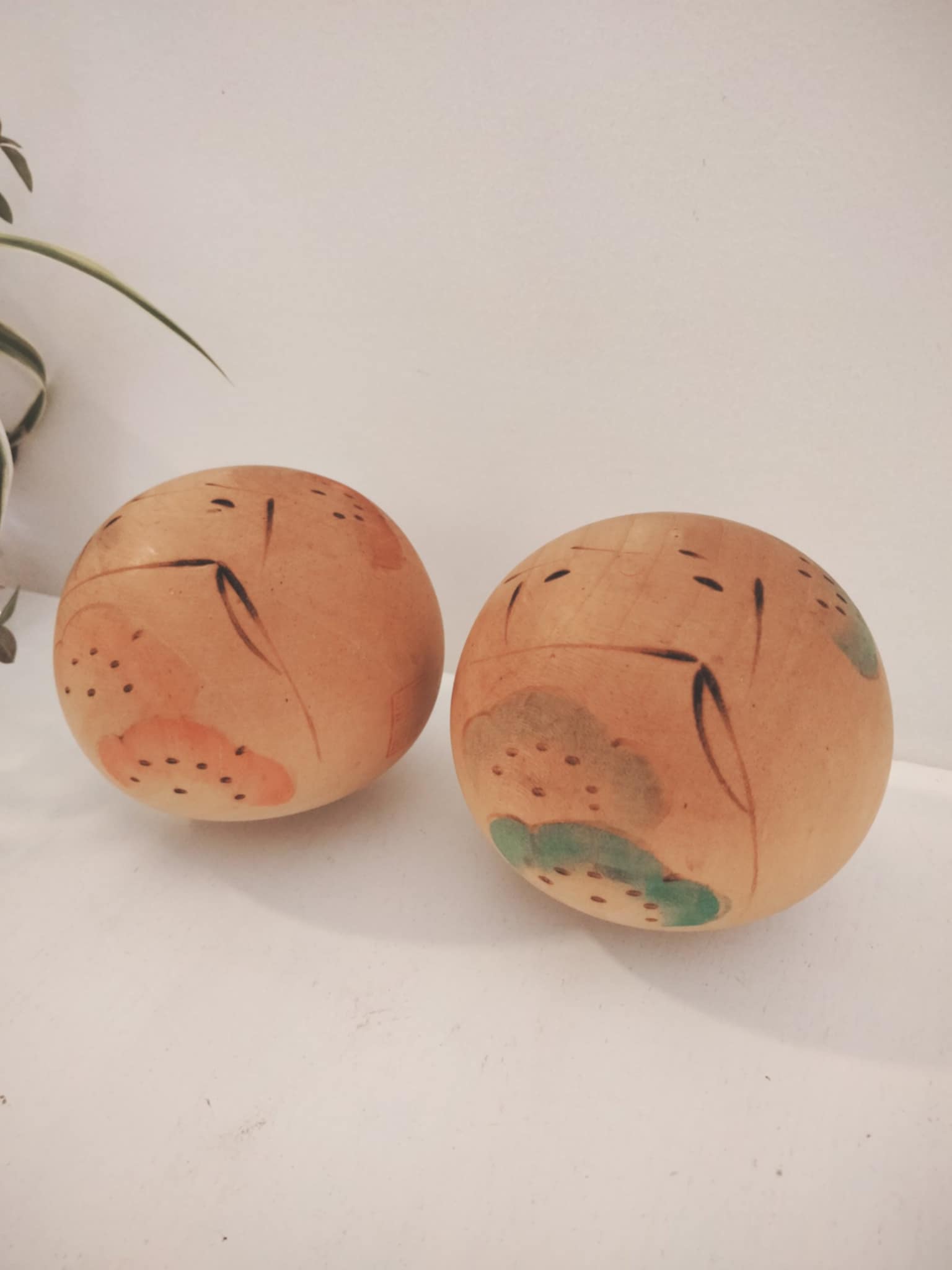 Duo kokeshi par le célèbre Usaburo , qui aura goûté à tous les styles. Beau choix de bois pour ces 2 petites pyrogravées , aux teintes douces... Ø 7.5cm chacune. Années 90/2000 .