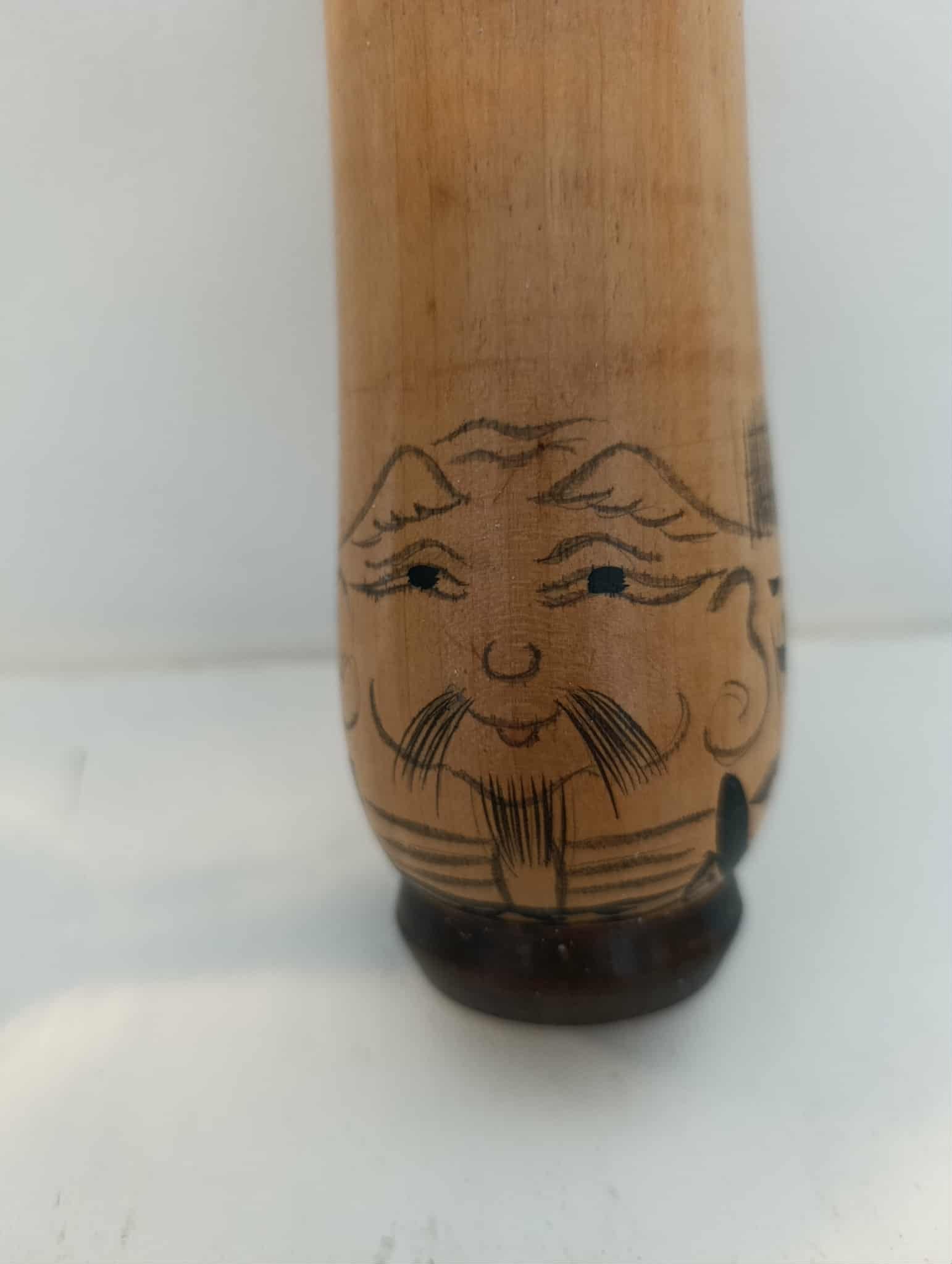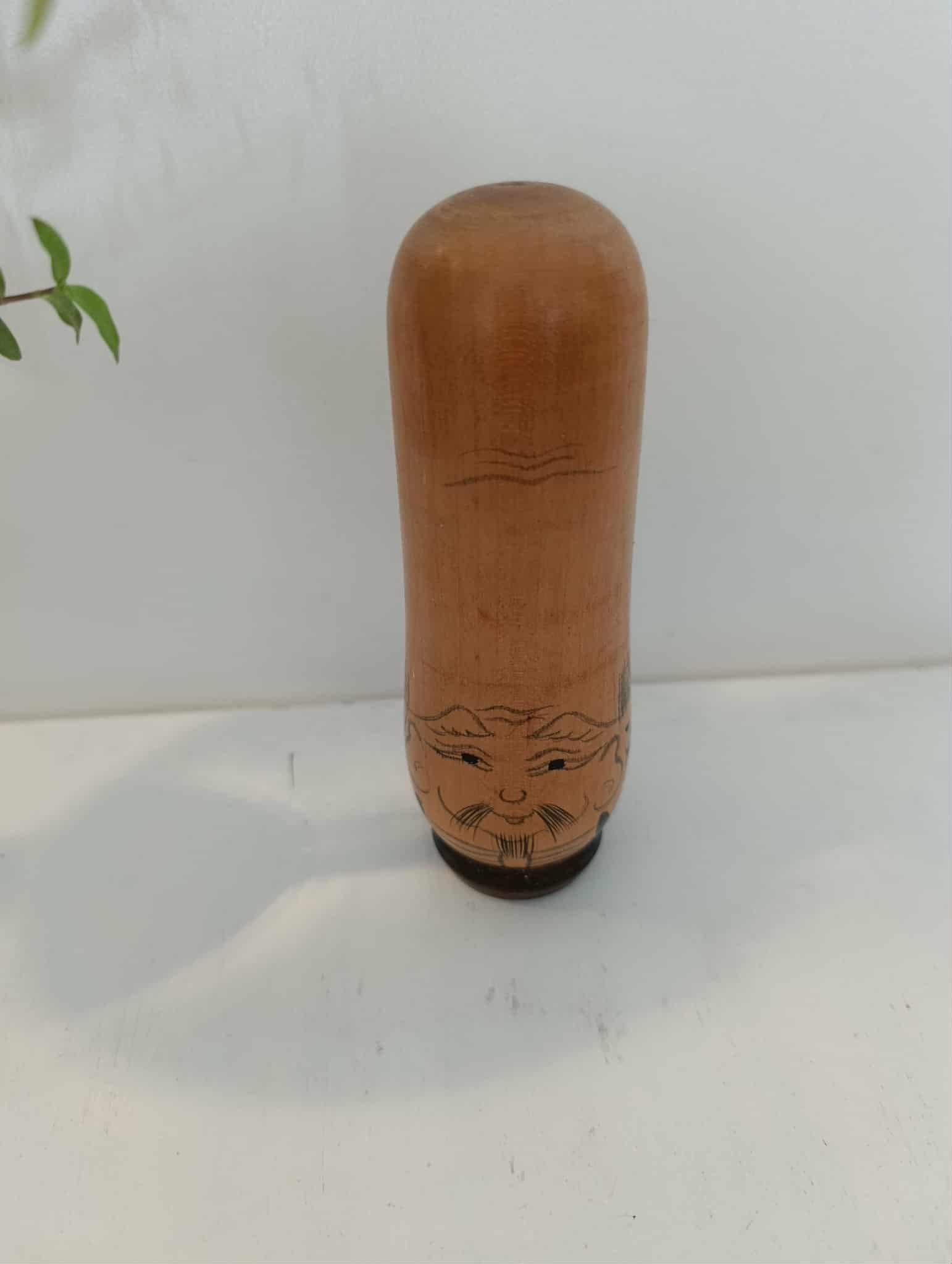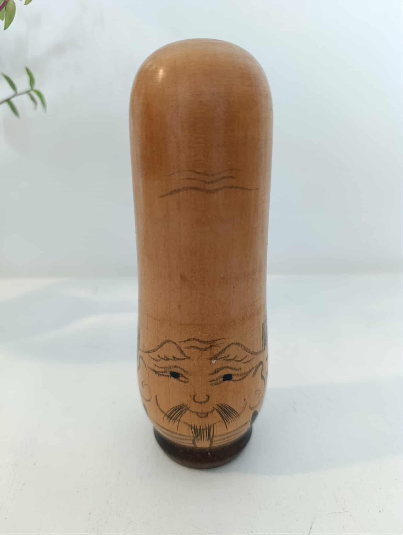 Kokeshi sosaku vintage, sous les traits de Fukurokuju, qui est une des Sept Divinités du Bonheur dans la mythologie Shinto. Il est le Dieu de la richesse, de la longévité, de la virilité et de la sagesse.Il est représenté sous les traits d'un vieillard à la tête chauve et allongée, portant une barbe blanche. Hauteur 15 cm, années 50/60.