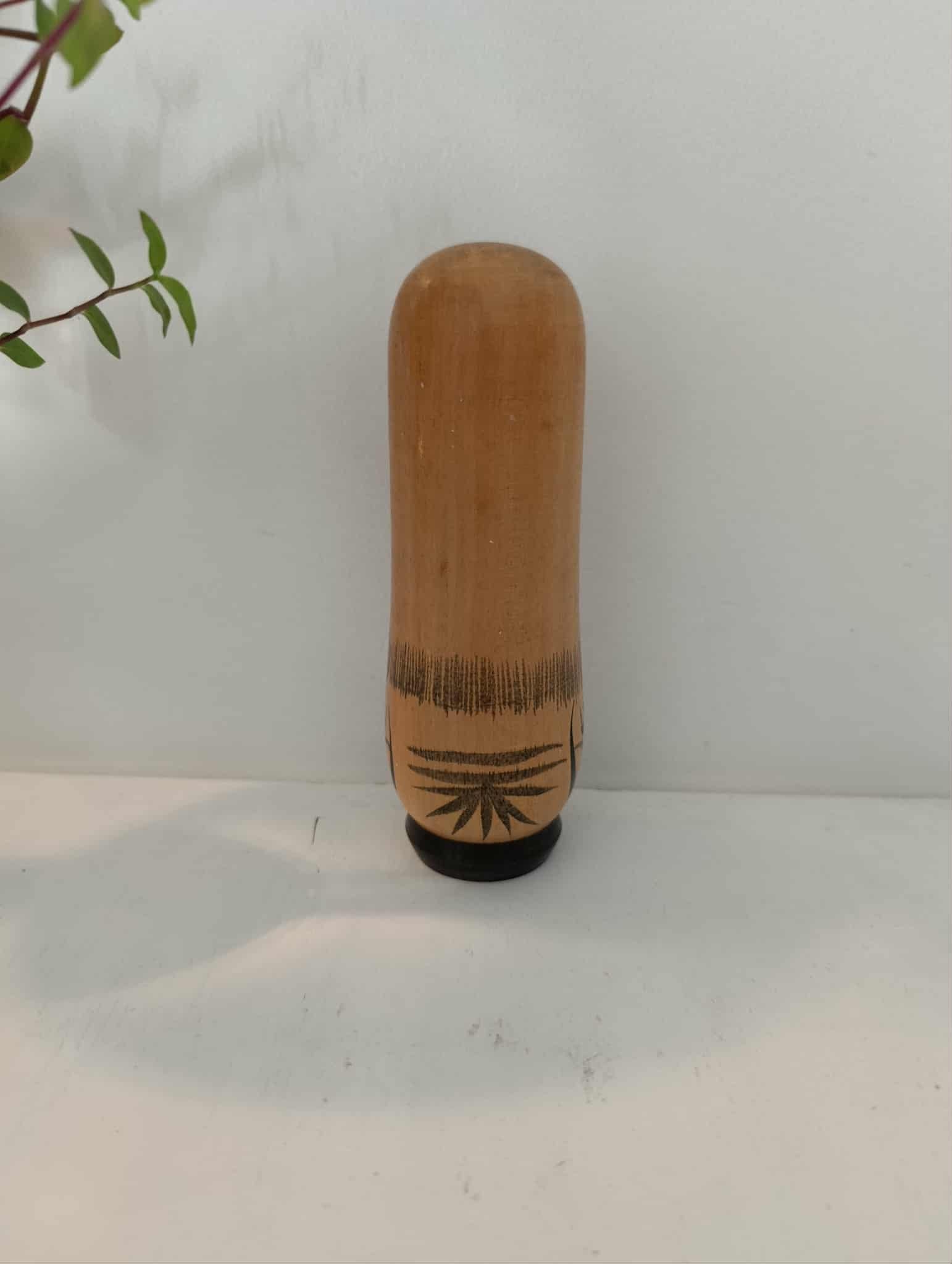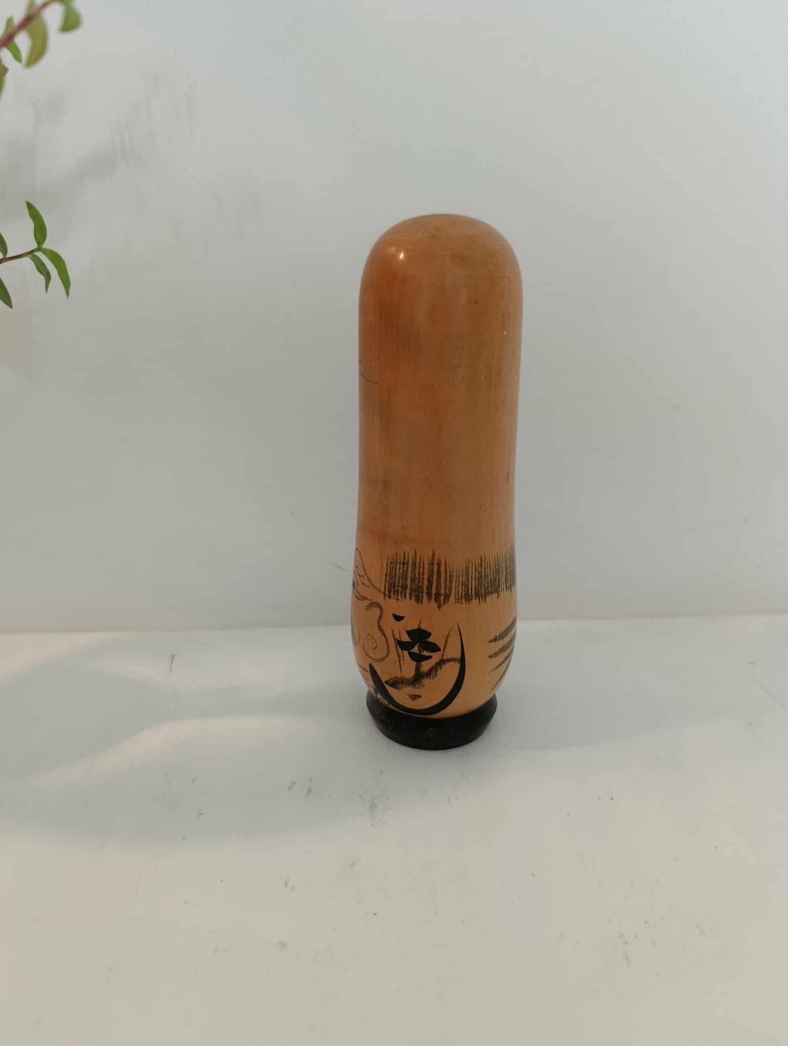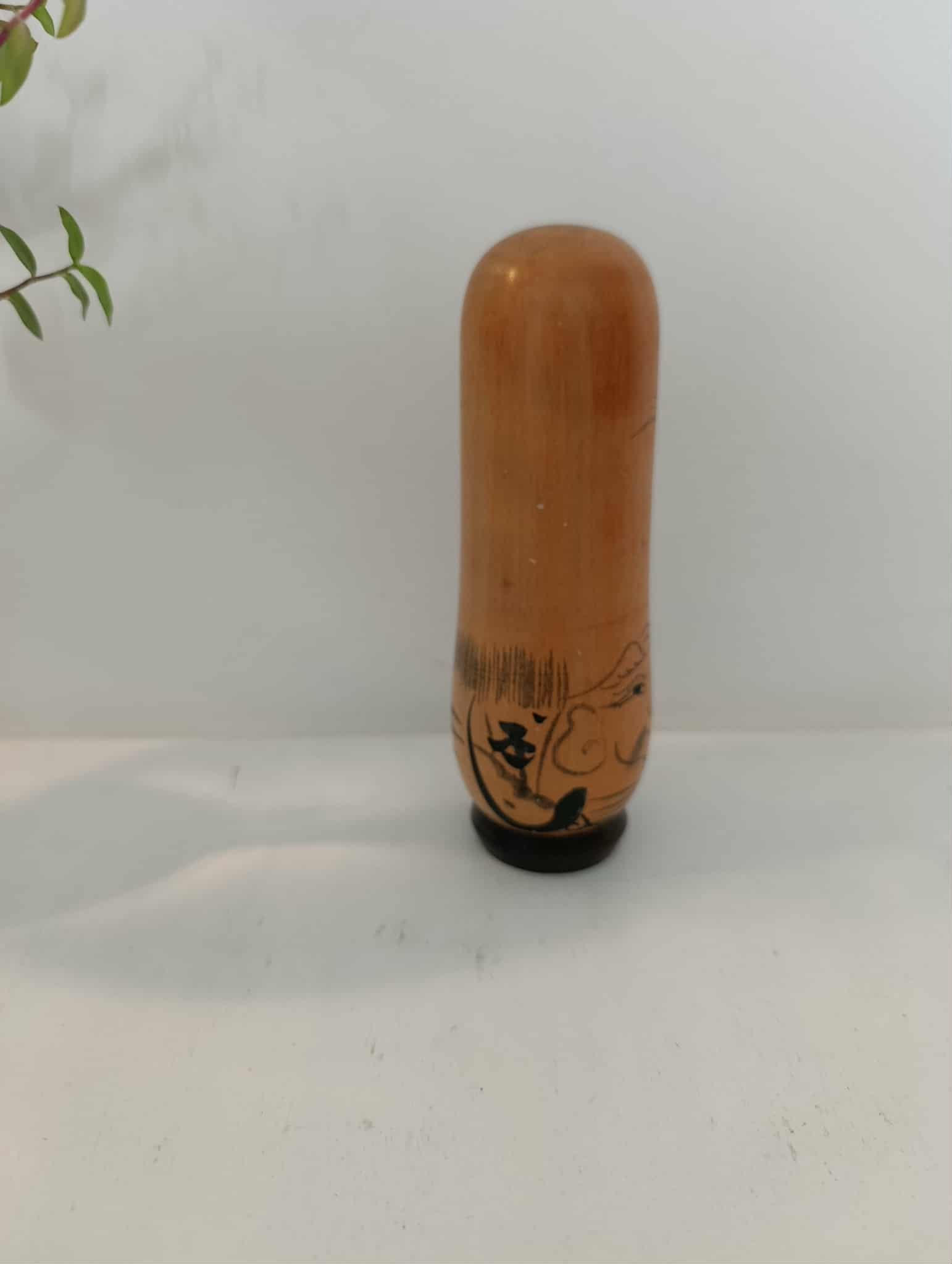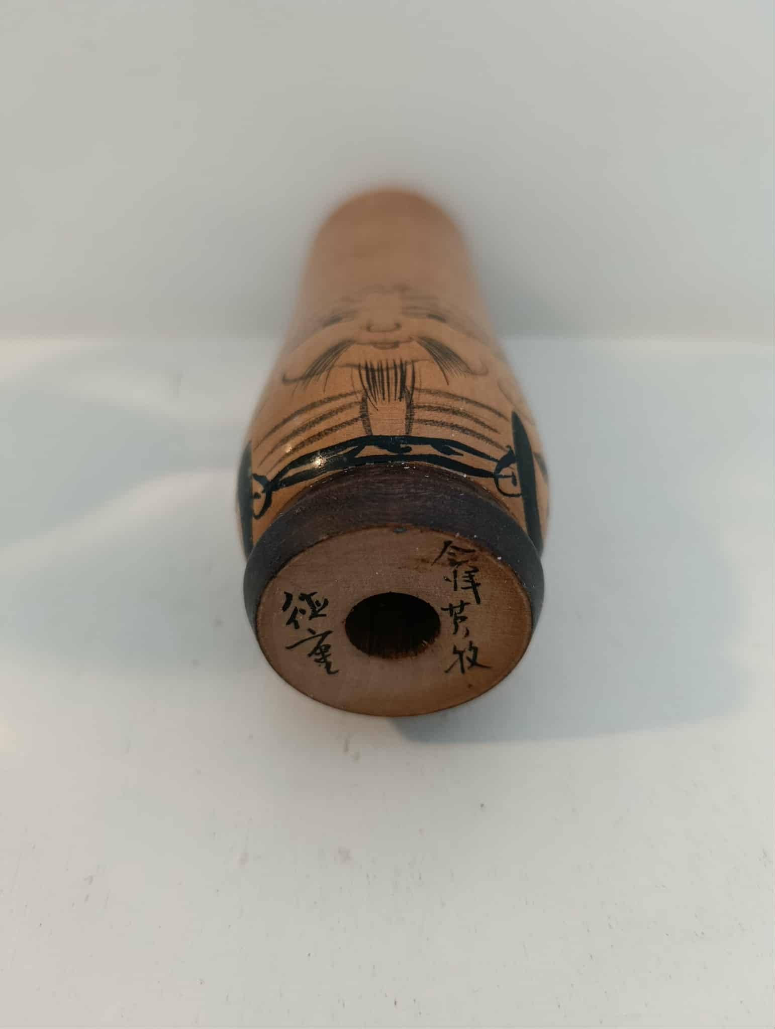 Kokeshi sosaku vintage, sous les traits de Fukurokuju, qui est une des Sept Divinités du Bonheur dans la mythologie Shinto. Il est le Dieu de la richesse, de la longévité, de la virilité et de la sagesse.Il est représenté sous les traits d'un vieillard à la tête chauve et allongée, portant une barbe blanche. Hauteur 15 cm, années 50/60.