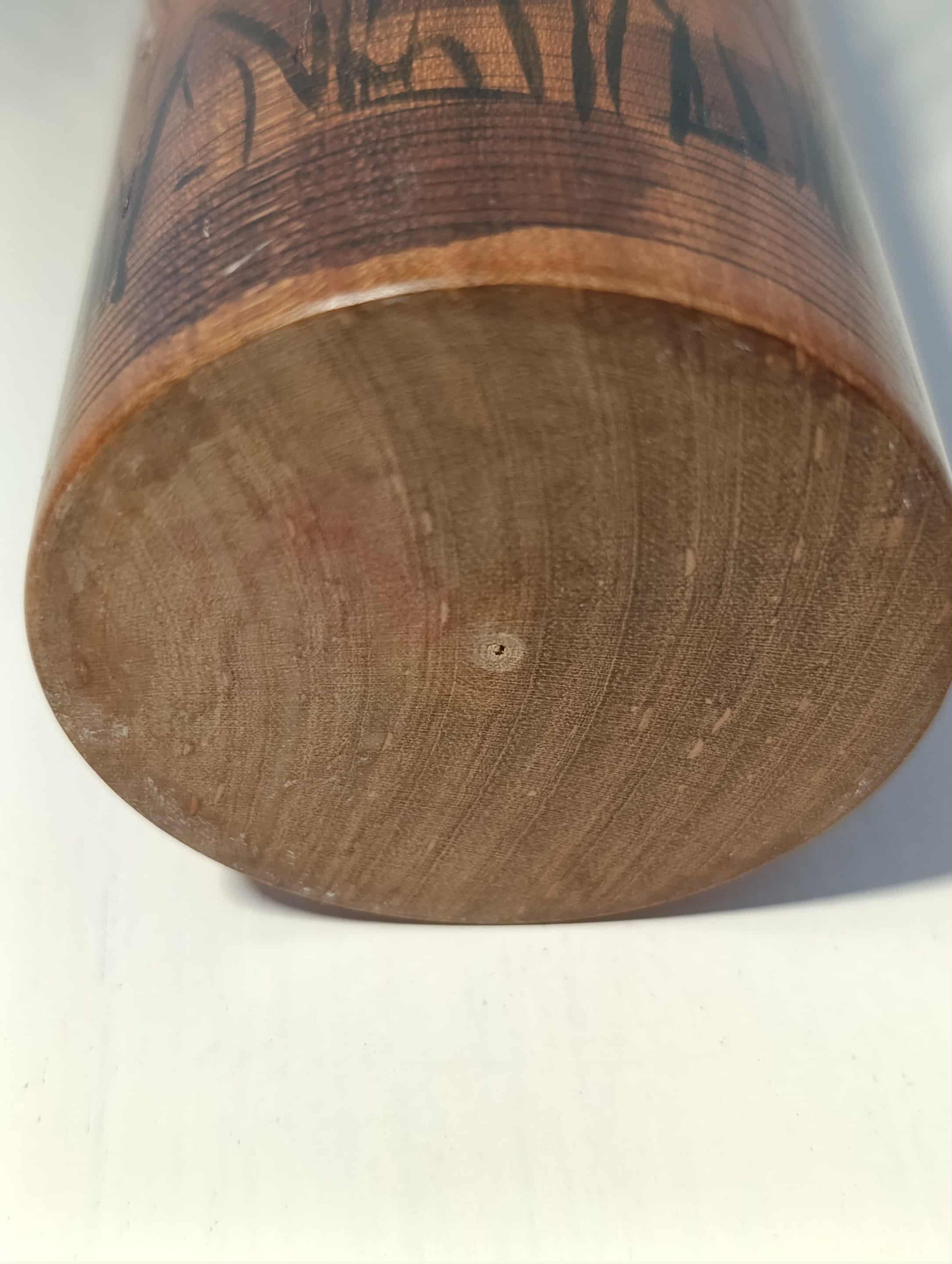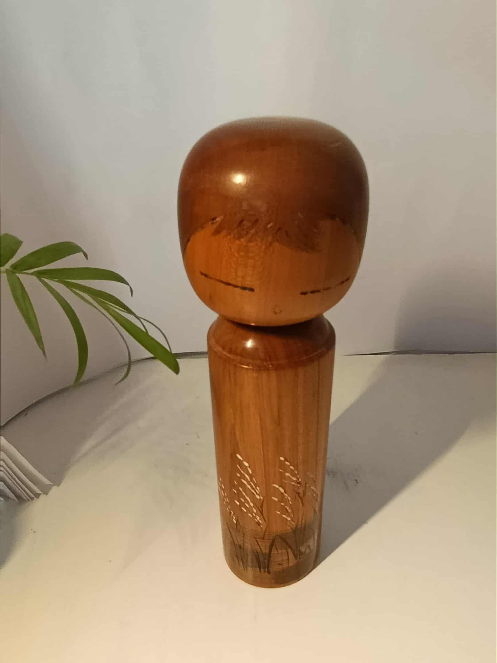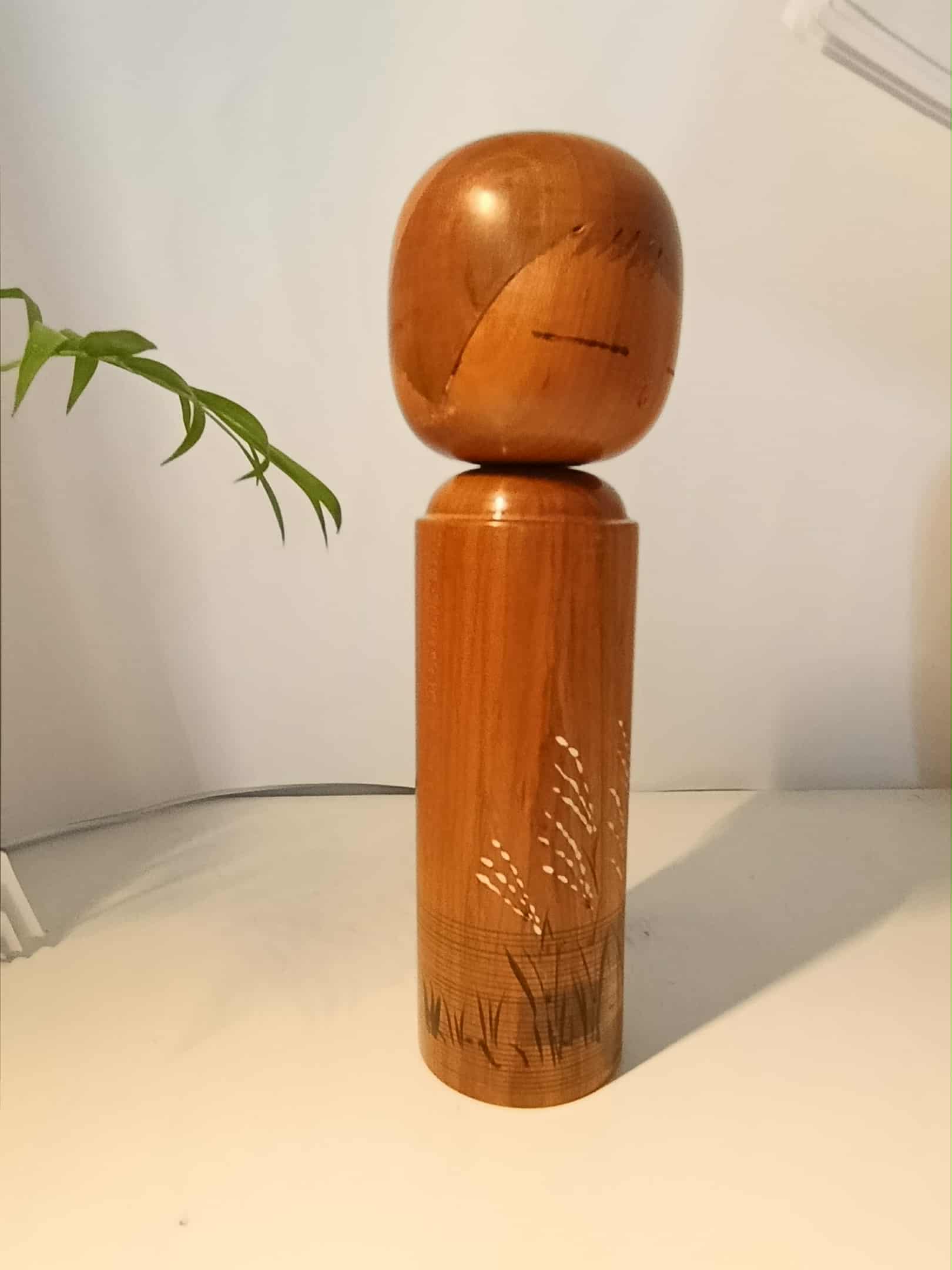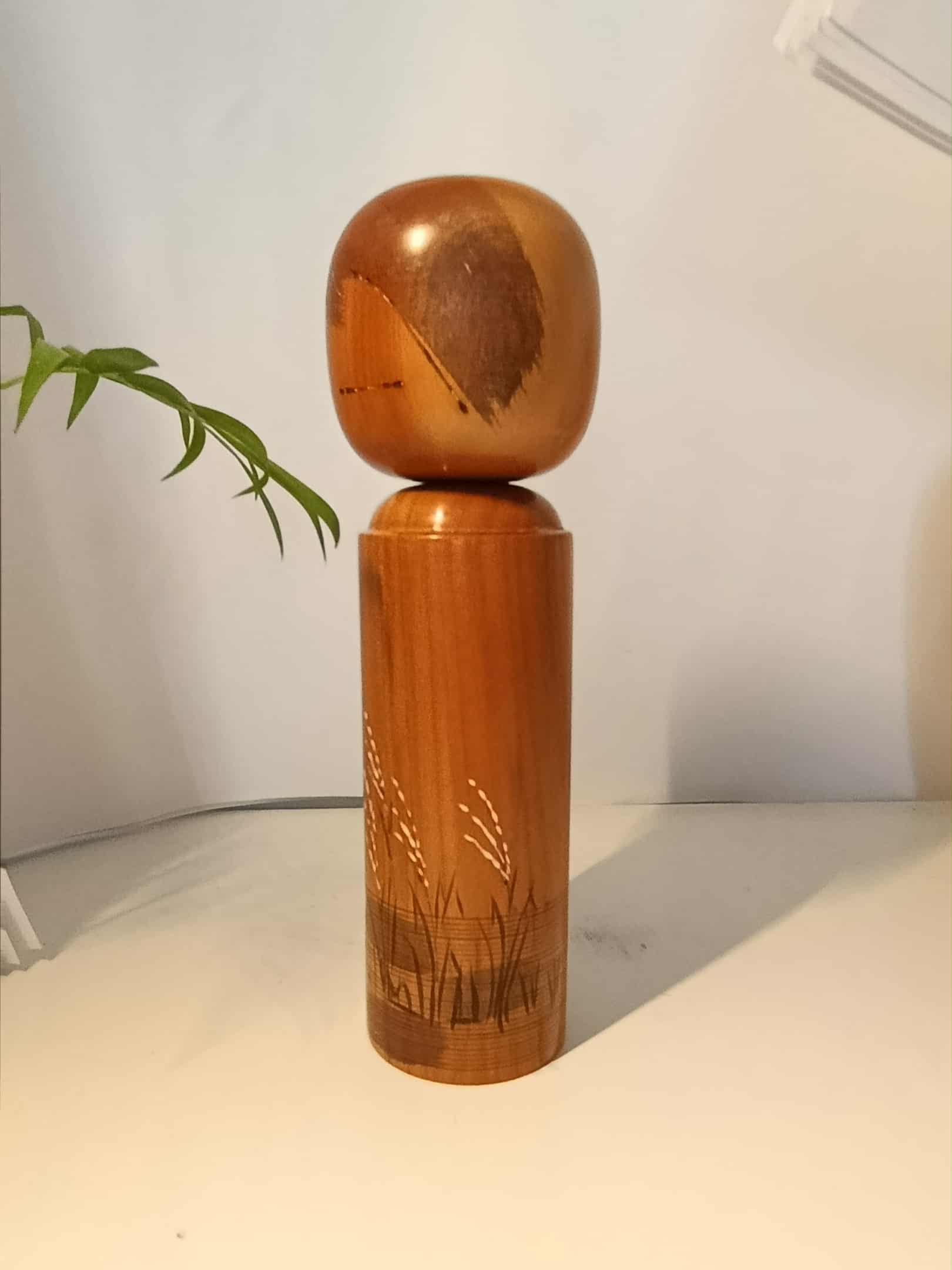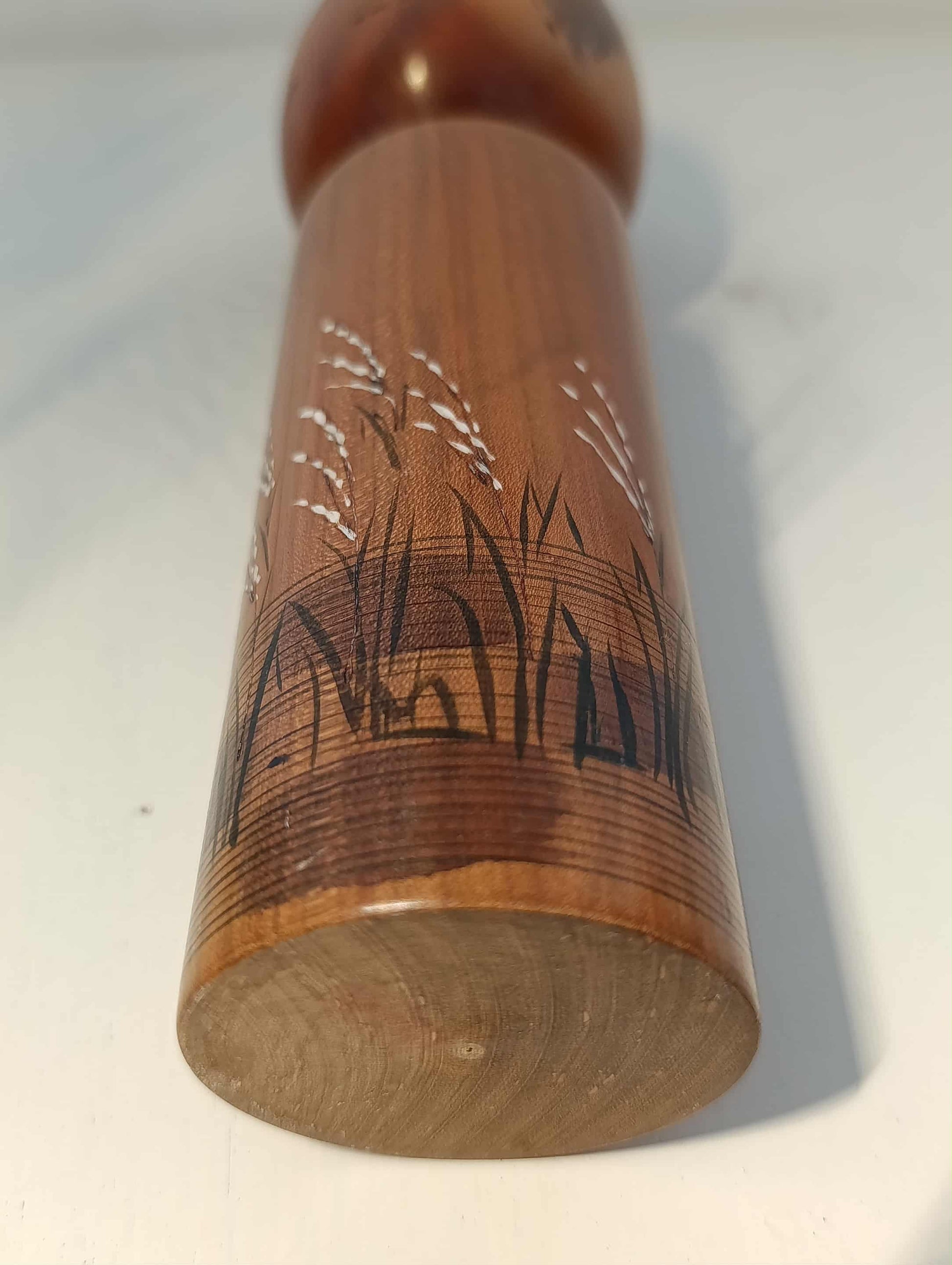 Kokeshi shingata vintage, par Masayuki Kaganuma . Jolie patine pour cette quasi monochrome, au décor naturel et venteux... Hauteur 21.5 cm, années 70...