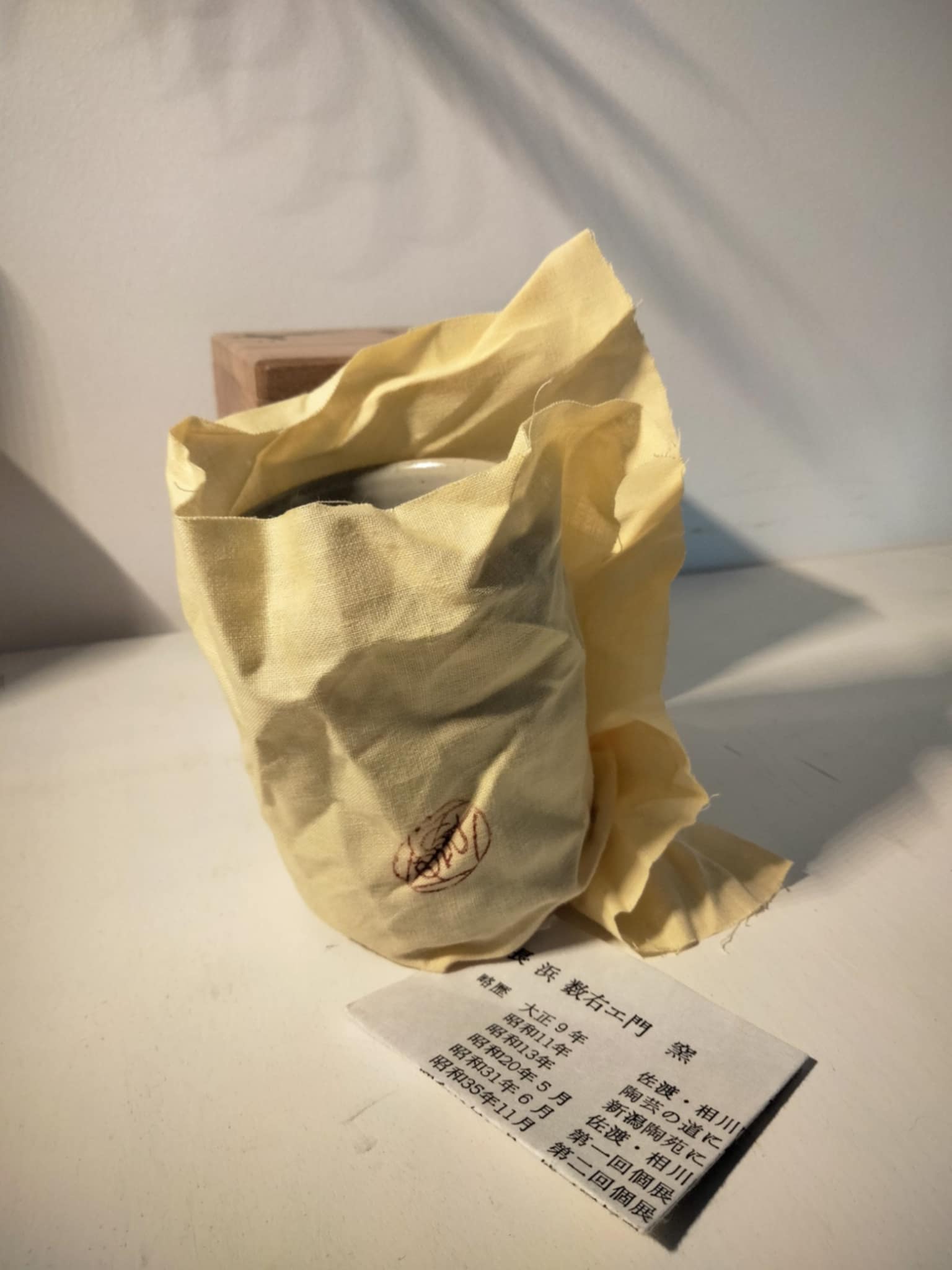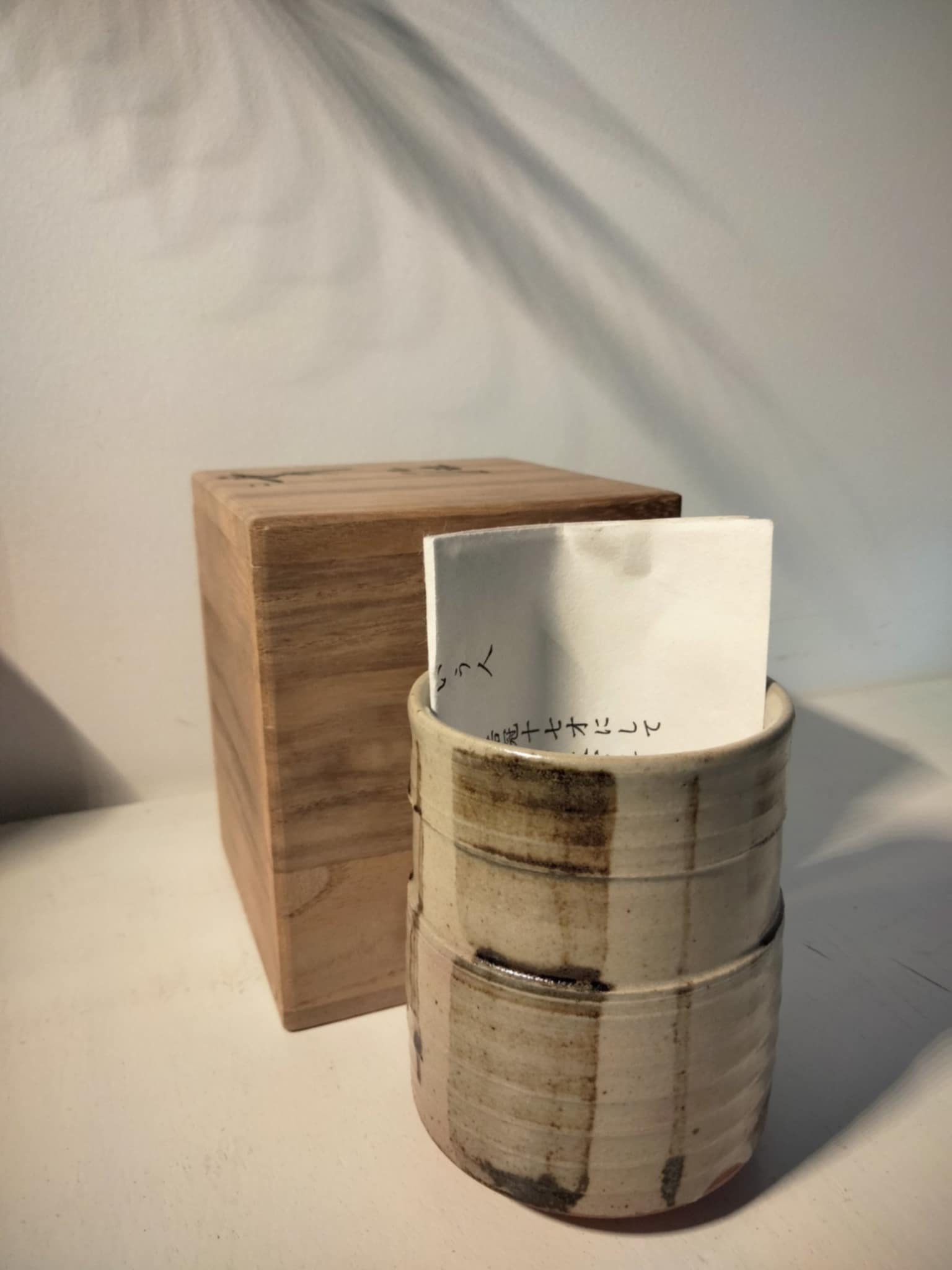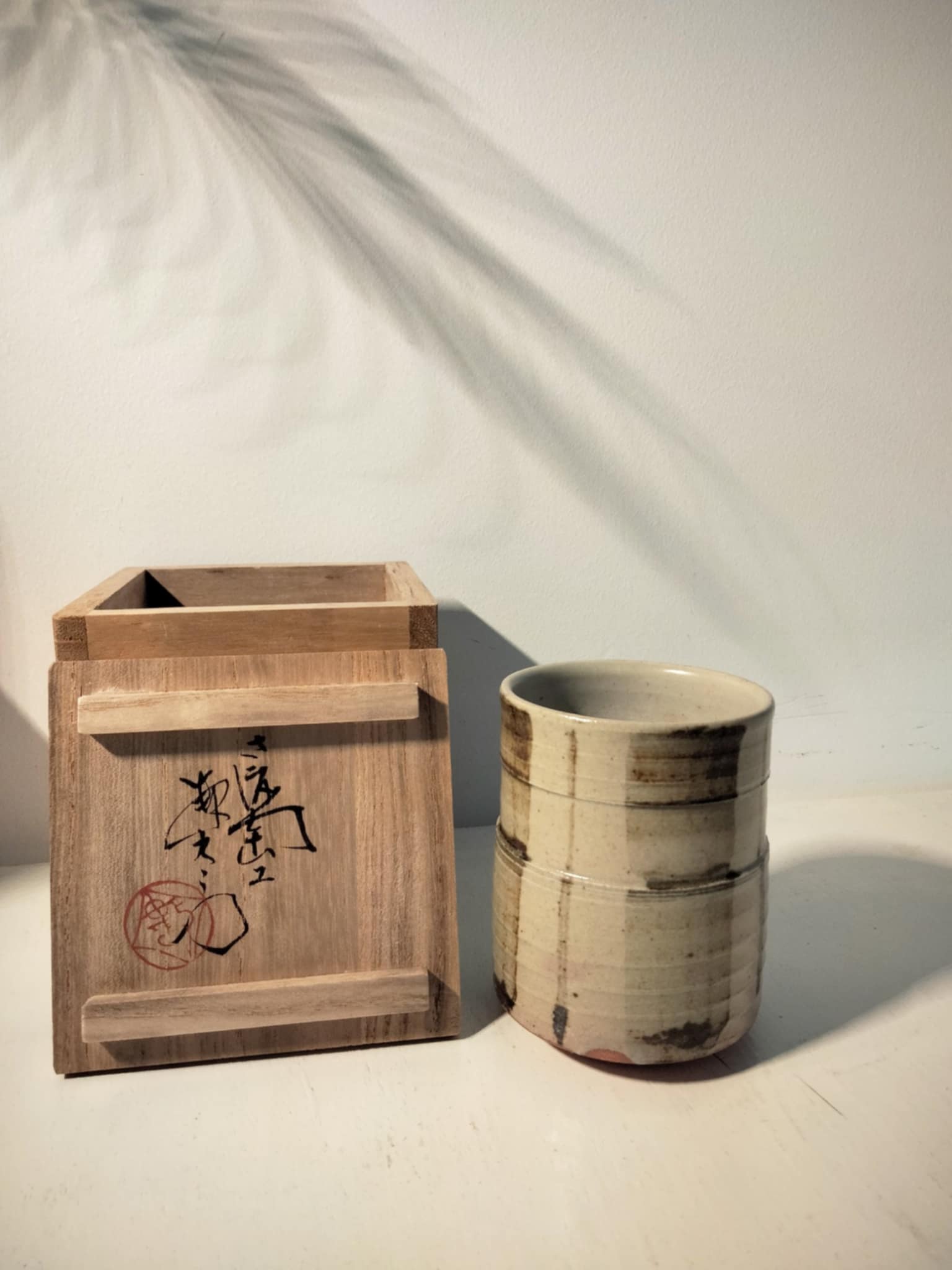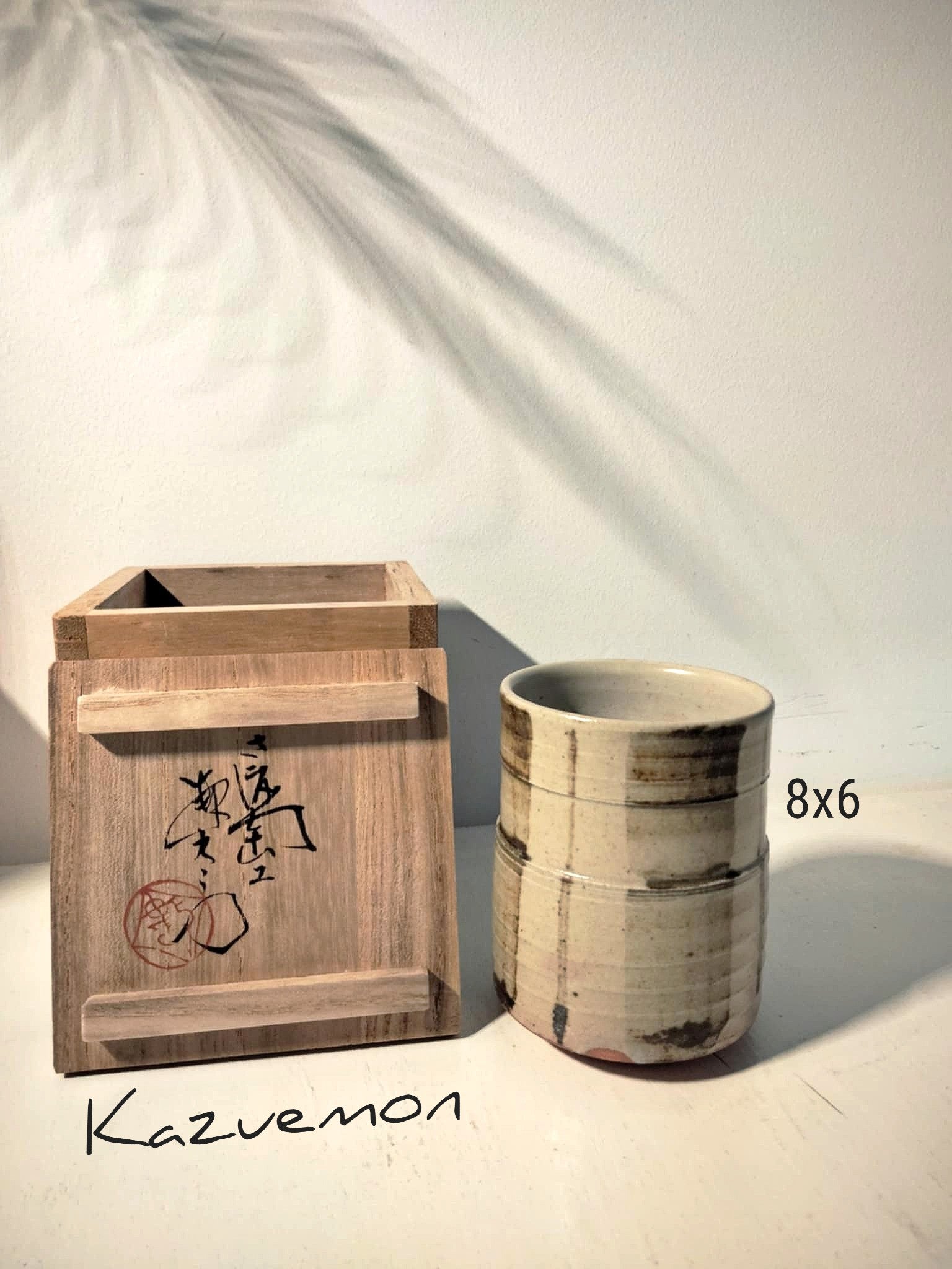 Magnifique petit pot à thé, vintage ( années 70 ) par Nagahama Kazuyoshi (b.1920) . Livré dans sa boîte avec notice, biographie et description du style Mumyoi-ware yunomi . D'une grande finesse, signé... 8cm, Ø 6 cm.