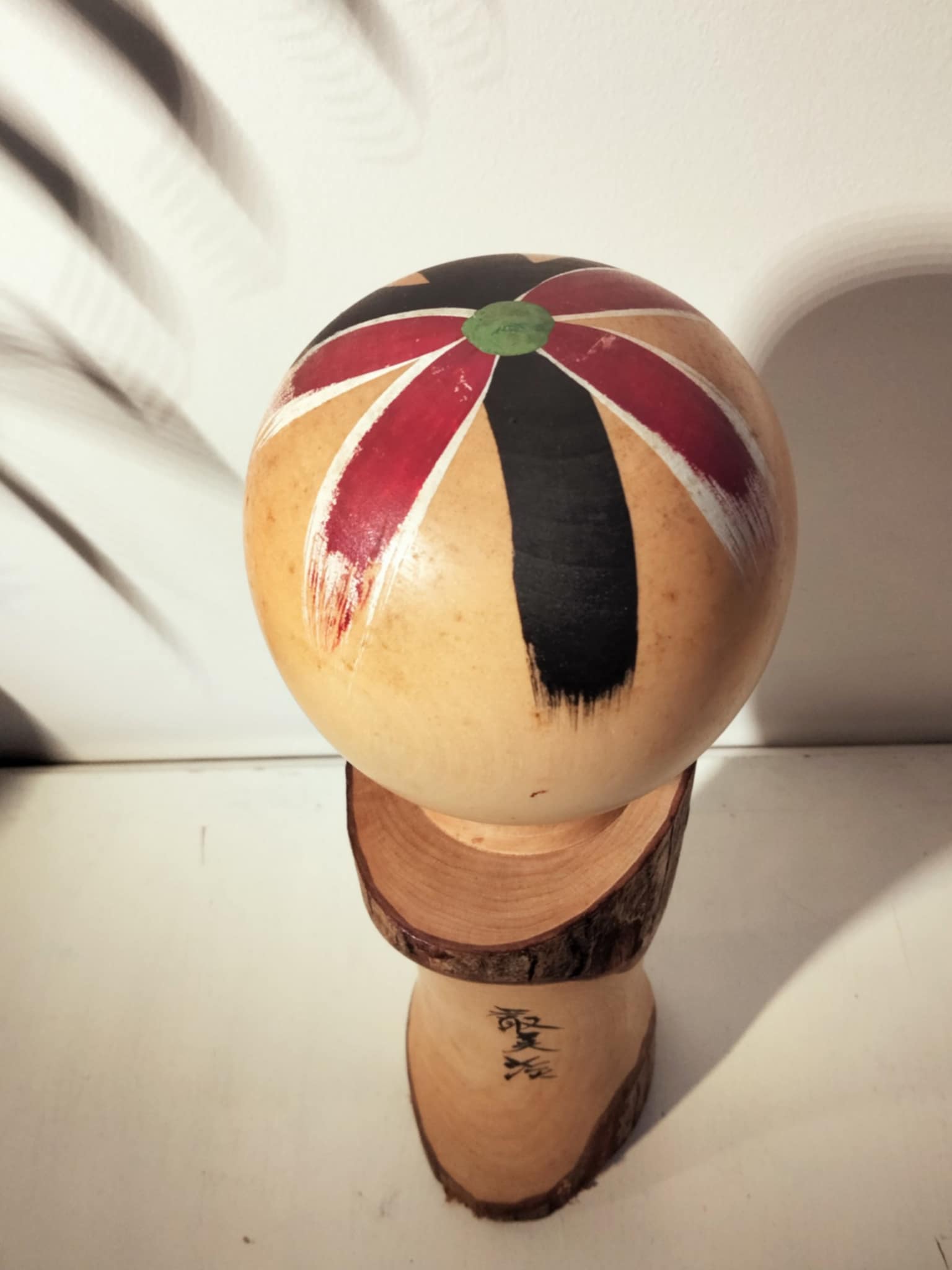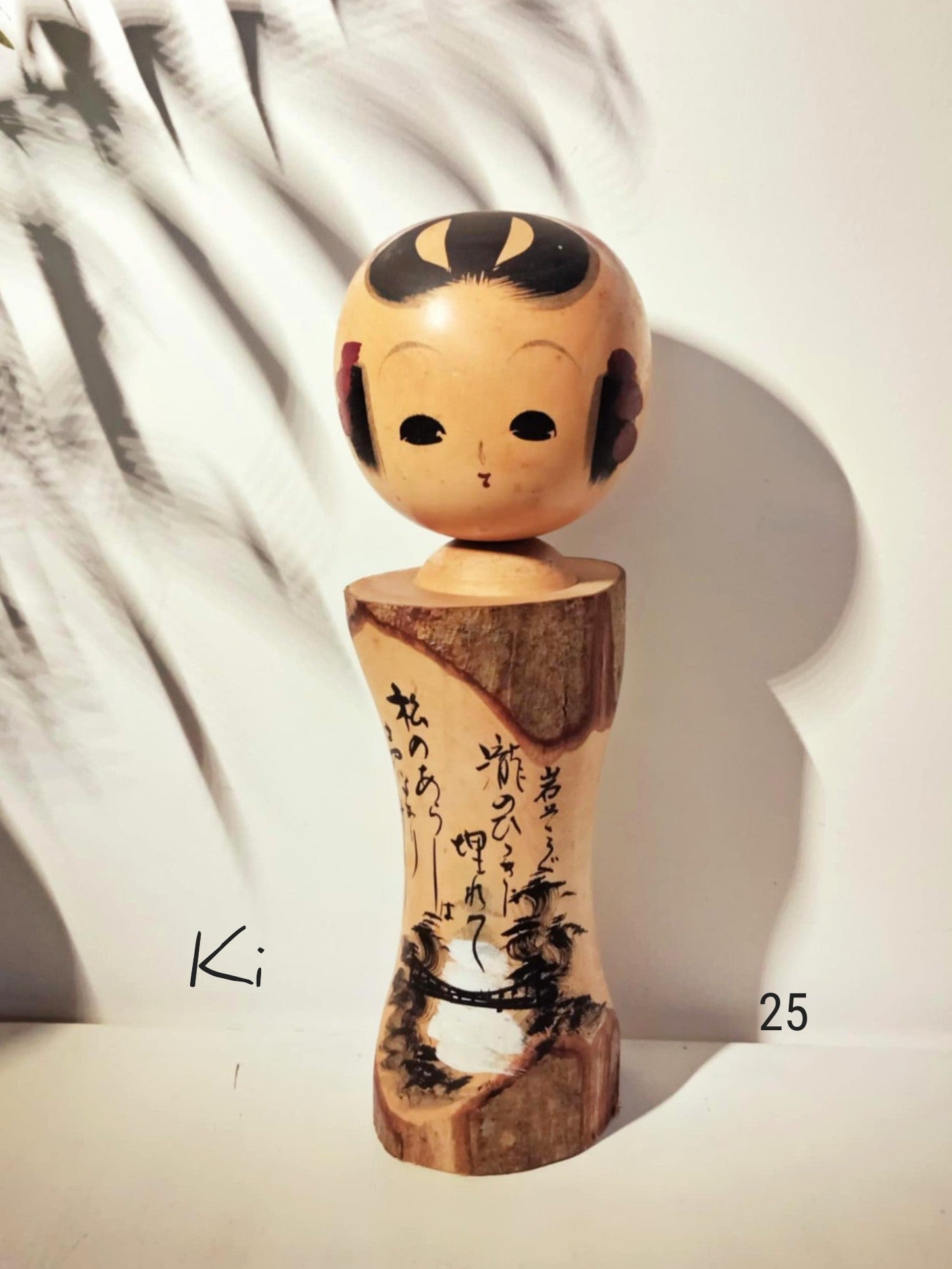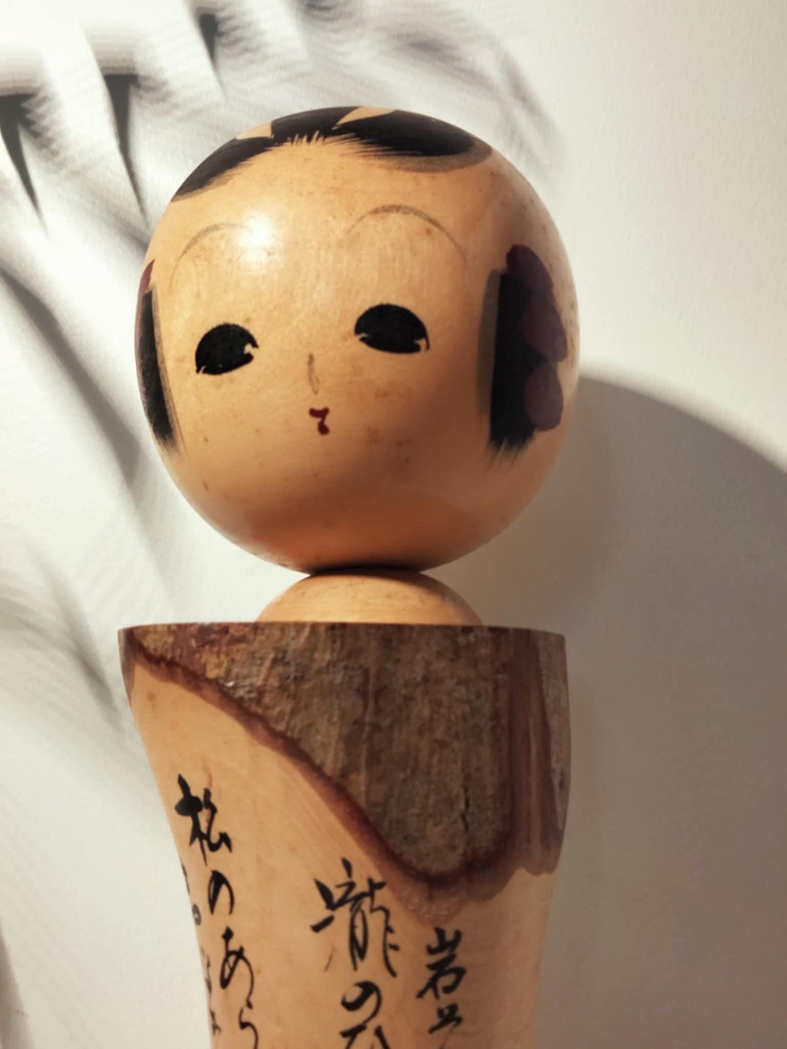 Kokeshi sosaku vintage, dont l'écorce est encore présente, et , comme souvent, dépeignant un site naturel, célèbre... Hauteur 25 cm, Années 80.
