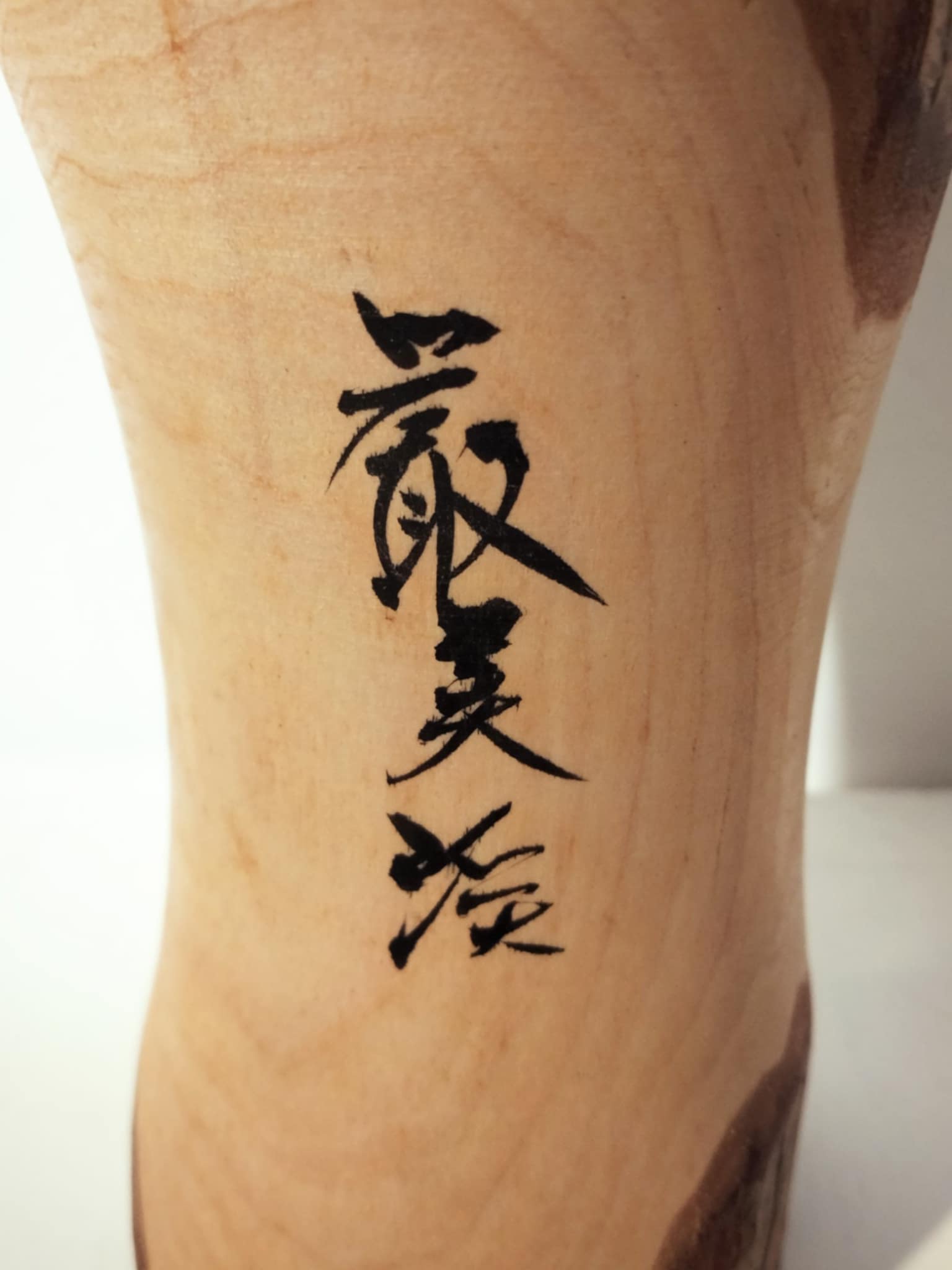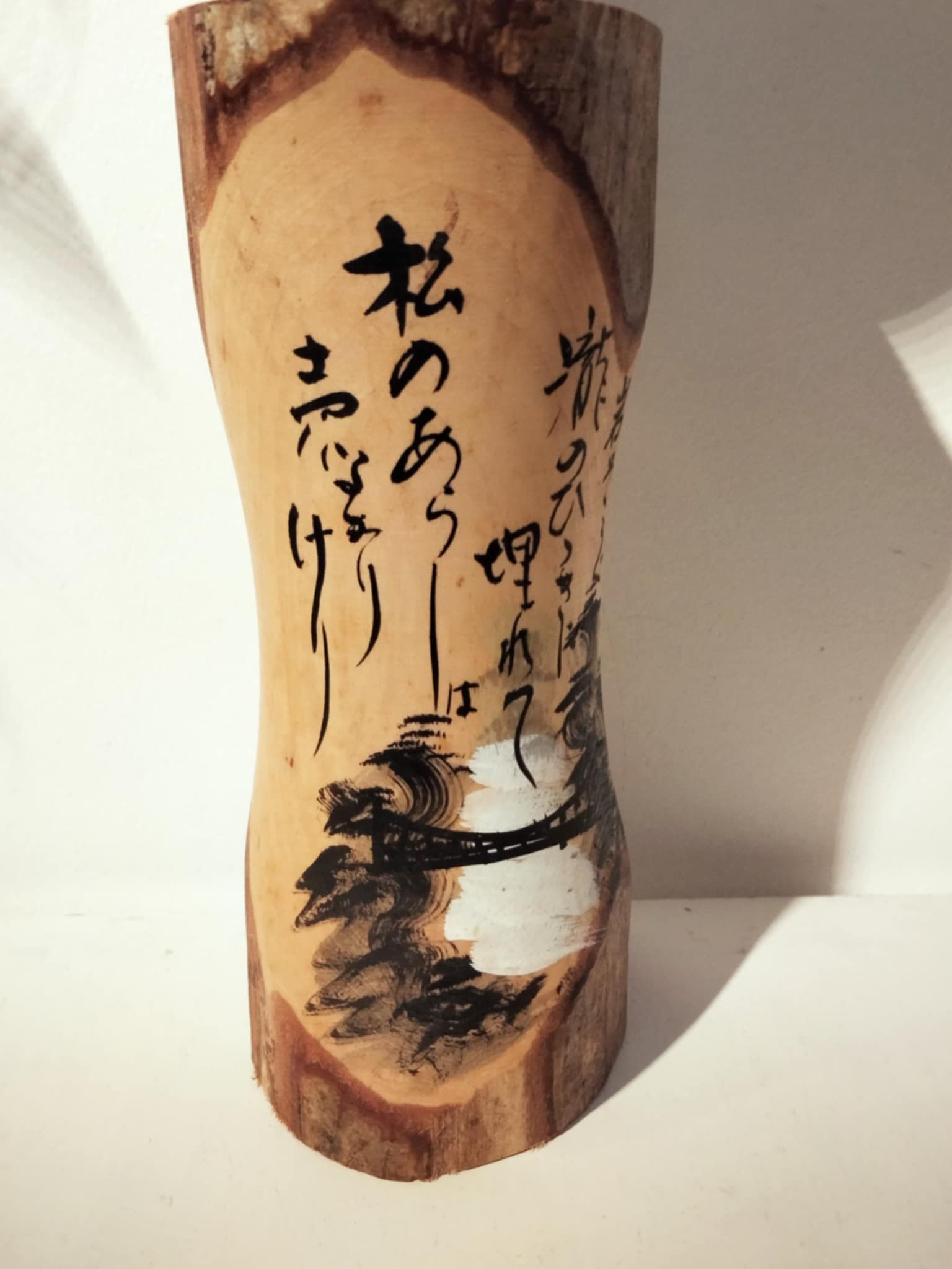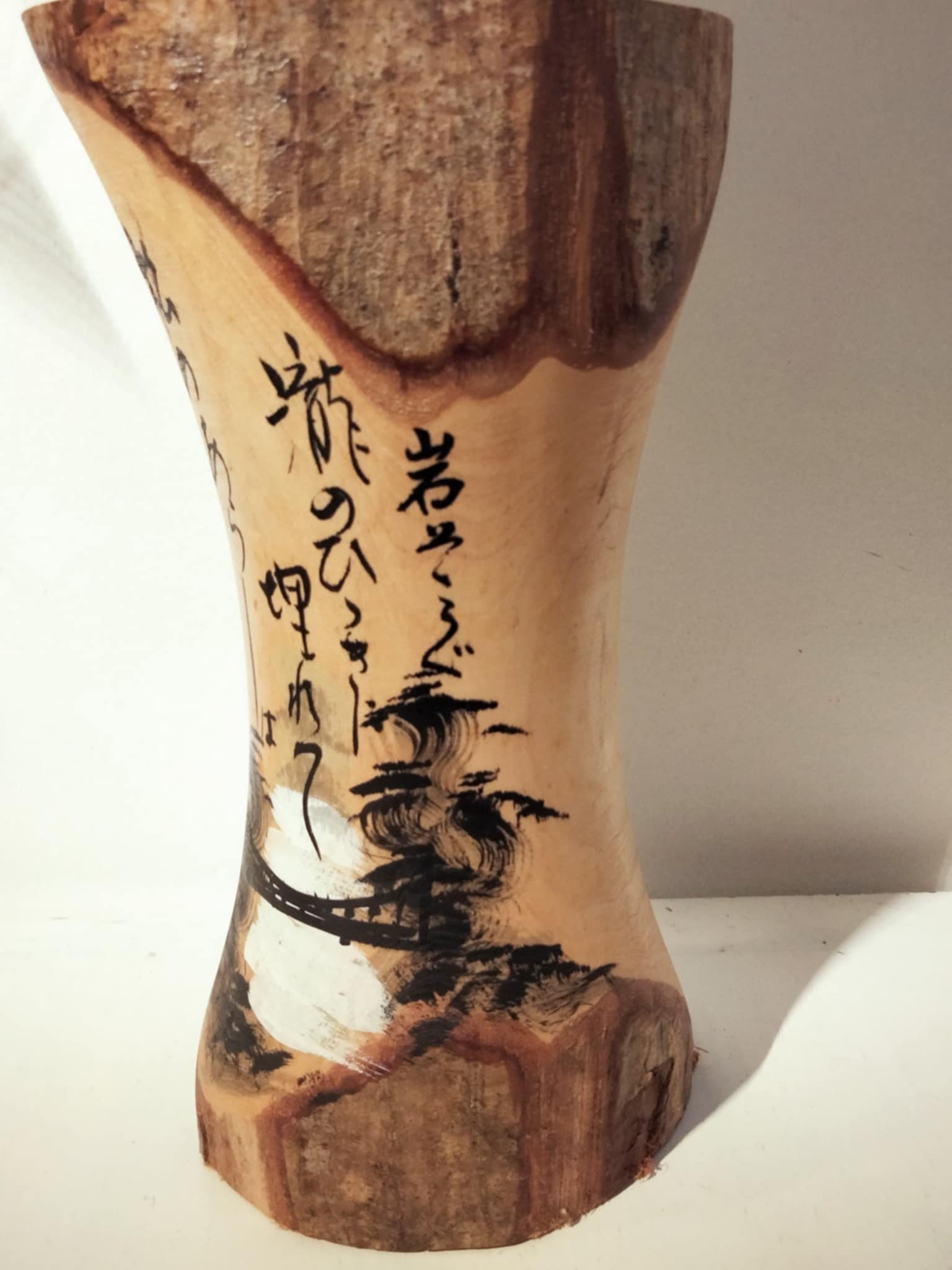 Kokeshi sosaku vintage, dont l'écorce est encore présente, et , comme souvent, dépeignant un site naturel, célèbre... Hauteur 25 cm, Années 80.
