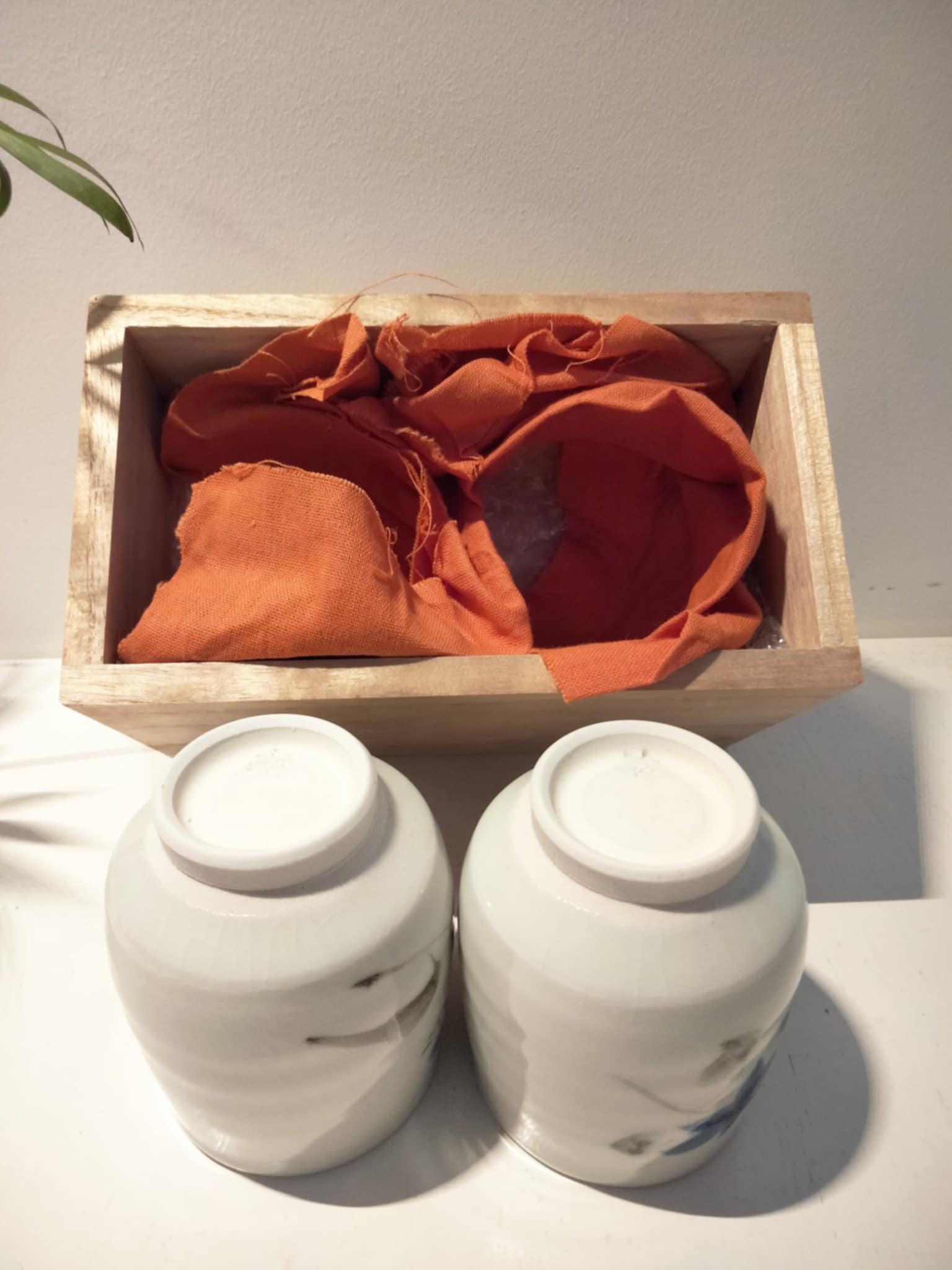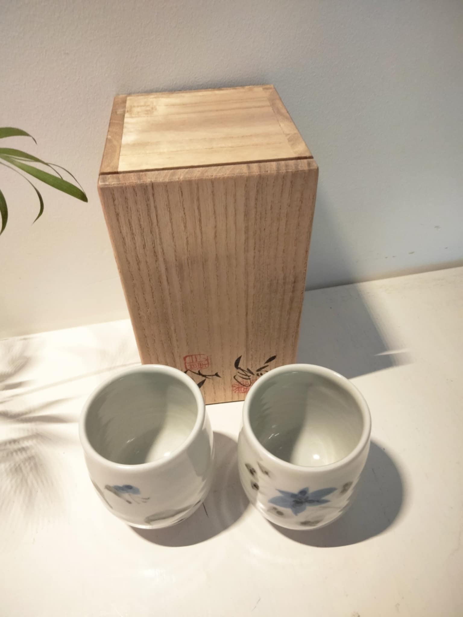 Deux tasses à thé en céramique, vintage, non utilisées , dans leur boîte d'origine . Hauteur 8cm, Ø 6cm.