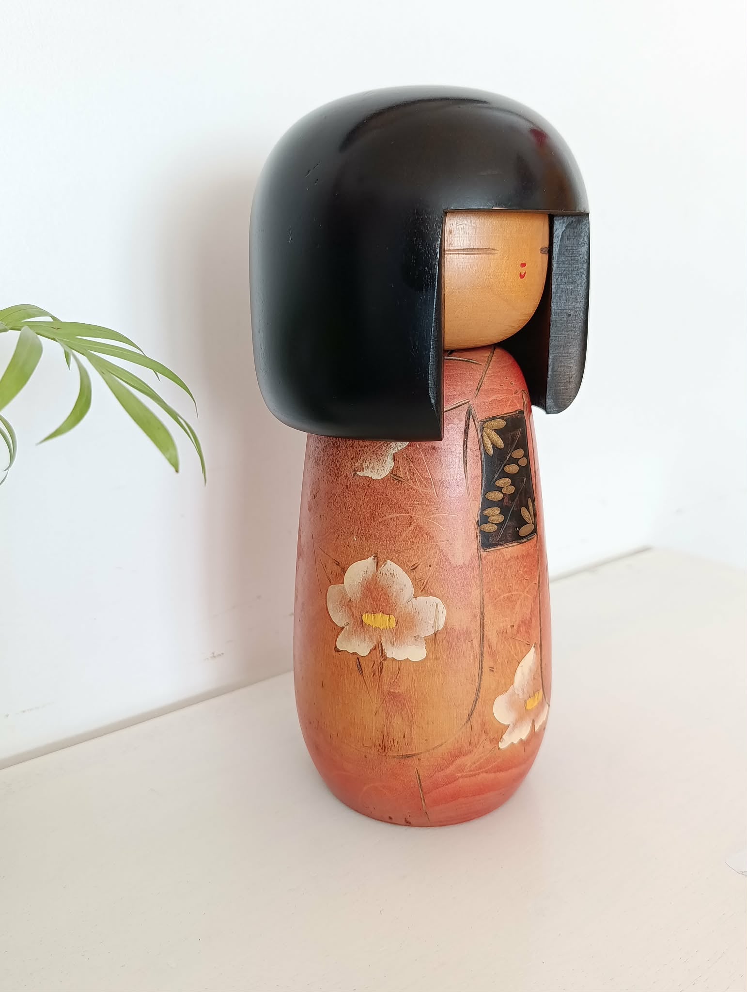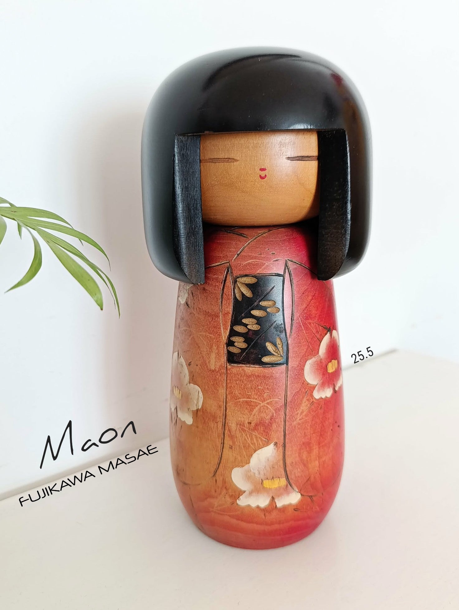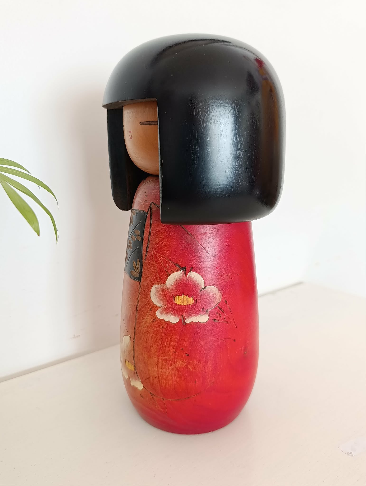 Imposante kokeshi Gumma vintage ( 25.5 cm 1kg 040 ), par Fujikawa Masae (1942-2015) . Superbe contraste entre chevelure et kimono aux fleurs de prunier symbole de courage dans les circonstances difficiles et espoir, lié au souvenir, de temps meilleurs... Années 90.