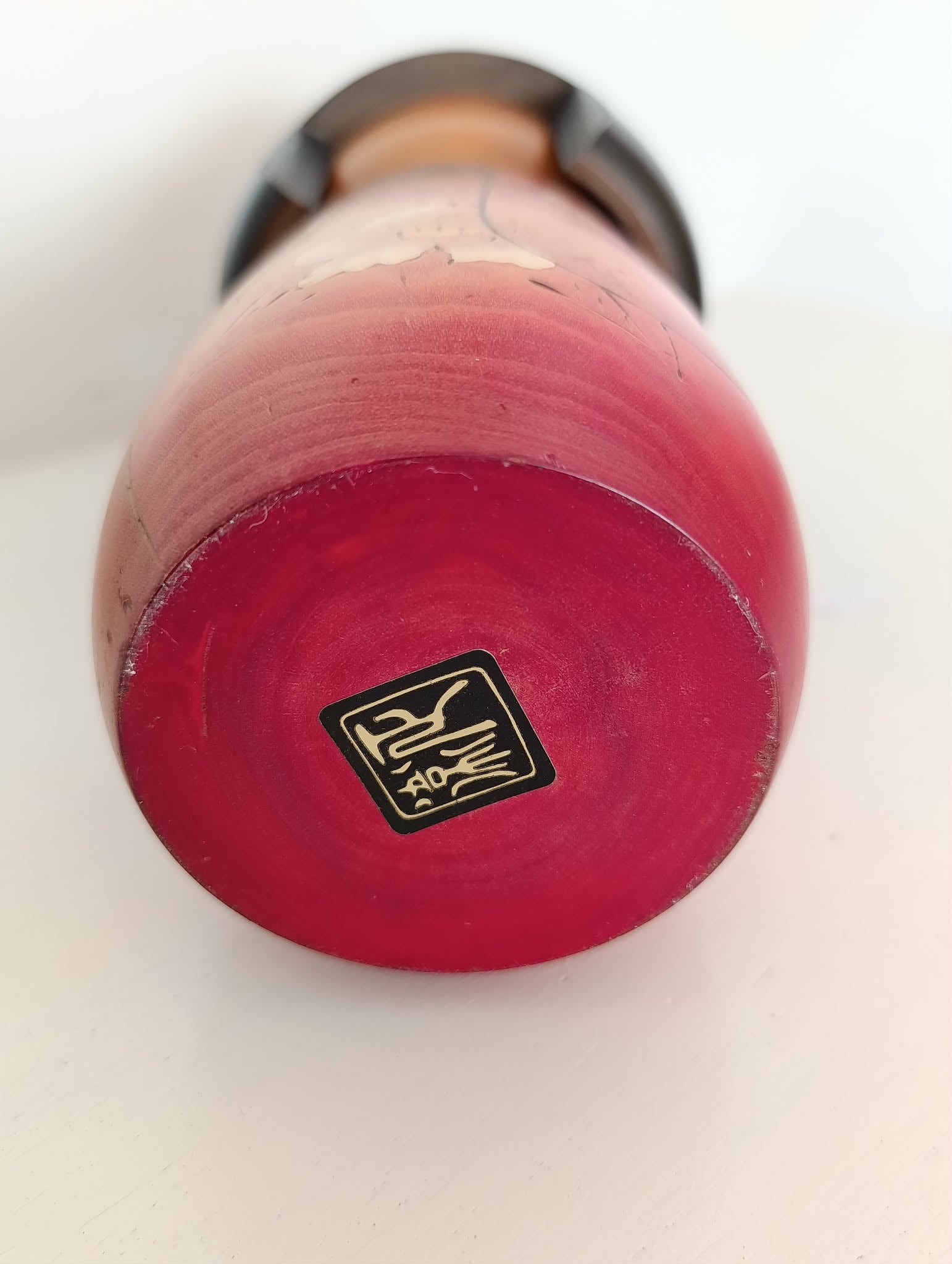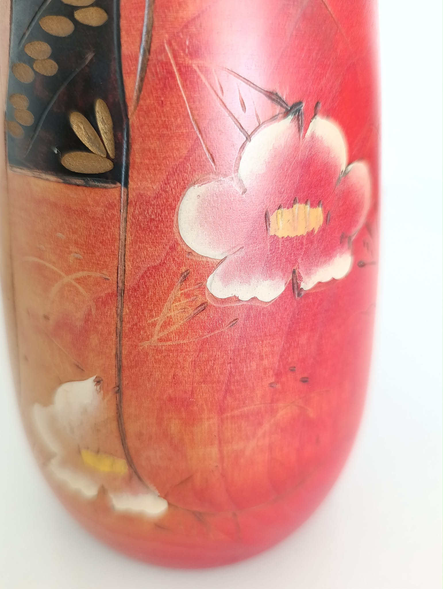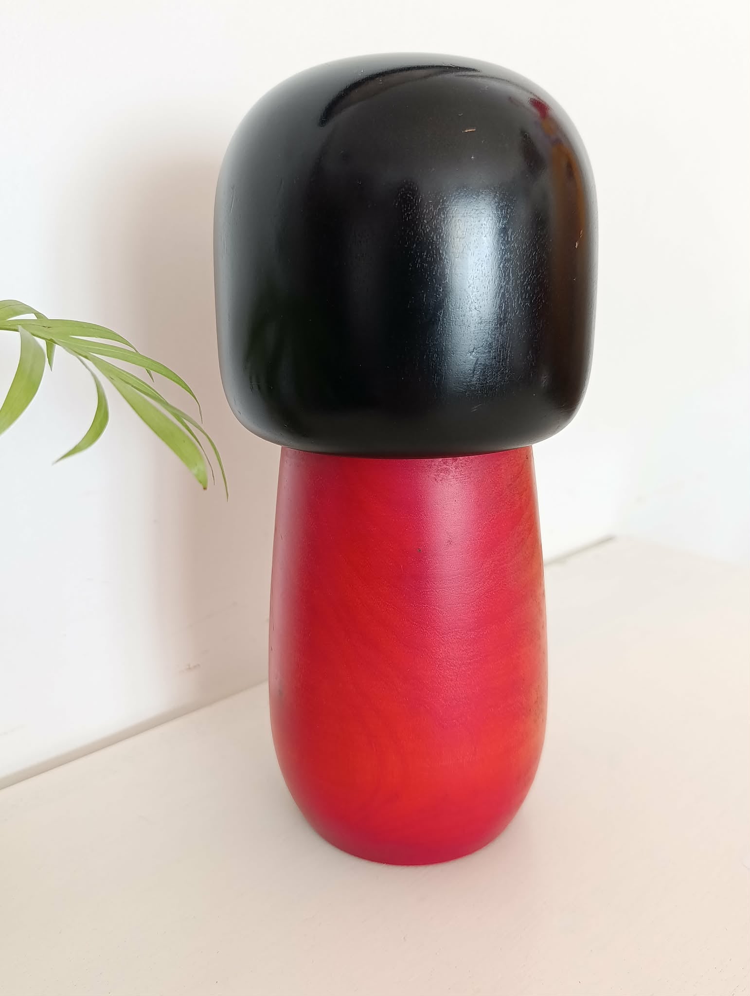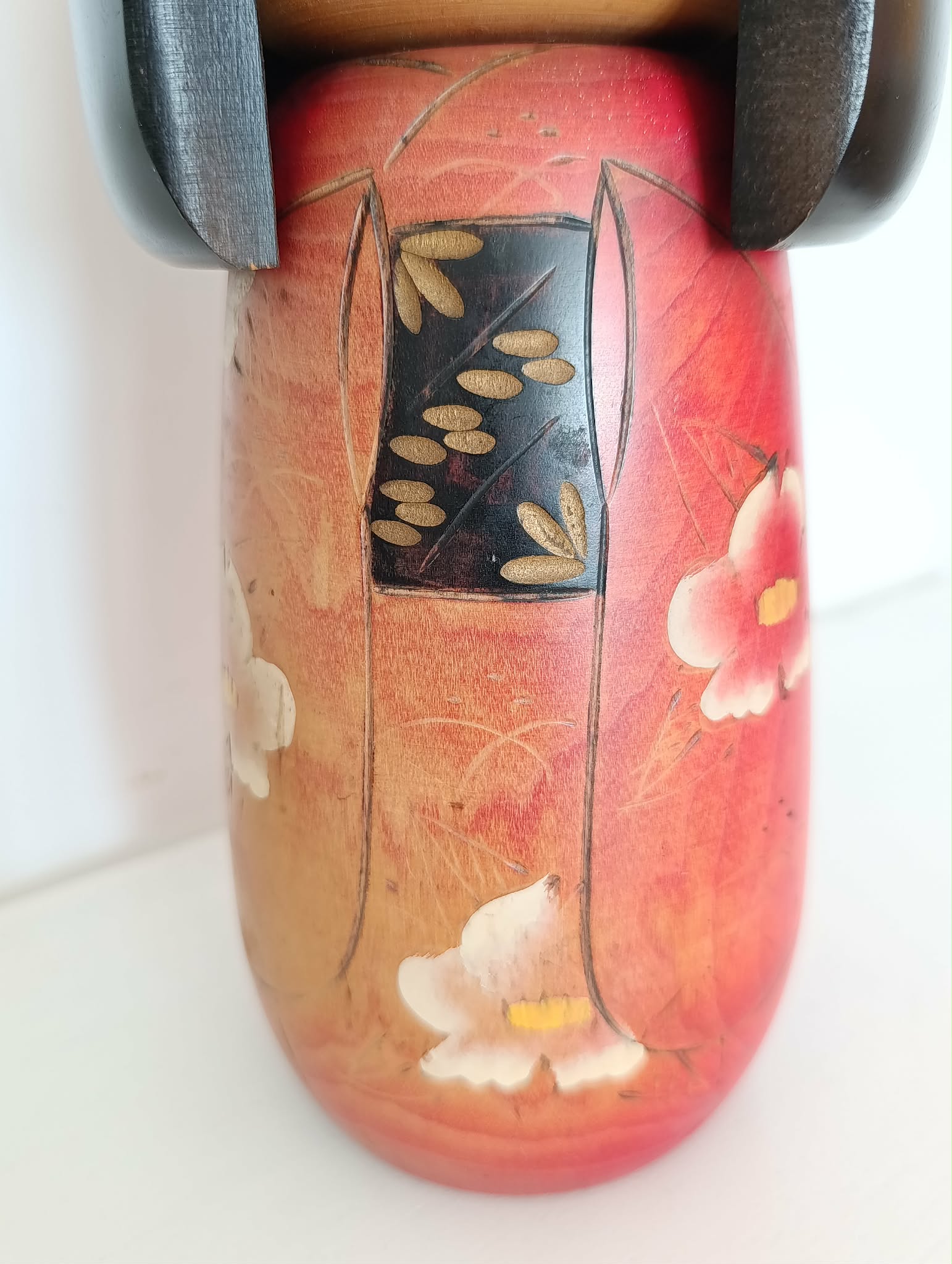 Imposante kokeshi Gumma vintage ( 25.5 cm 1kg 040 ), par Fujikawa Masae (1942-2015) . Superbe contraste entre chevelure et kimono aux fleurs de prunier symbole de courage dans les circonstances difficiles et espoir, lié au souvenir, de temps meilleurs... Années 90.