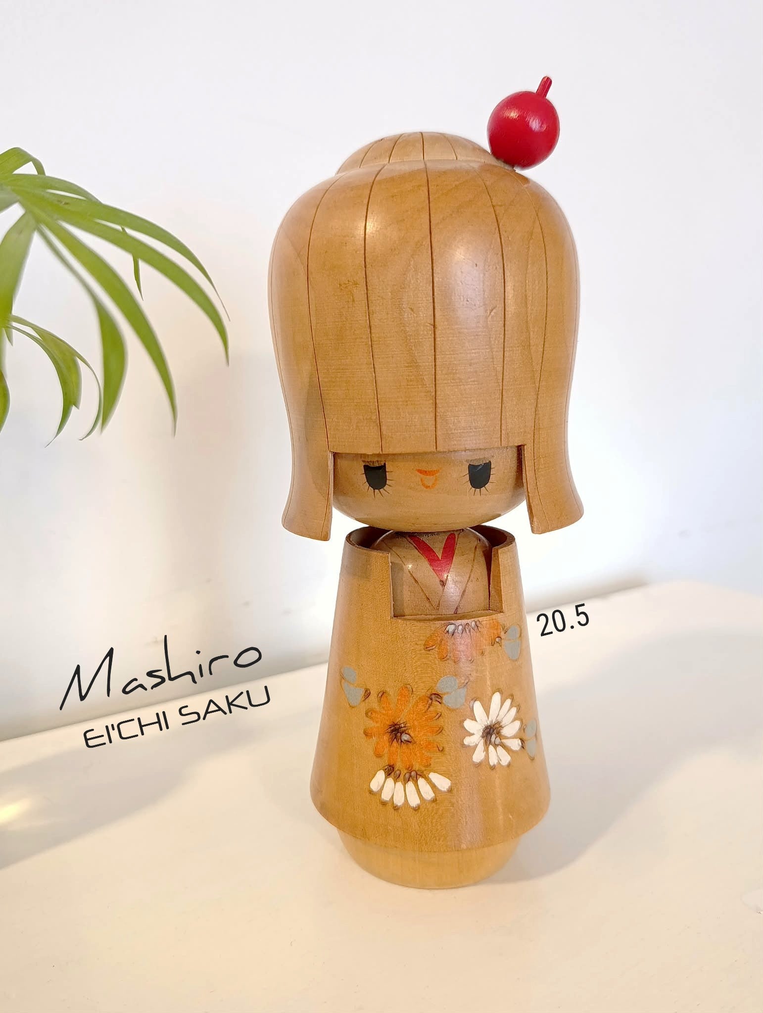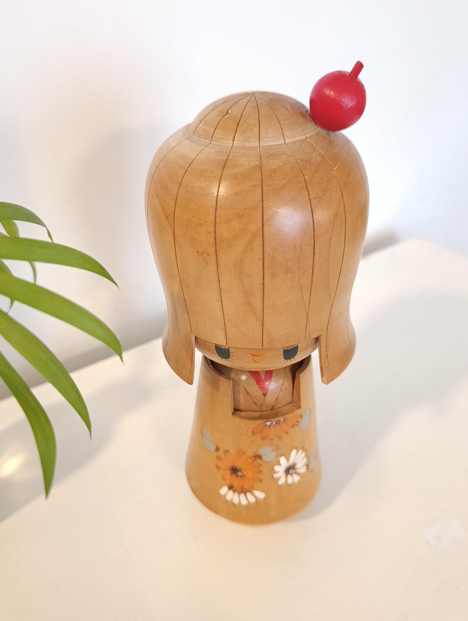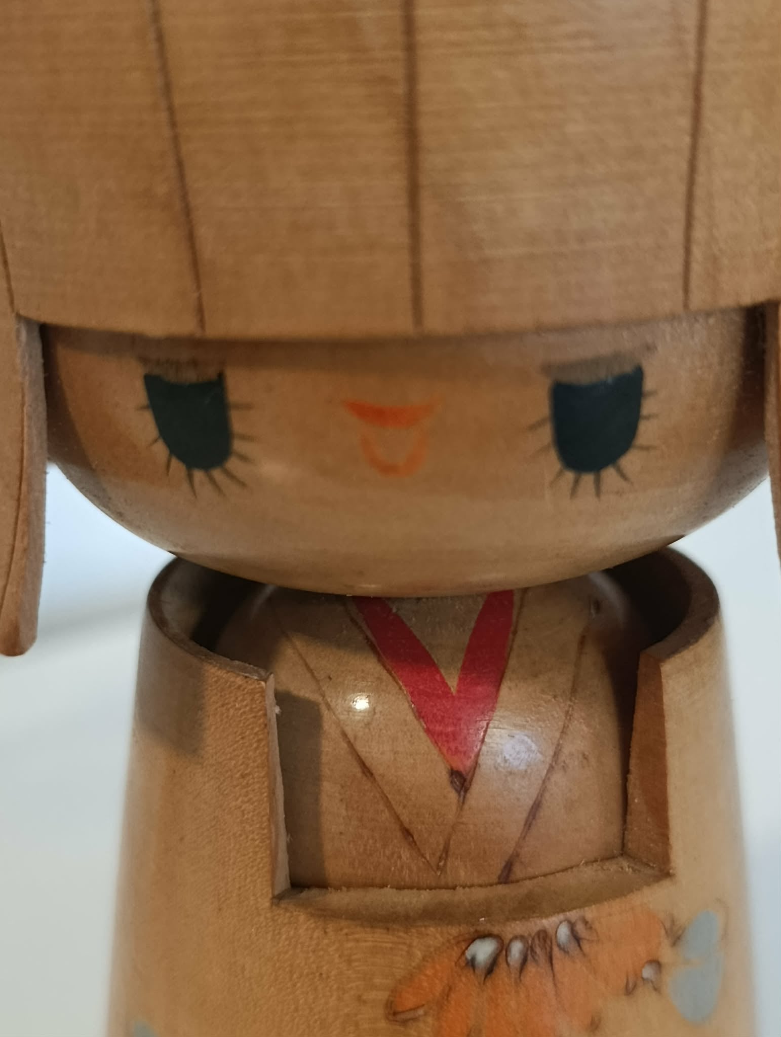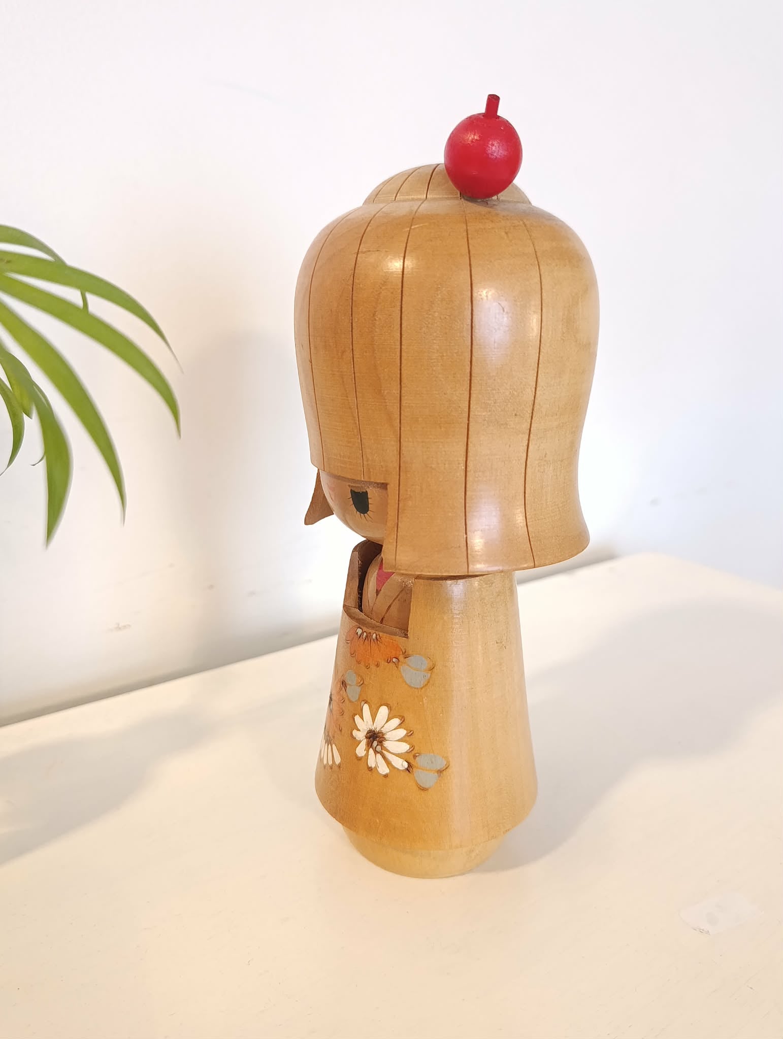 Kokeshi sosaku vintage, par Eic'hi Saku. Finement sculptée cette jolie poupée à la chevelure blonde bien dessinée , aux grands yeux naifs, est une beauté... Hauteur 20.5 cm, années 70.