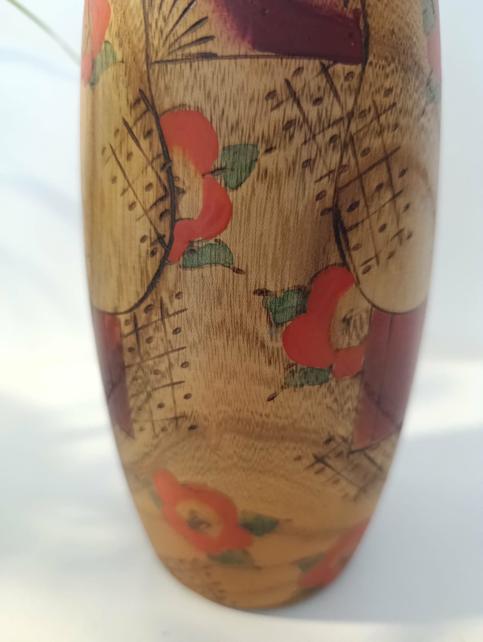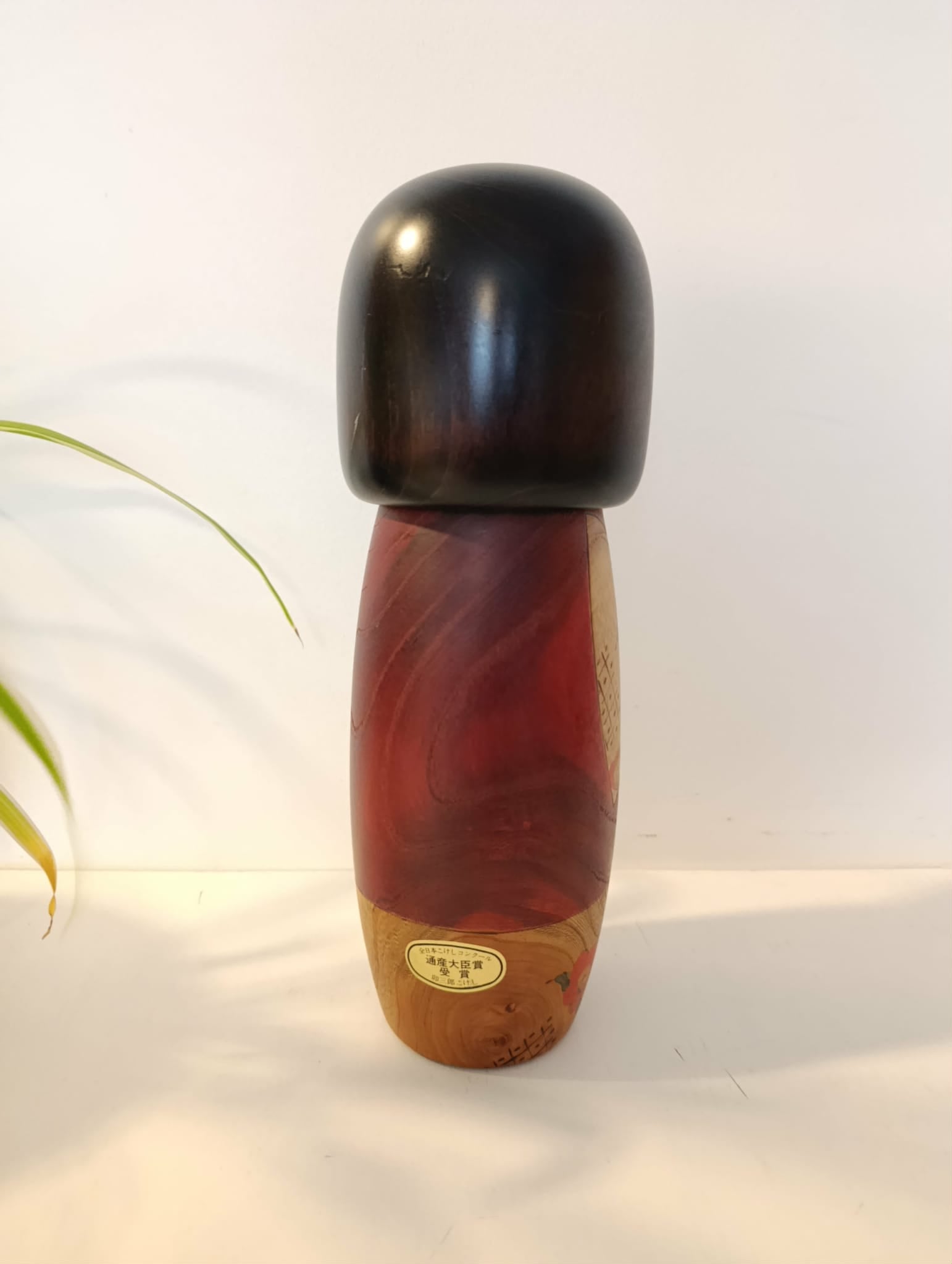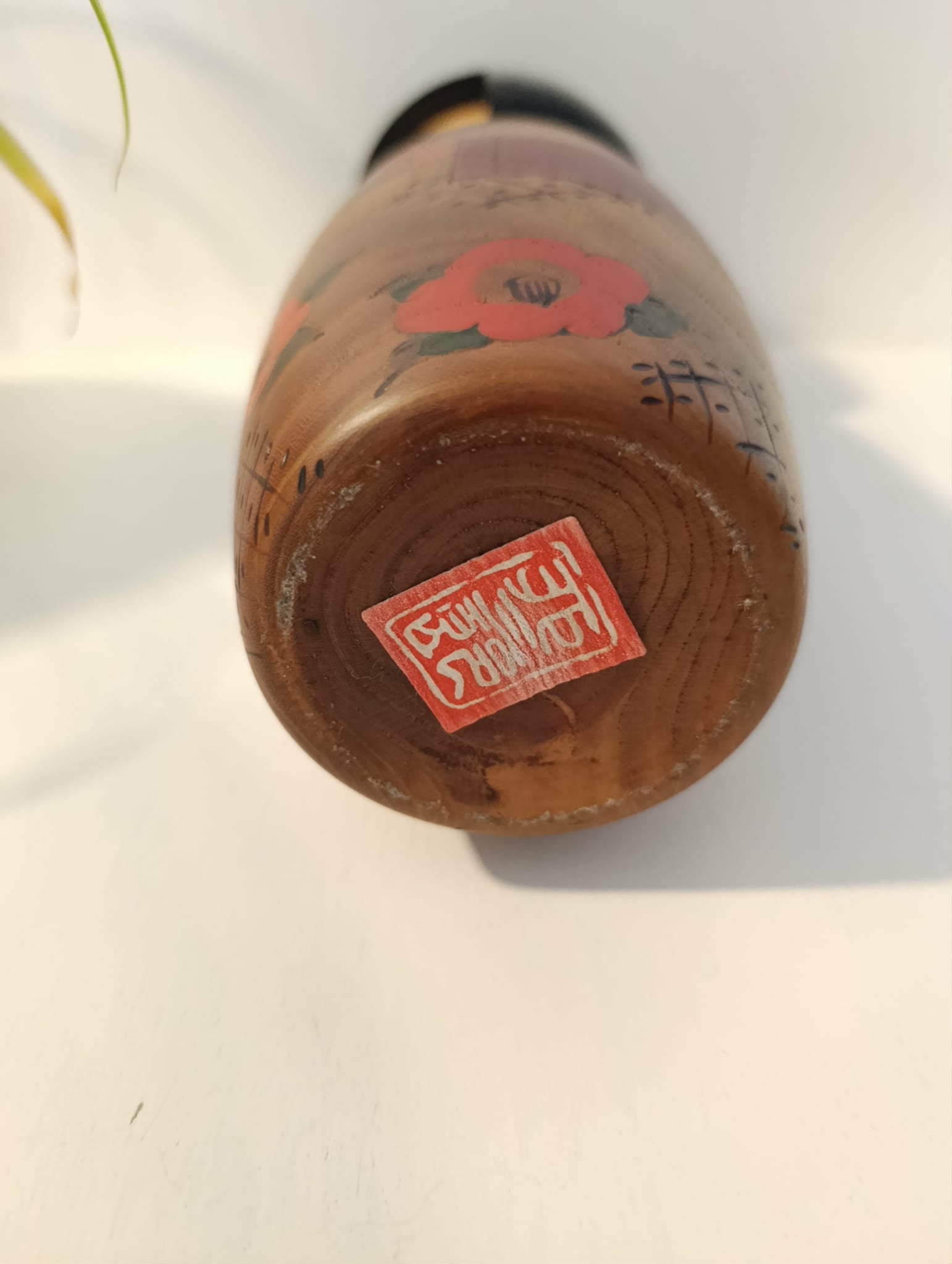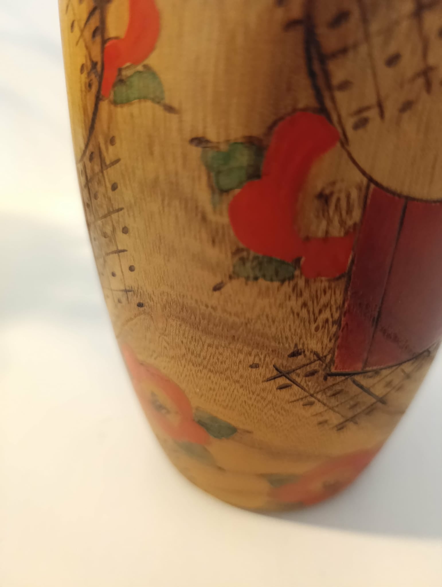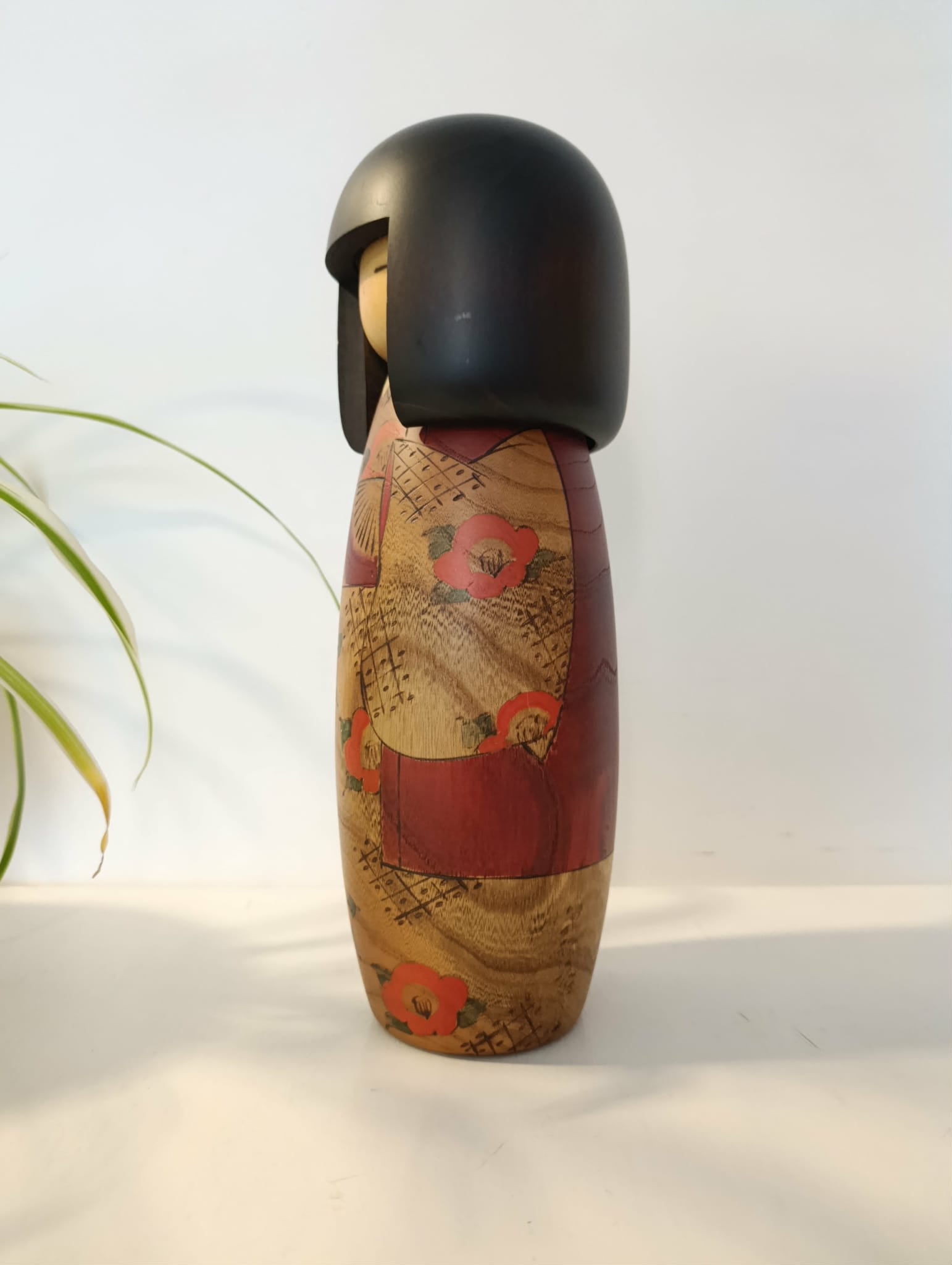 Grande et imposante (30cm 1kg 300) Gumma vintage, par Usaburo . Réussite totale pour cette kokeshi au superbe kimono pyrogravé et fleuri ( Camélias) . Années 80/90.