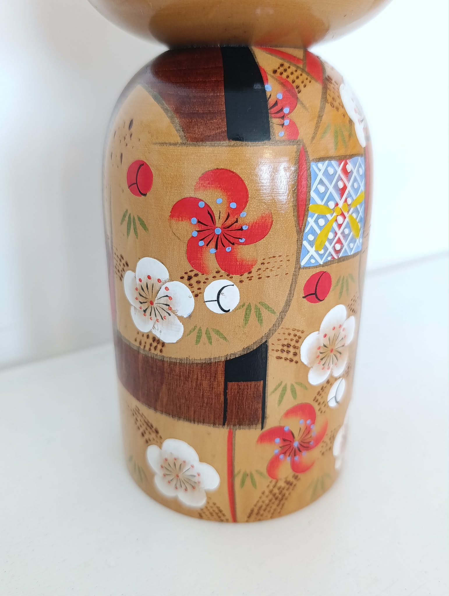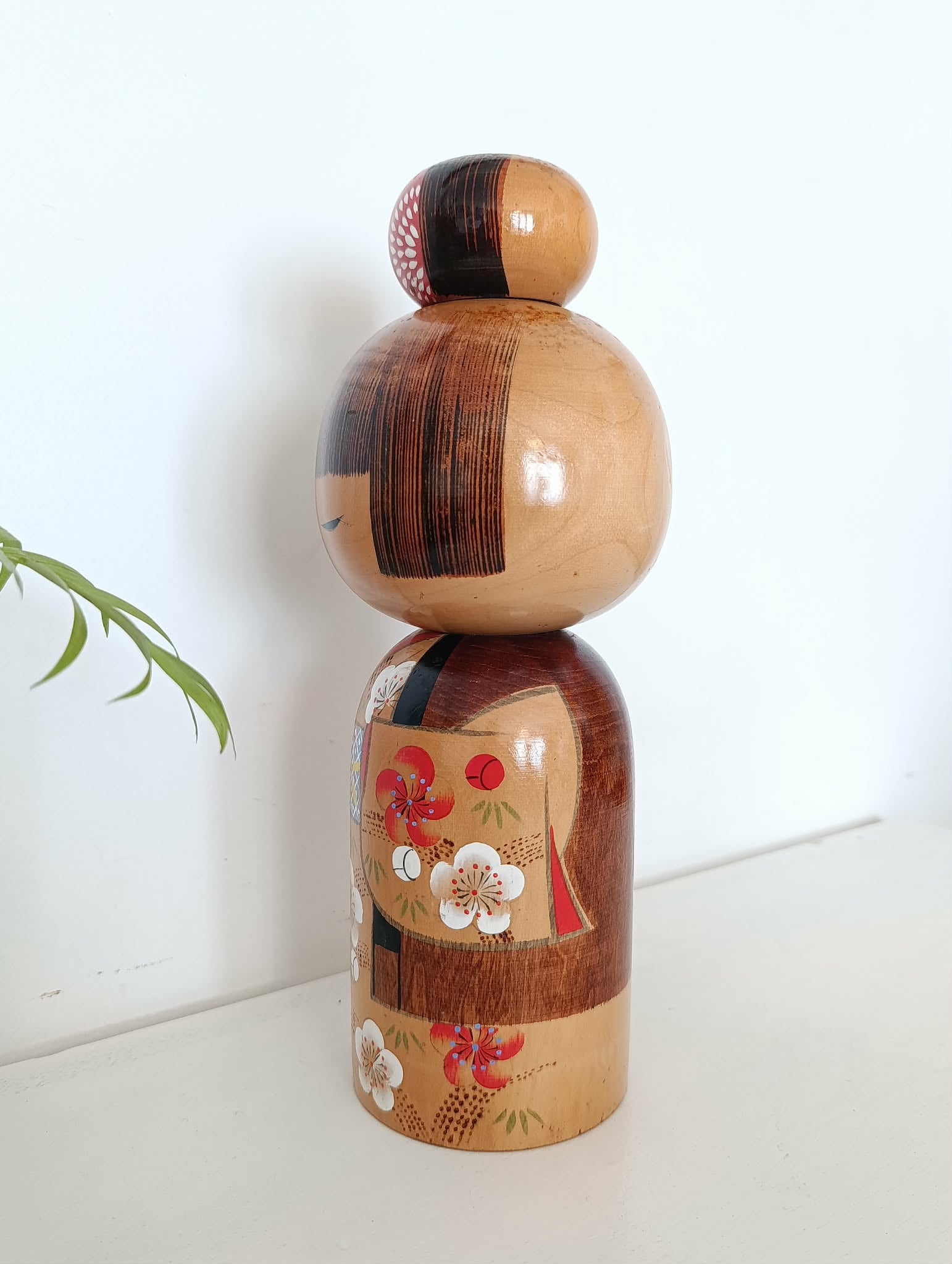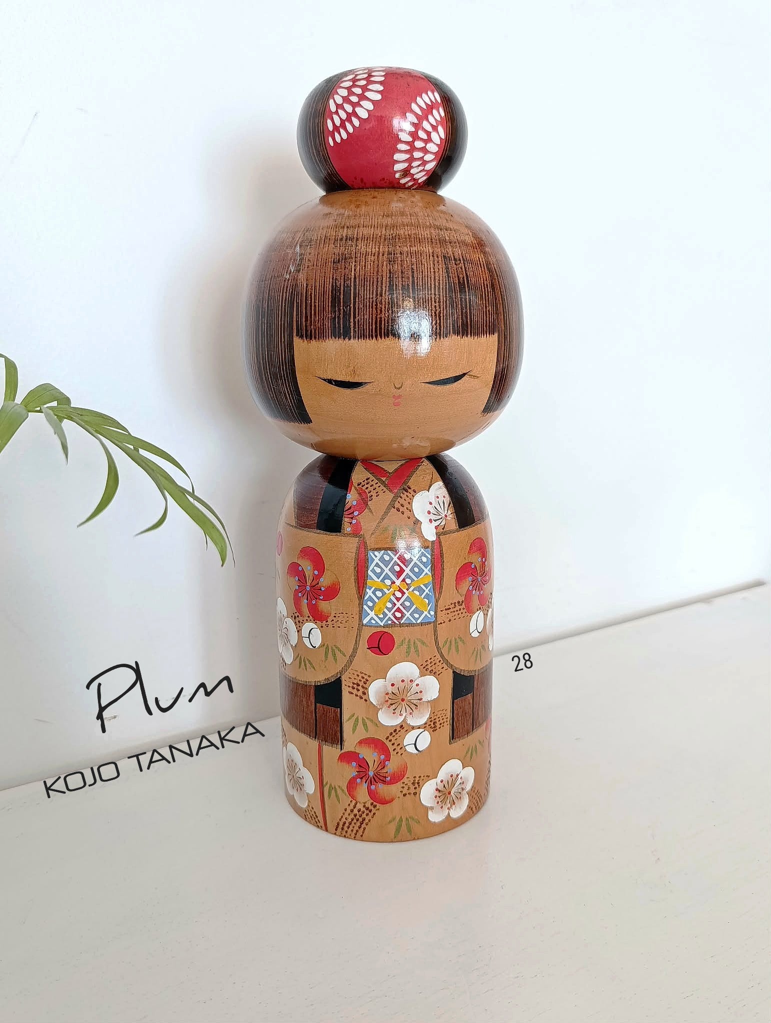 Imposante kokeshi sosaku par Kojo Tanaka . Superbe et célèbre kimono aux fleurs de prunier sous un beau laquage de grande qualité . Prête pour l'adoption . Hauteur 28 cm, années 70/80.
