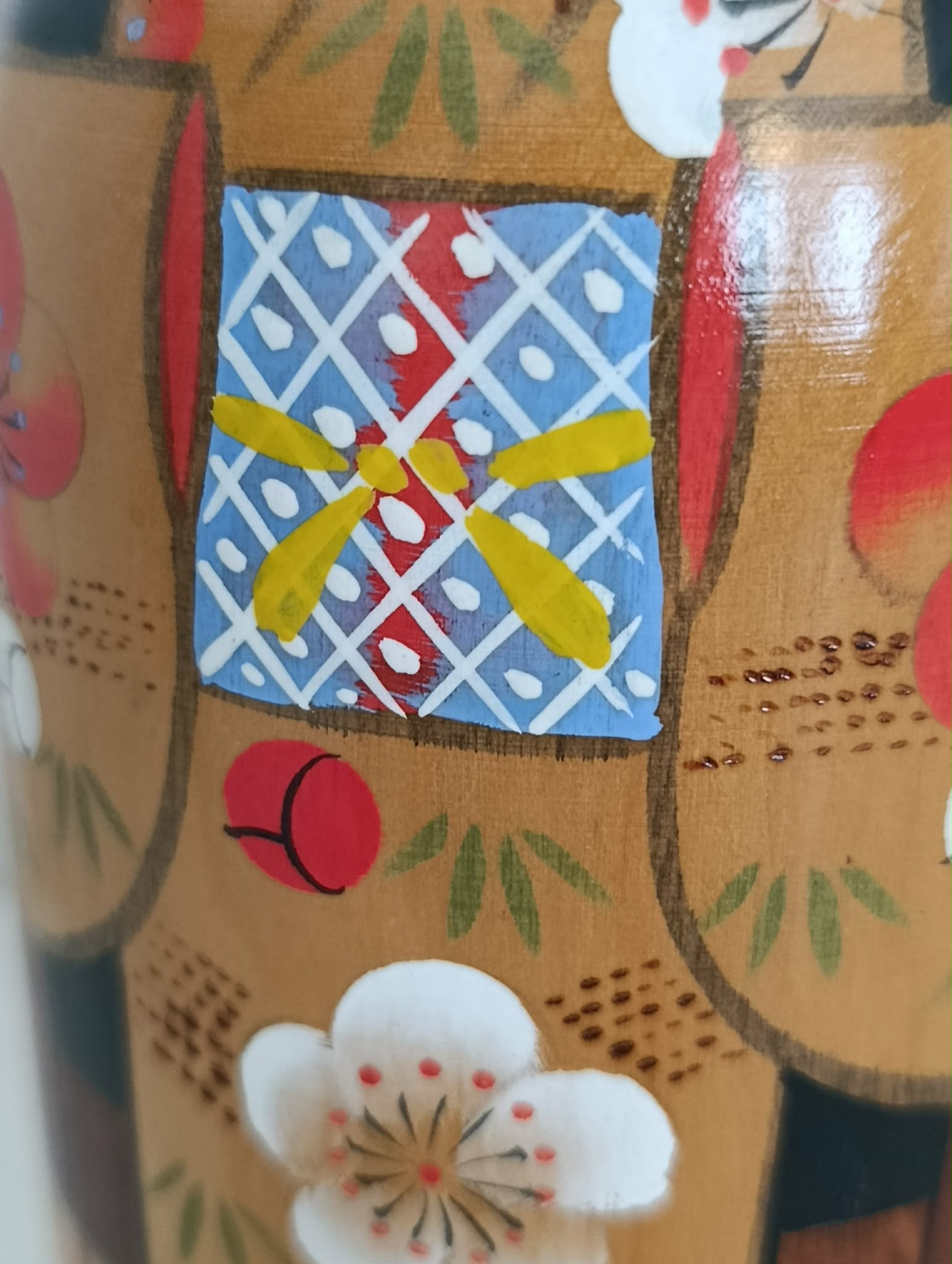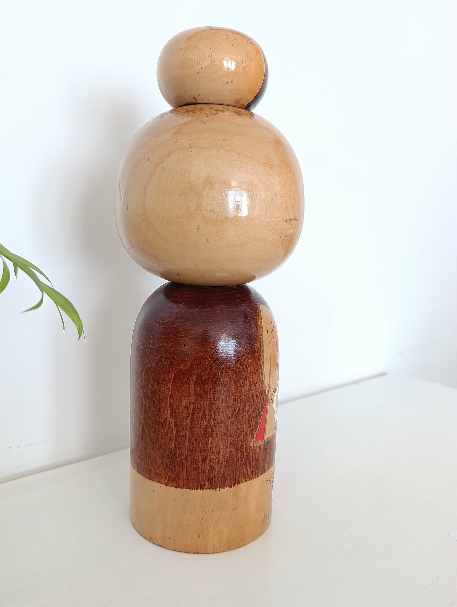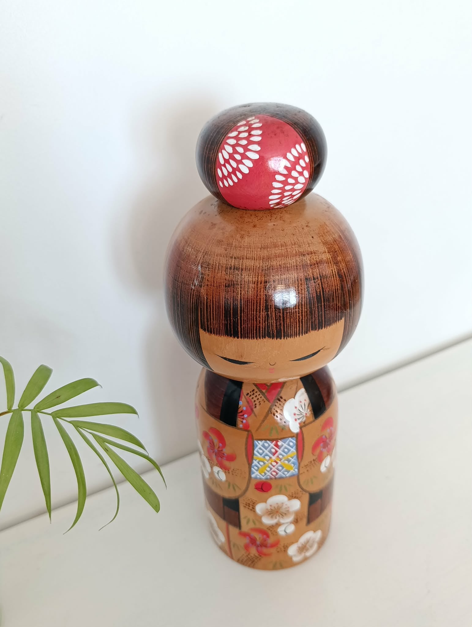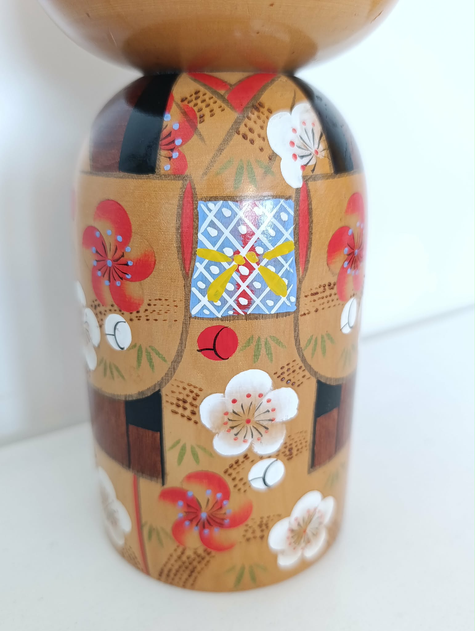 Imposante kokeshi sosaku par Kojo Tanaka . Superbe et célèbre kimono aux fleurs de prunier sous un beau laquage de grande qualité . Prête pour l'adoption . Hauteur 28 cm, années 70/80.