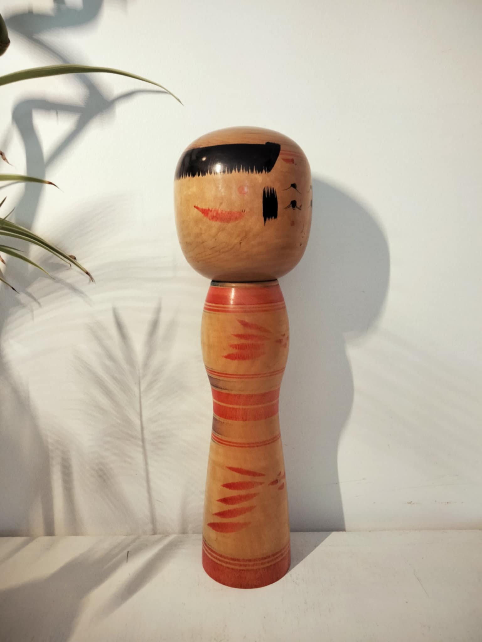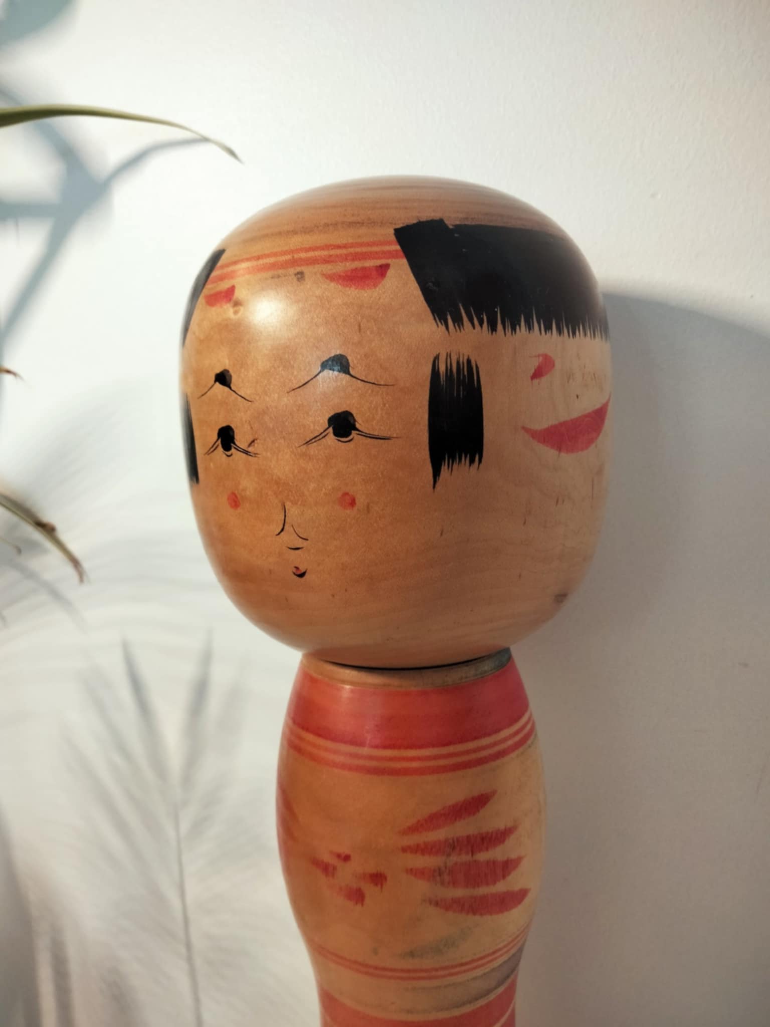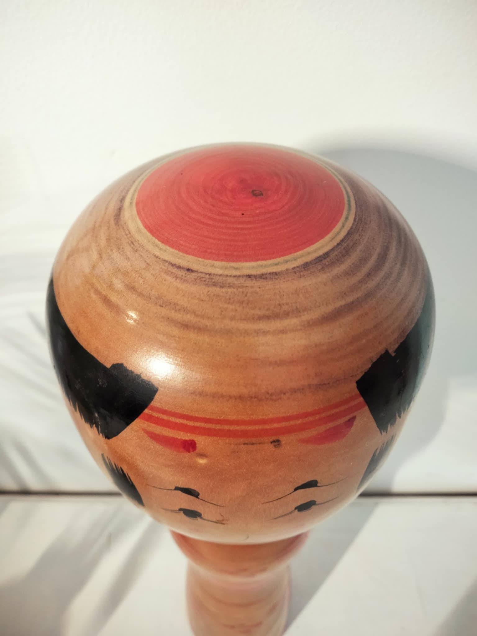 Kokeshi yajiro ancienne, par Oizumi Kiyomi ( 1936-1980 ) . Une grande classique, mais le finesse et la particularité des yeux en font une pièce atypique.... Hauteur 30 cm, années 60/70.