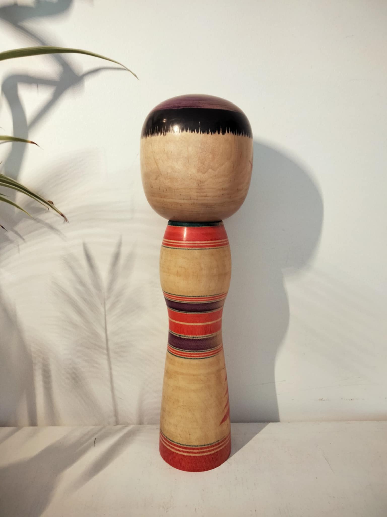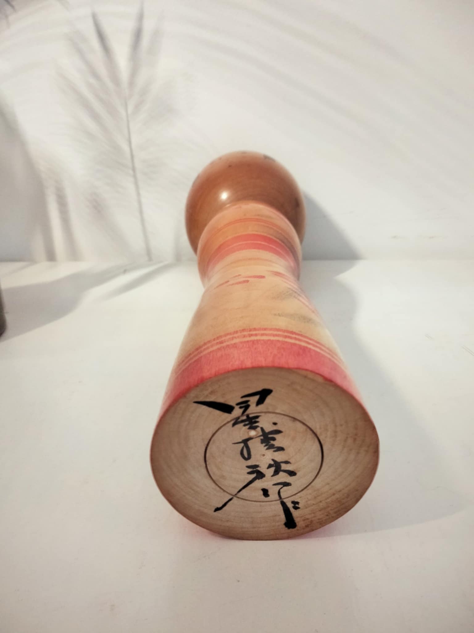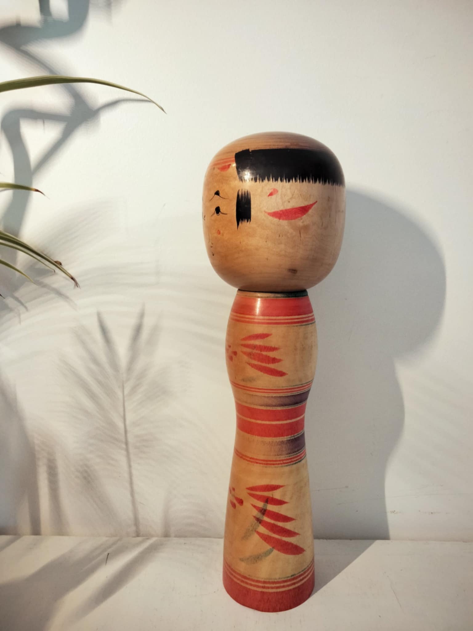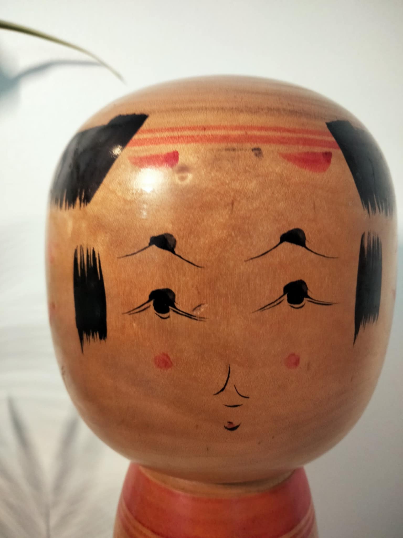 Kokeshi yajiro ancienne, par Oizumi Kiyomi ( 1936-1980 ) . Une grande classique, mais le finesse et la particularité des yeux en font une pièce atypique.... Hauteur 30 cm, années 60/70.