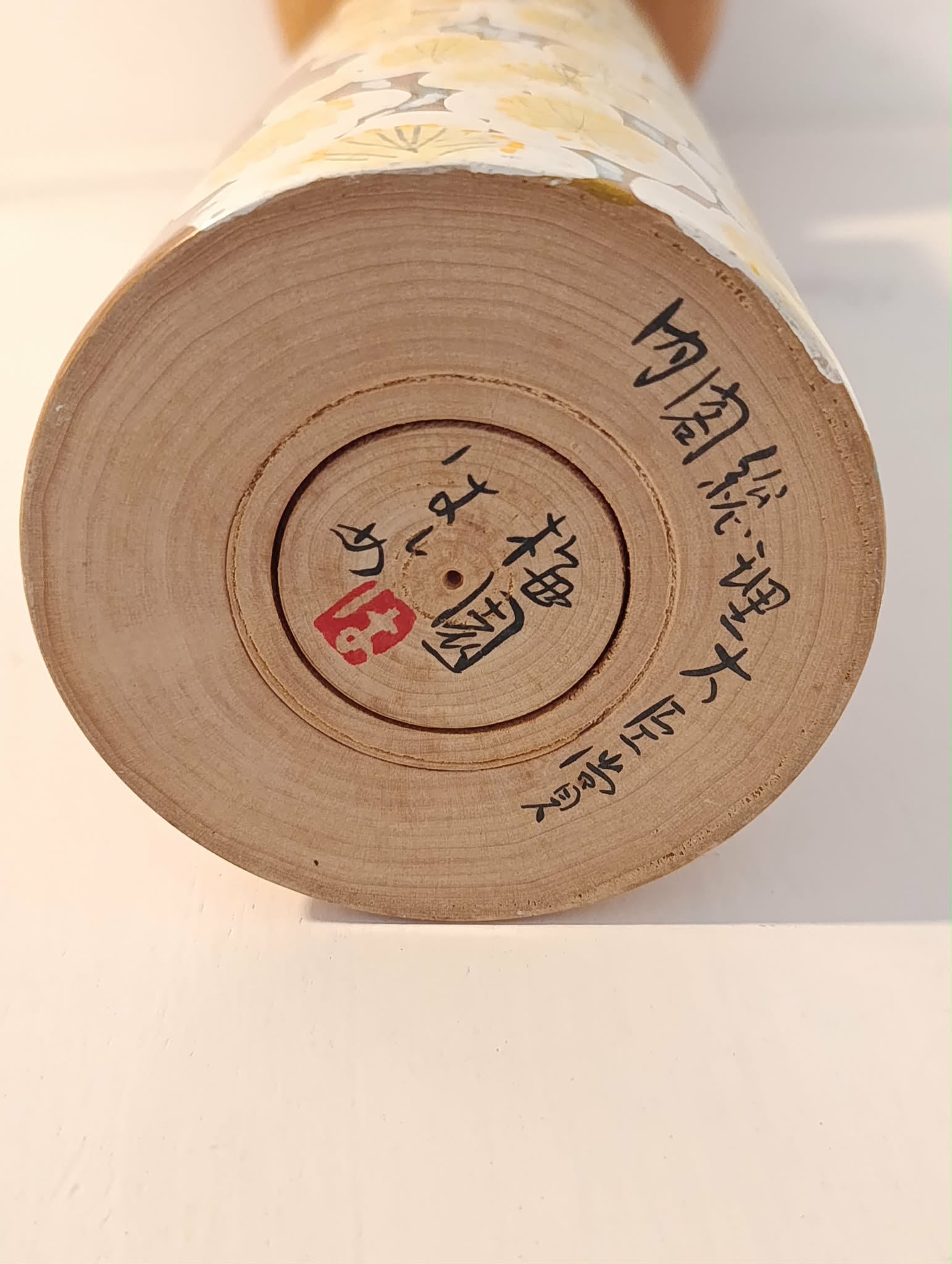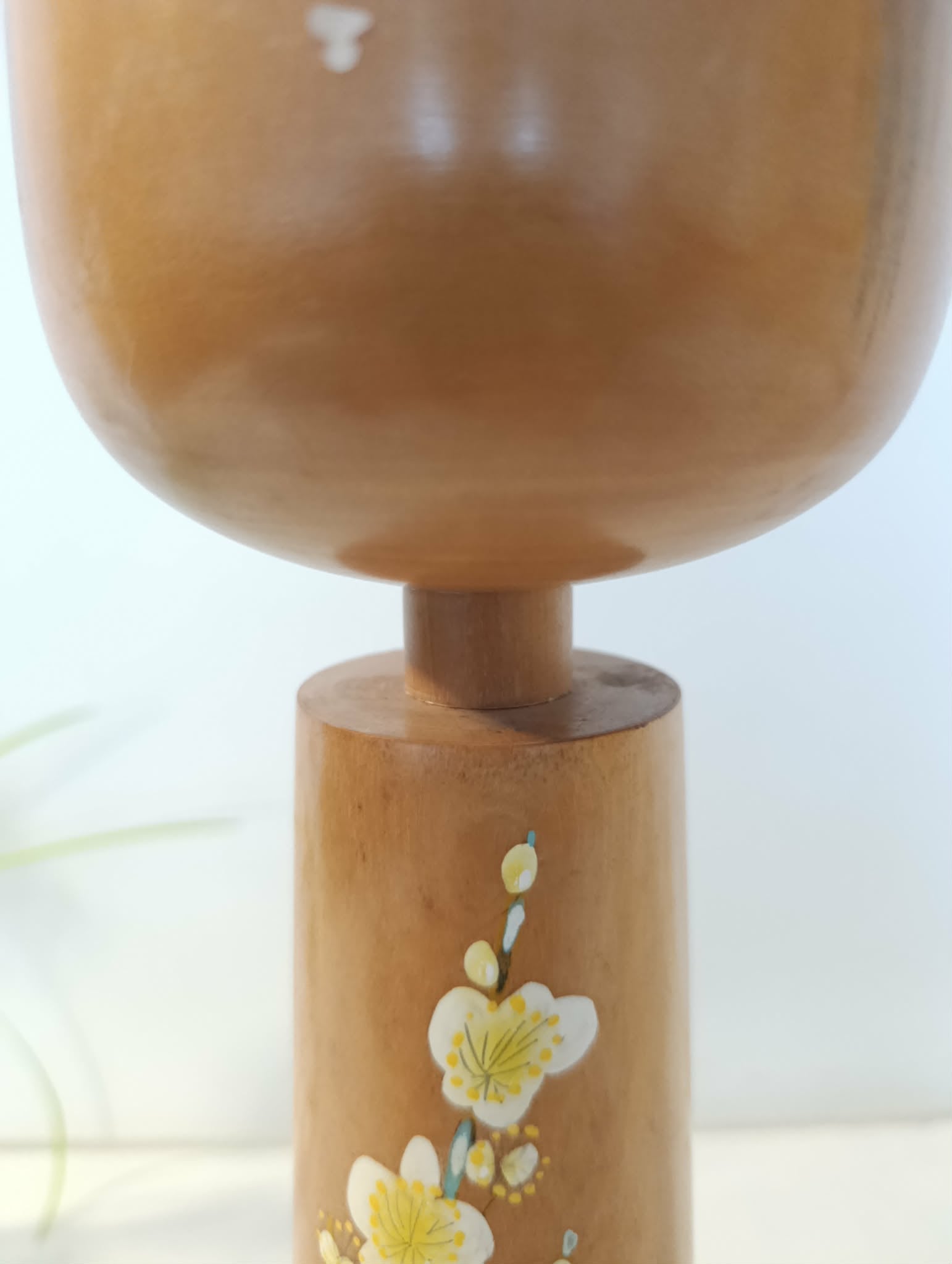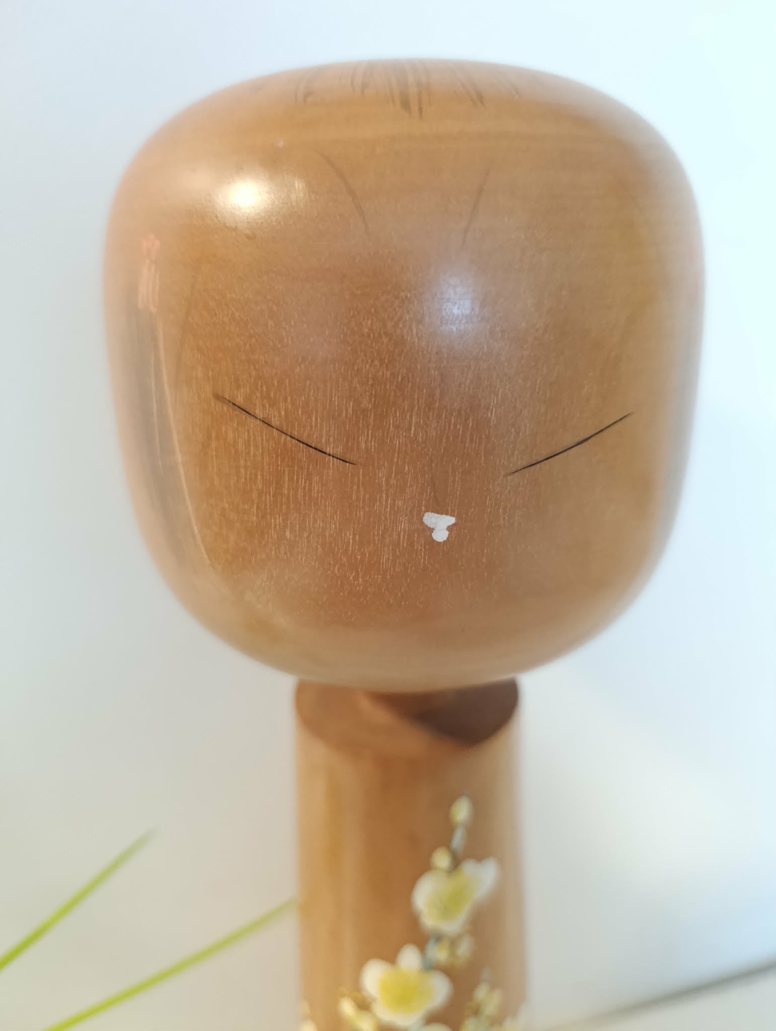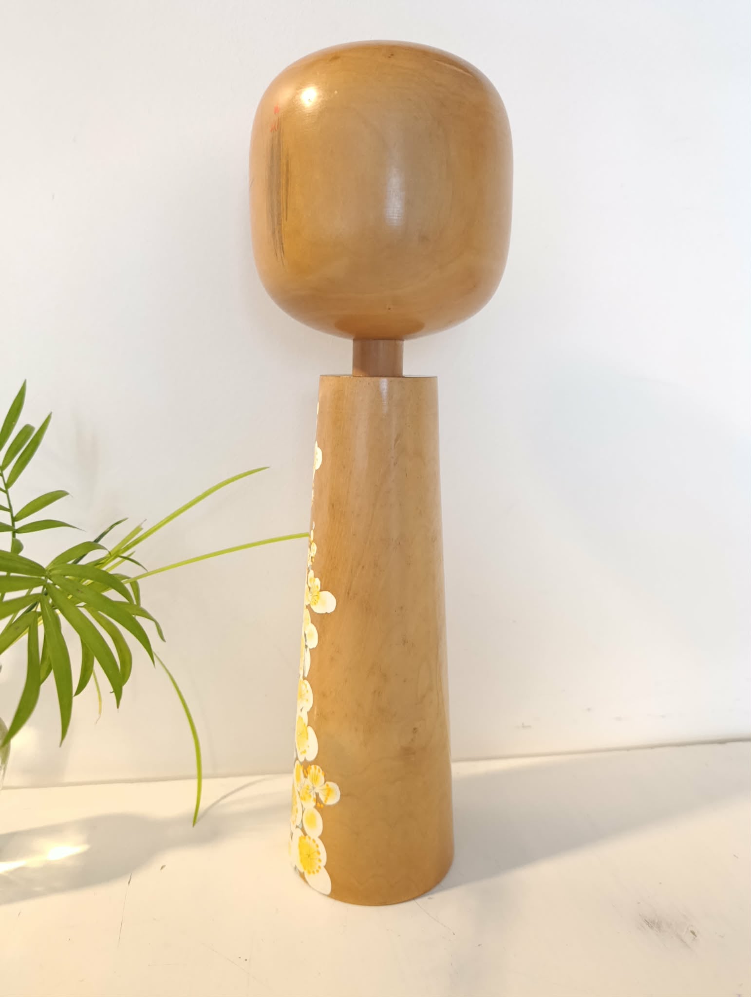 Imposante kokeshi sosaku vintage , par Takahashi Hashime ( 1918-2002 ). Magnifiquement décorée par un superbe bouquet de fleurs de prunier , cette pièce au bois blond, très dense (1kg050-36.5cm) est une indispensable beauté. Prix du 1er ministre. Années 80.