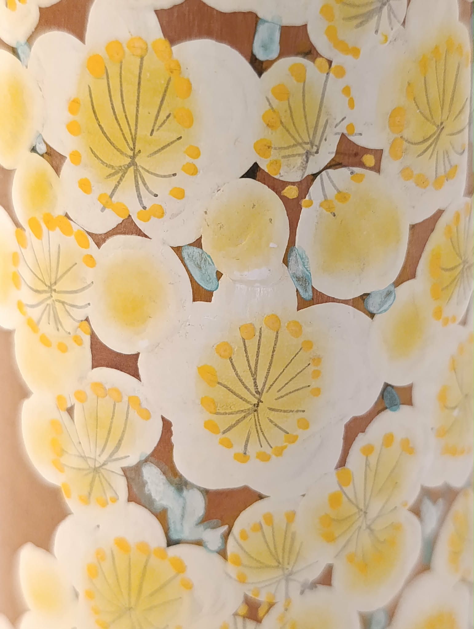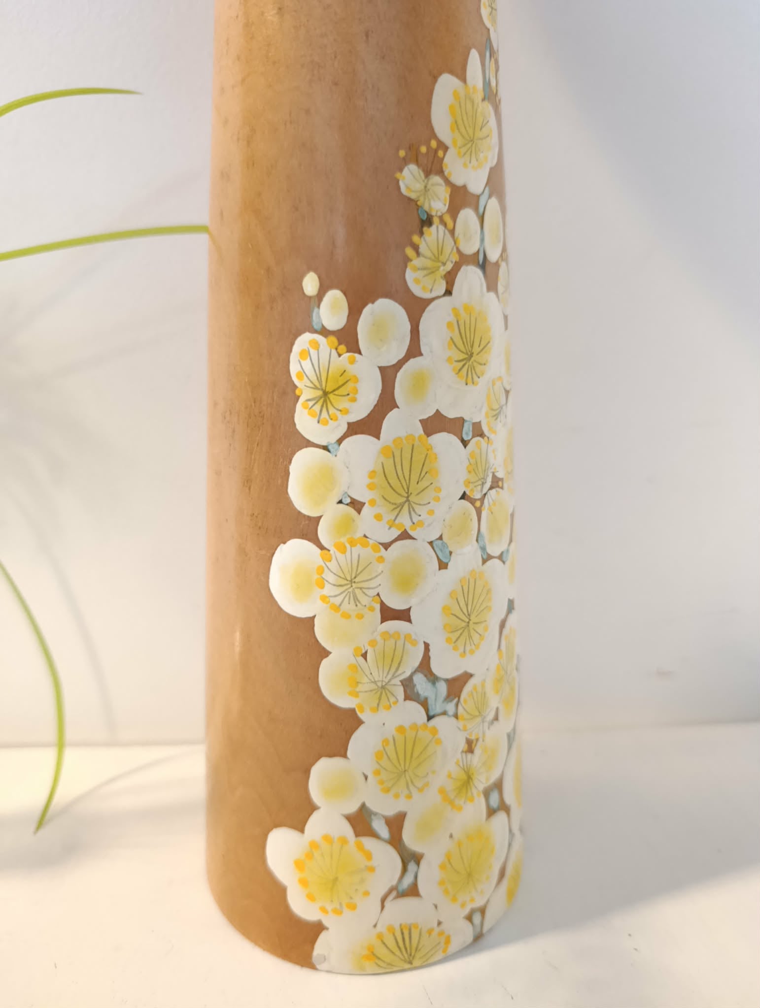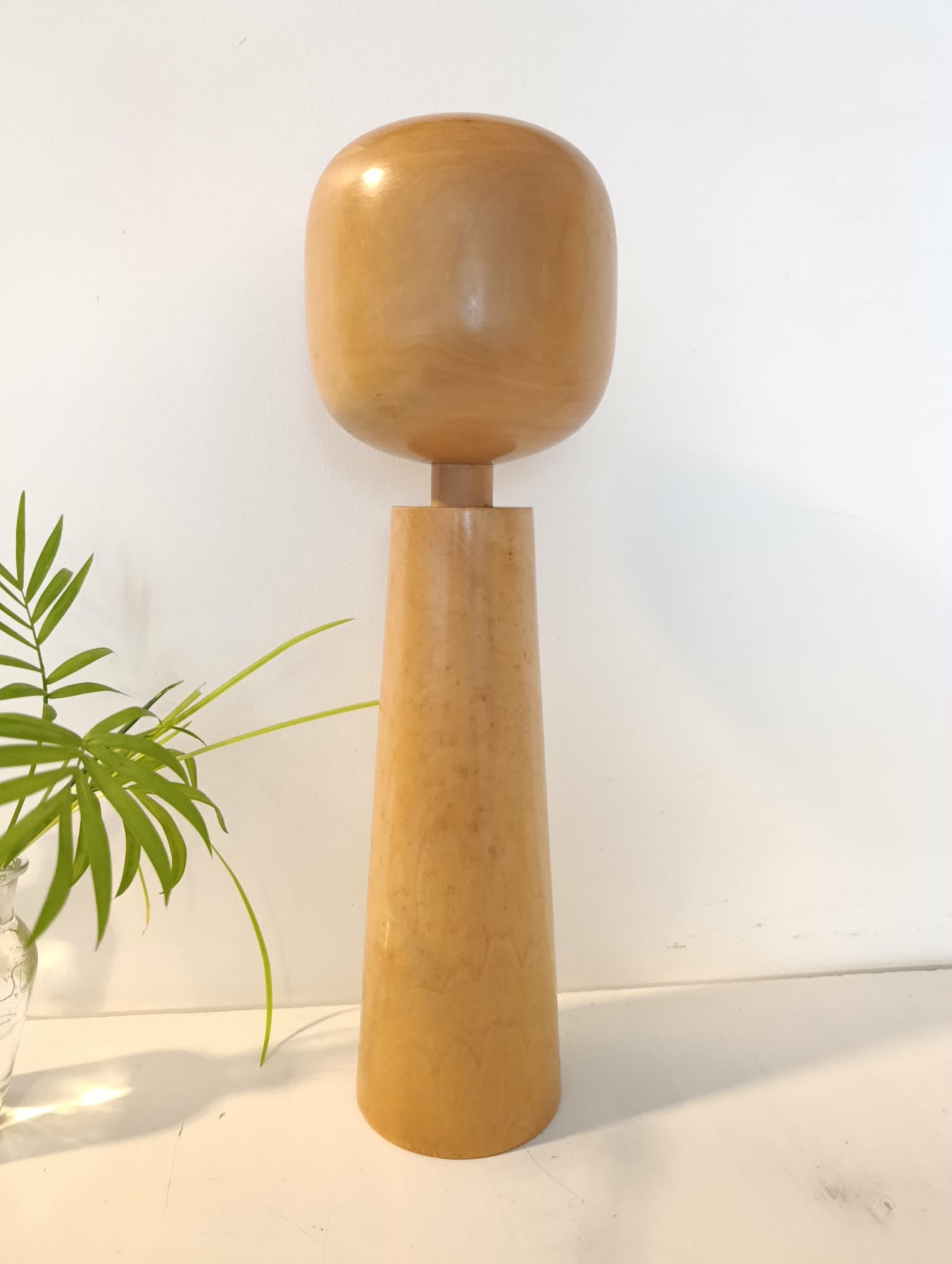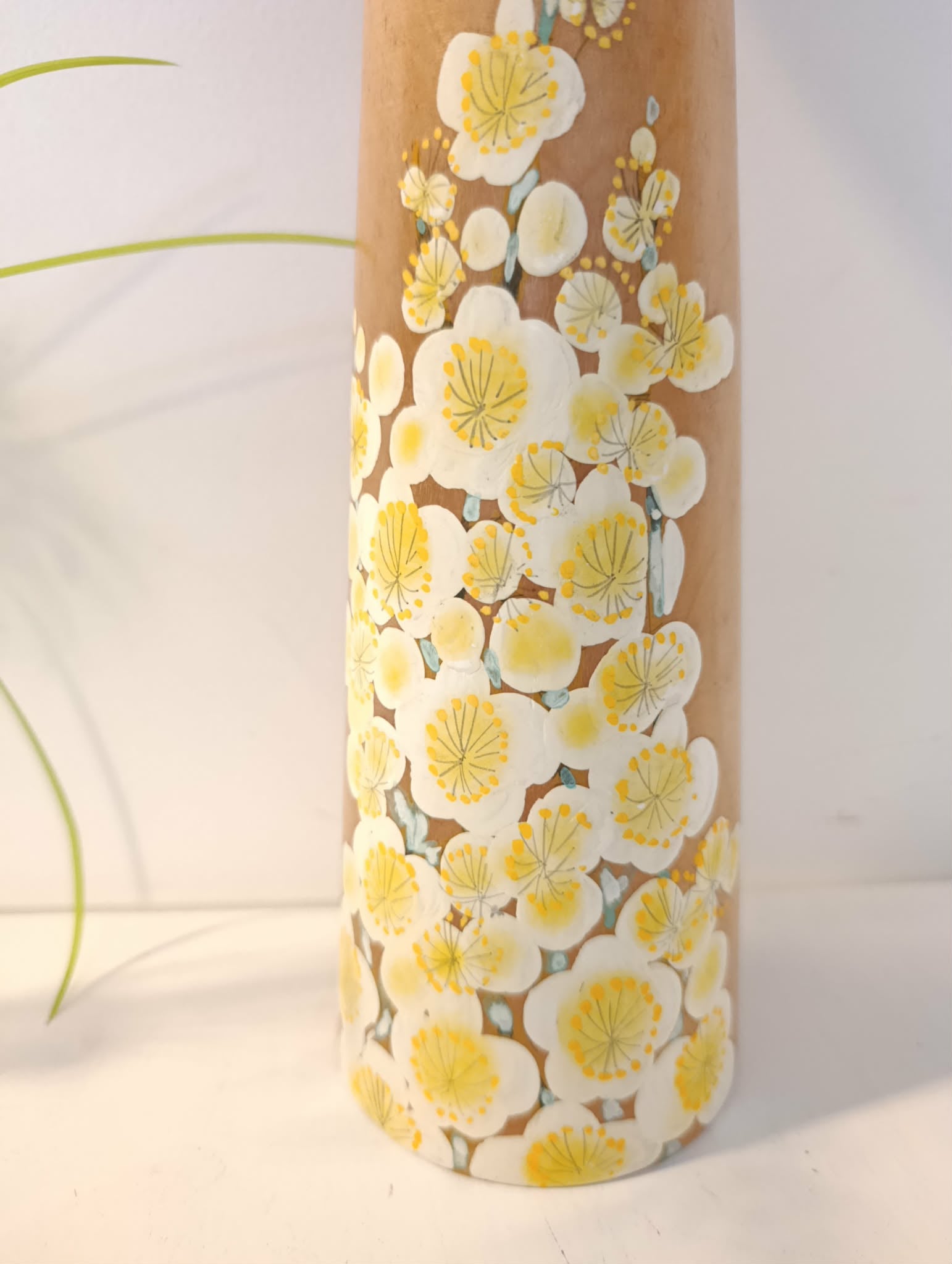 Imposante kokeshi sosaku vintage , par Takahashi Hashime ( 1918-2002 ). Magnifiquement décorée par un superbe bouquet de fleurs de prunier , cette pièce au bois blond, très dense (1kg050-36.5cm) est une indispensable beauté. Prix du 1er ministre. Années 80.