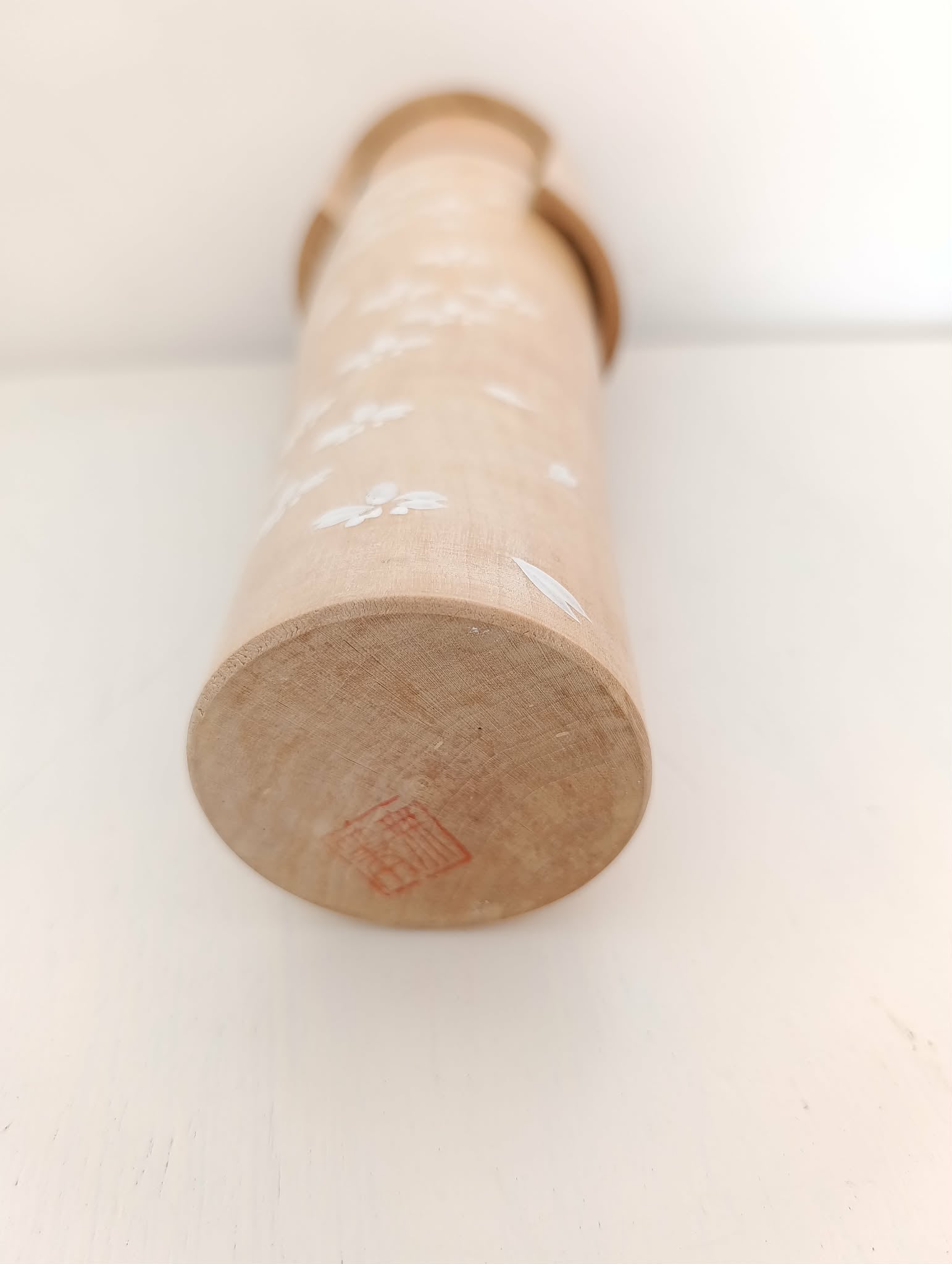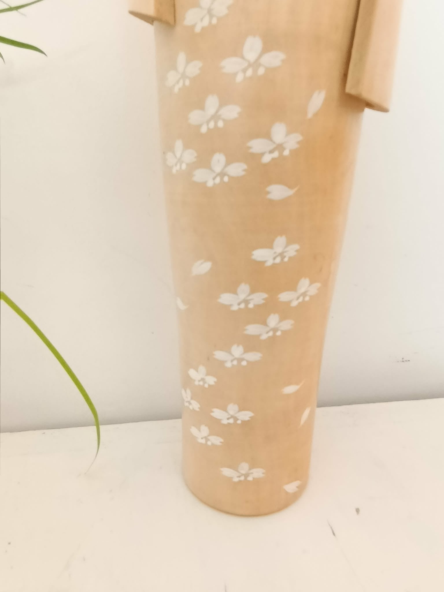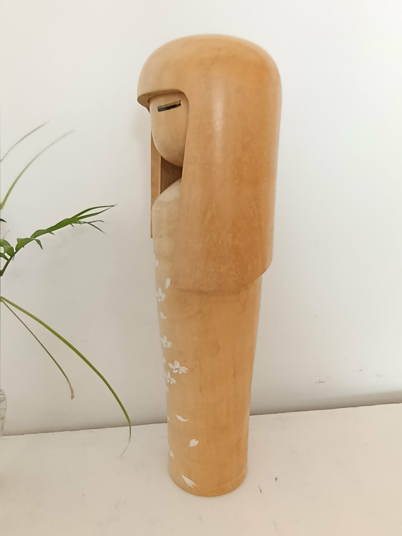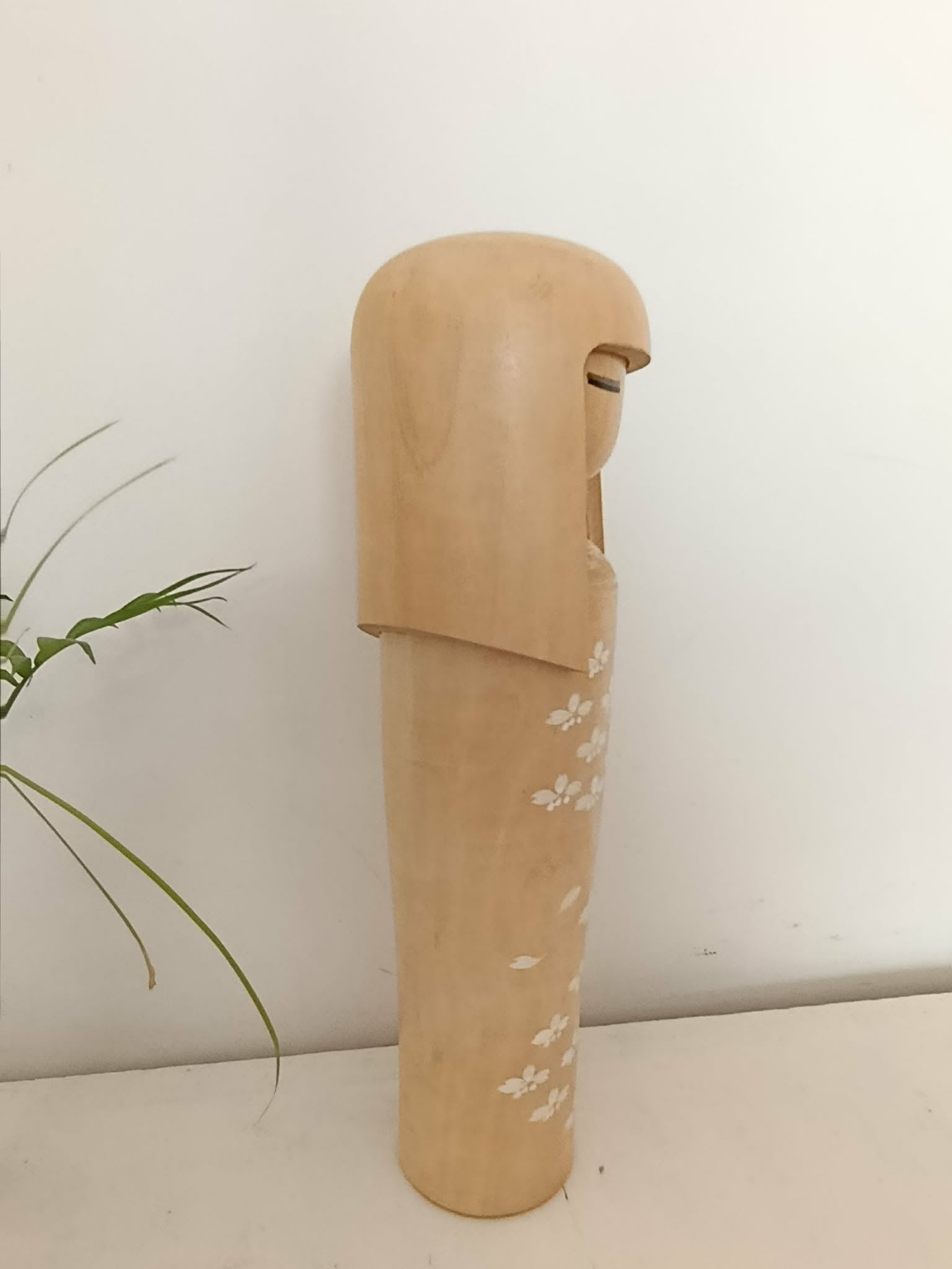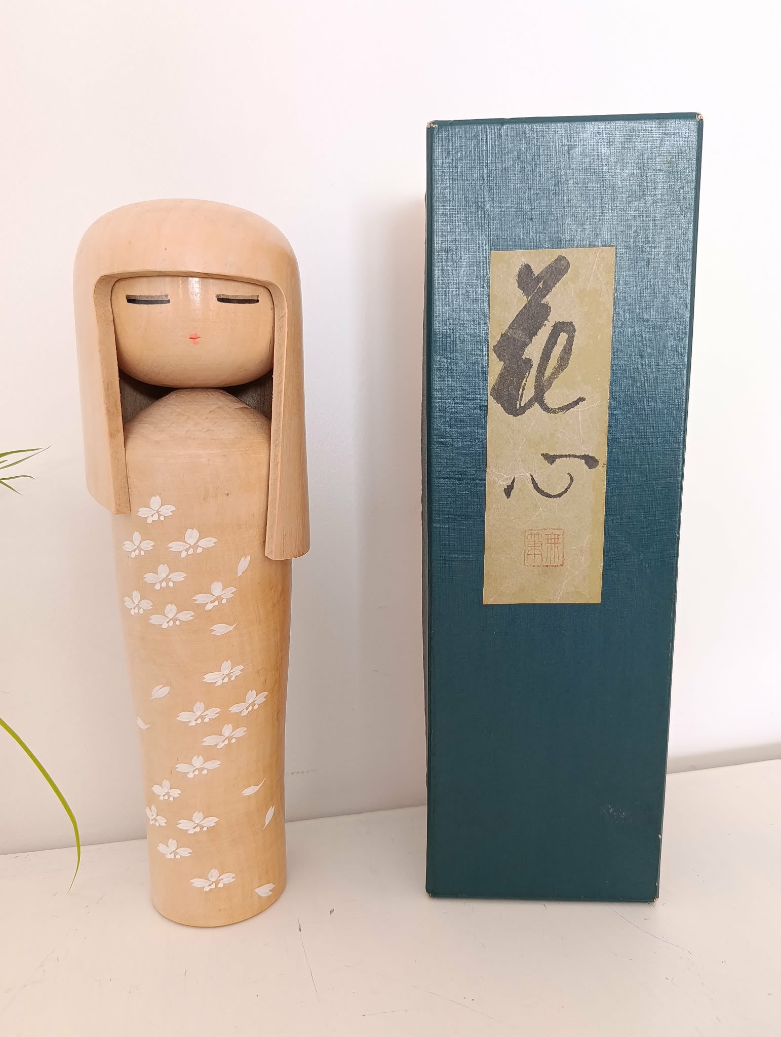 Imposante et fascinante kokeshi sosaku vintage, par Miyajima Muhitsu (1929...) . Coiffure asymétrique et pâleur donnent à cette beauté un coté étrange et majestueux... Probablement restée dans sa boîte , elle affiche malgré son âge , un état parfait . Bois dense. Années 70/80. Hauteur 29 cm.