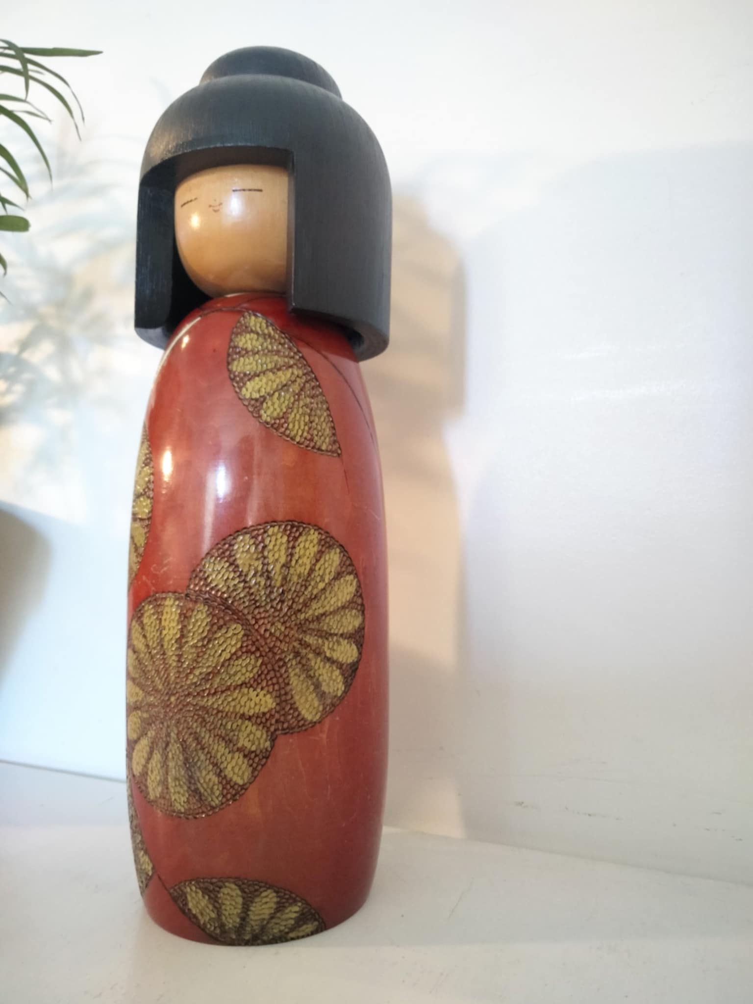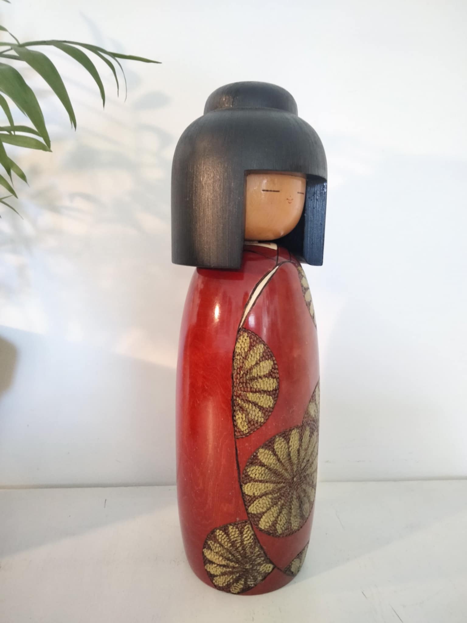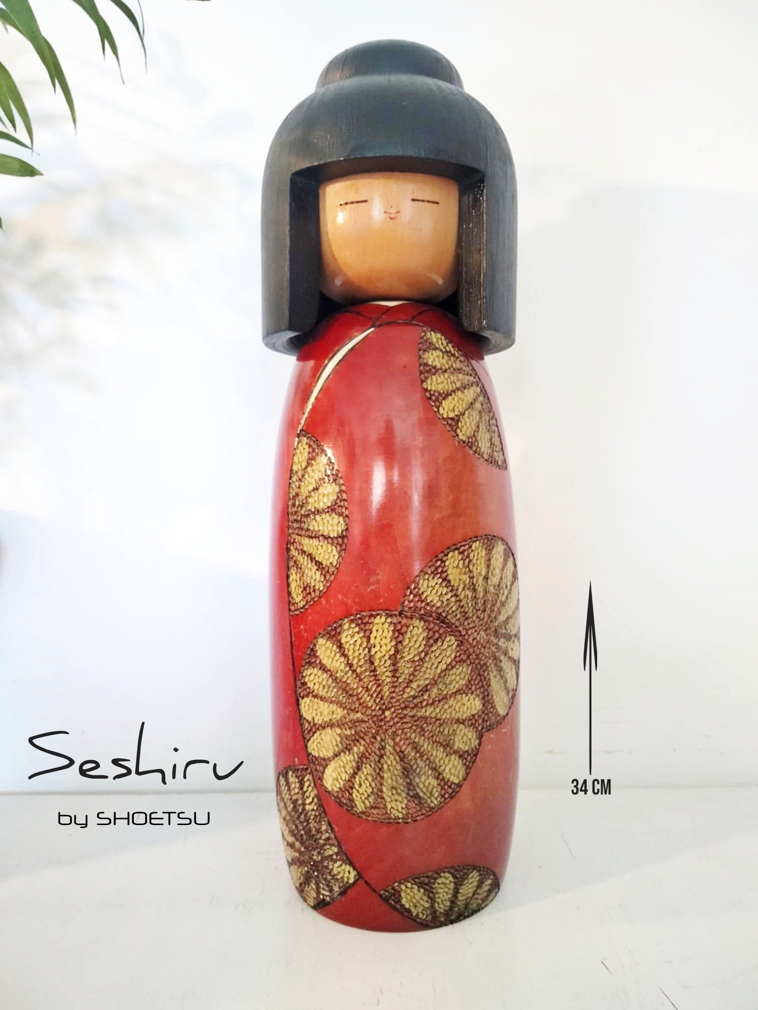 Très imposante (34cm/1kg400) kokeshi sosaku vintage , par le très rare Shoetsu . Magnifiquement et finement sculptée par l'artiste, elle impose par le choix des teintes et un laquage haut de gamme, sa classe et sa beauté rare. Années 80.