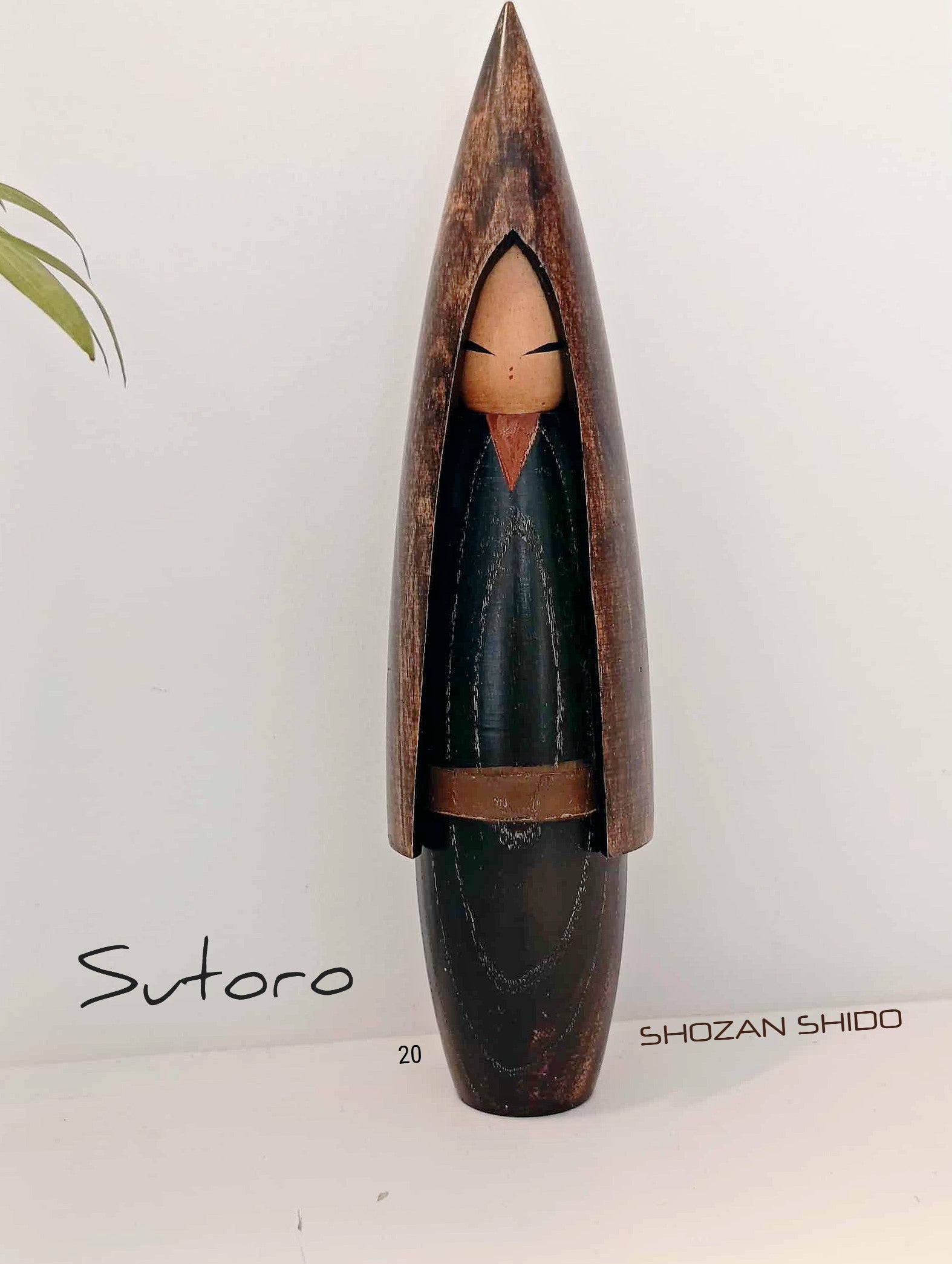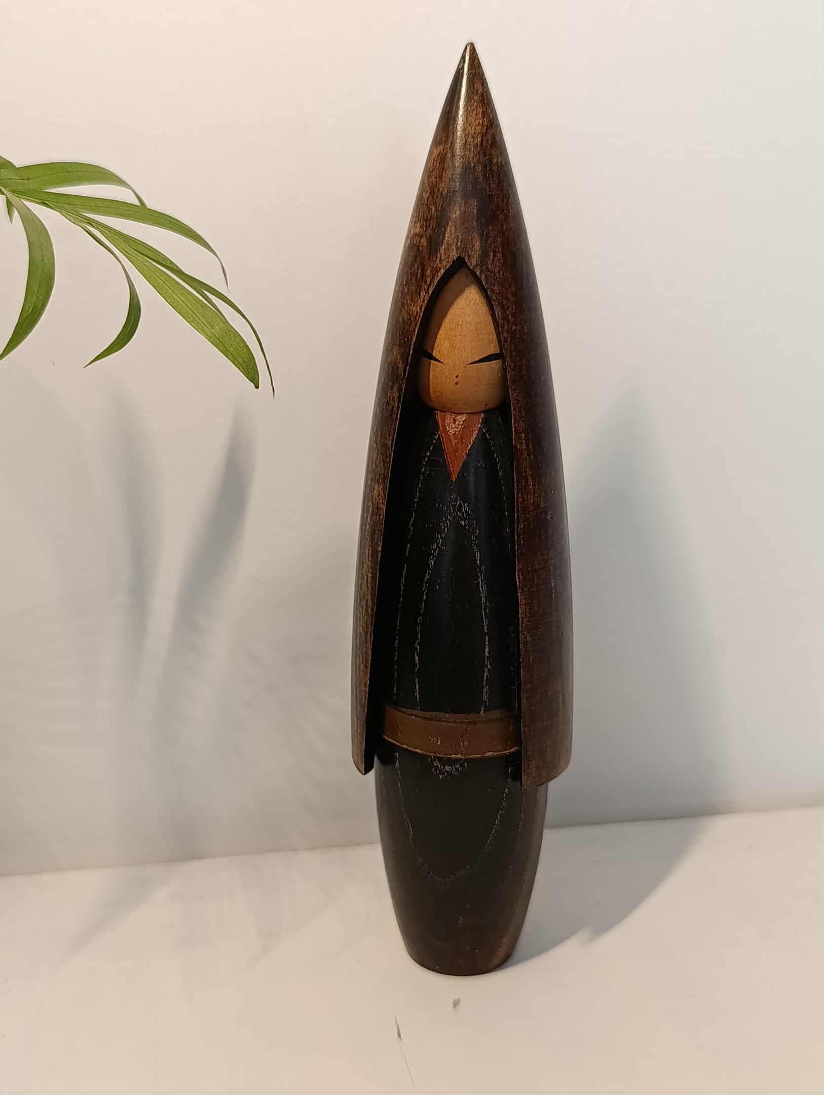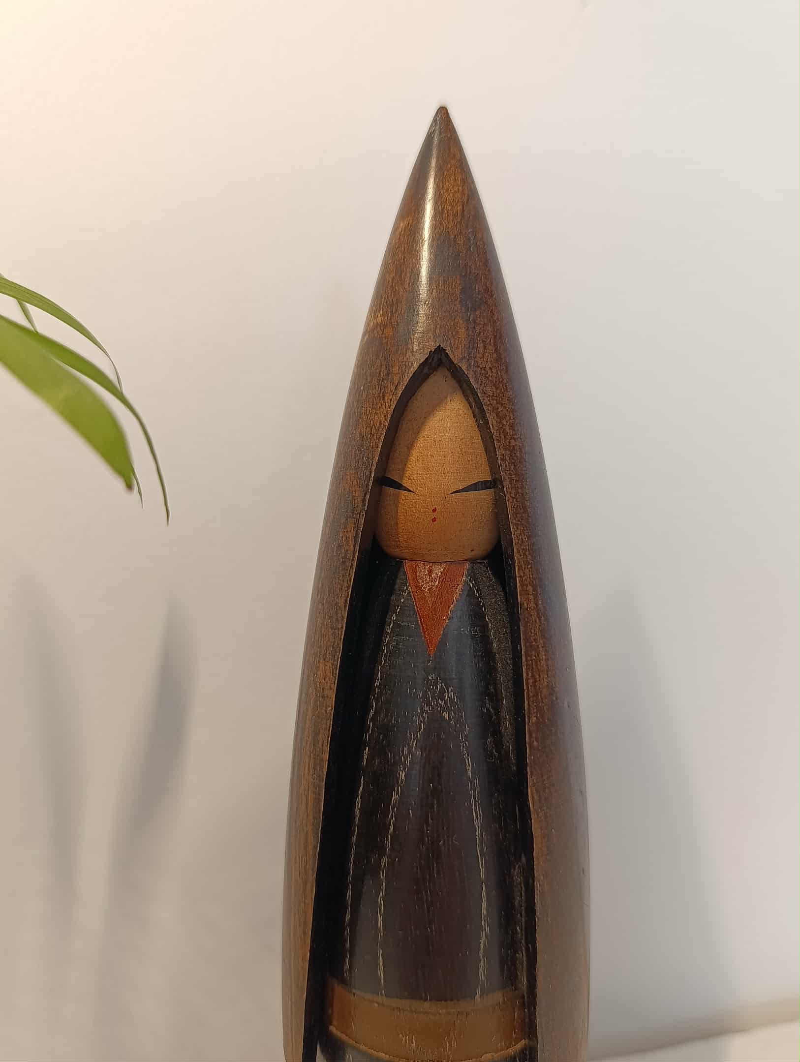 Kokeshi sosaku vintage, par Shozan Shido ( 1932-1995 ) , maître maintes fois primé . Cette création célèbre ,réalisation artistique et poétique , nous décrit un enfant vêtu d'un habit de paille... Protection contre la neige et la pluie.... Années 70/80. Hauteur 20 cm.