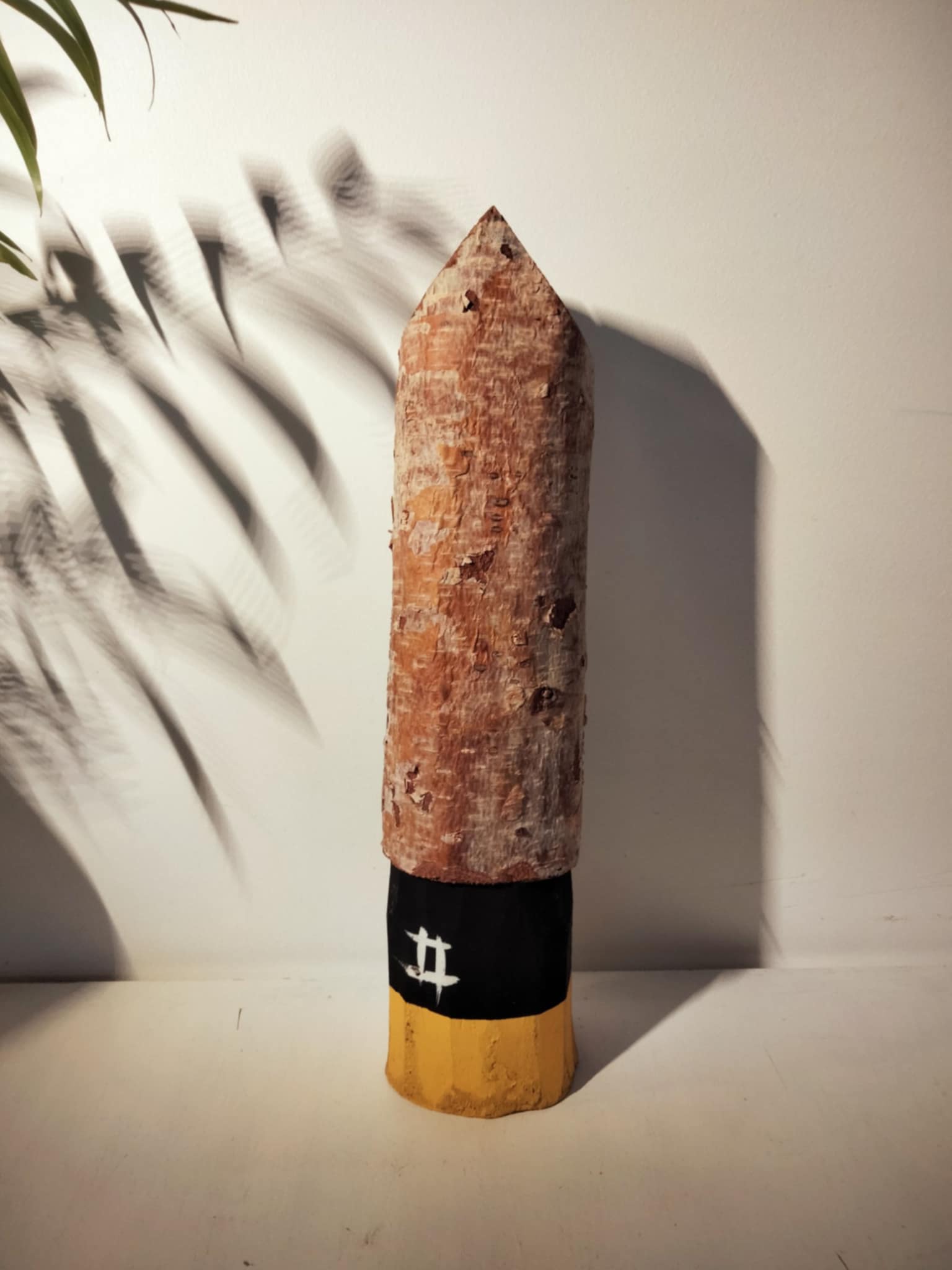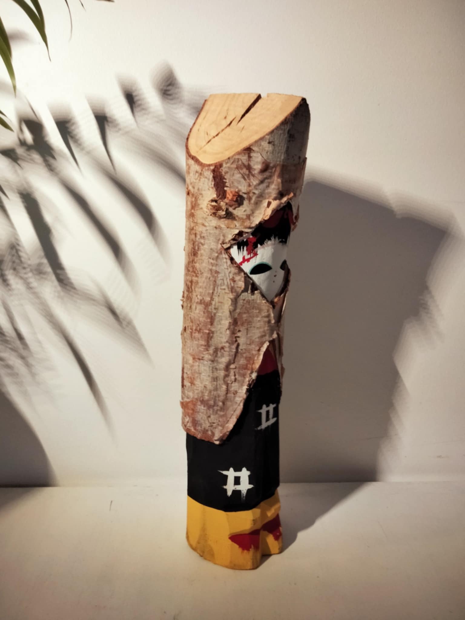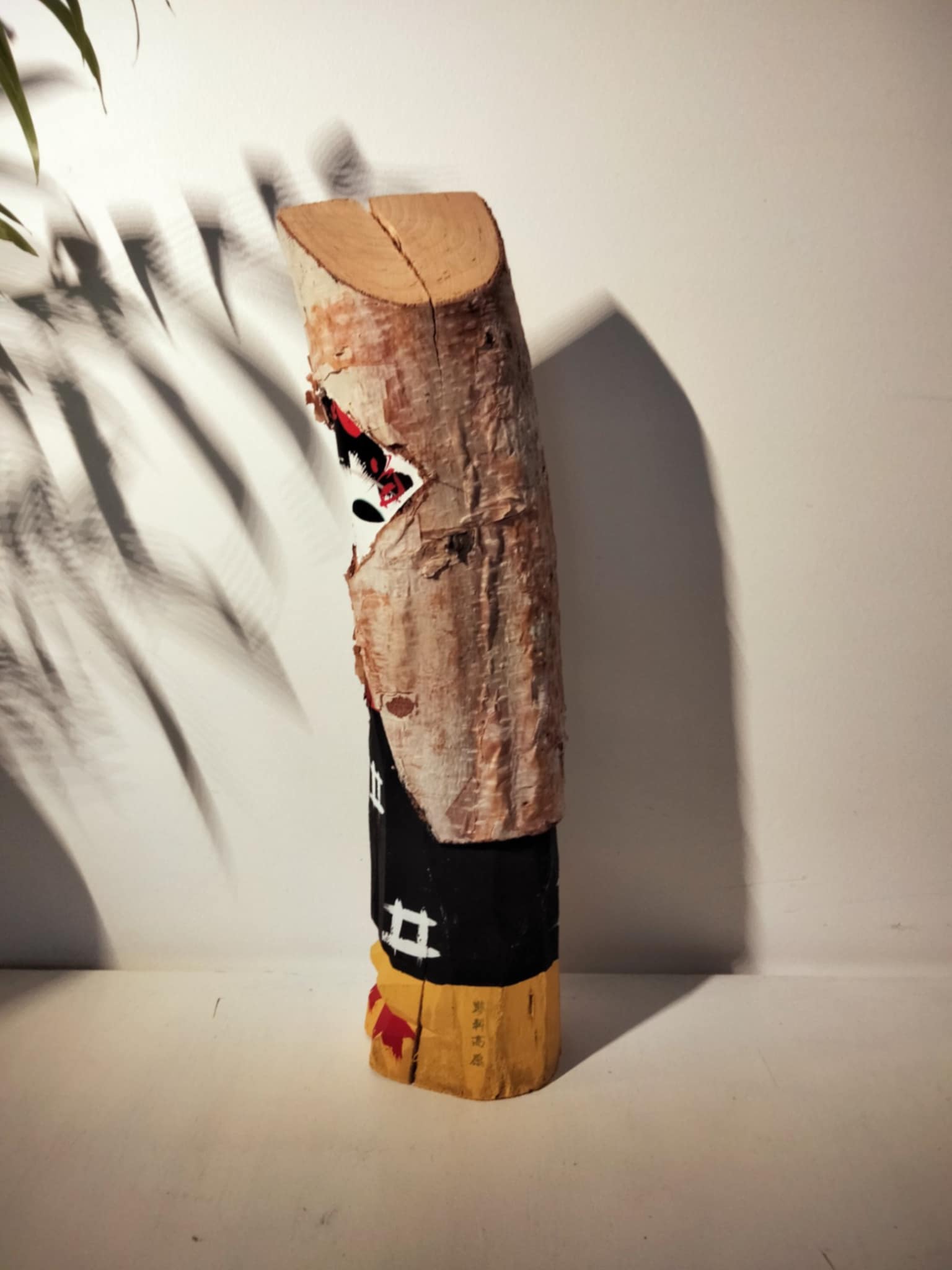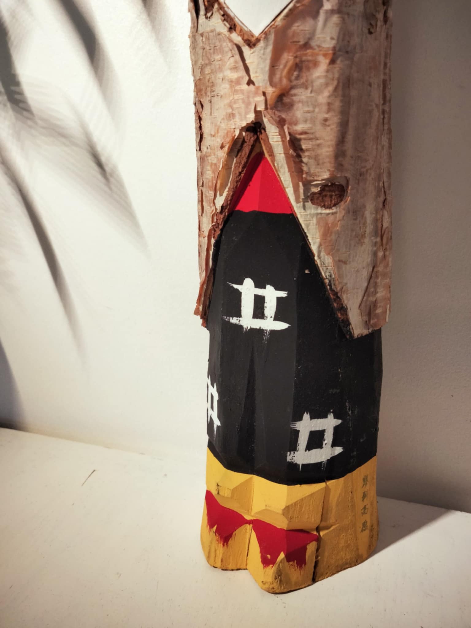 Kokeshi sosaku vintage, sculptée et peinte , à même la brance de bouleau, sans vernis de finition. Elle symbolise l'habit , que revêtaient souvent les enfants au(x) siècle(s) dernier(s), afin de se protéger de la pluie et de la neige, dans les campagnes... Hauteur 31 cm, années 70/80.