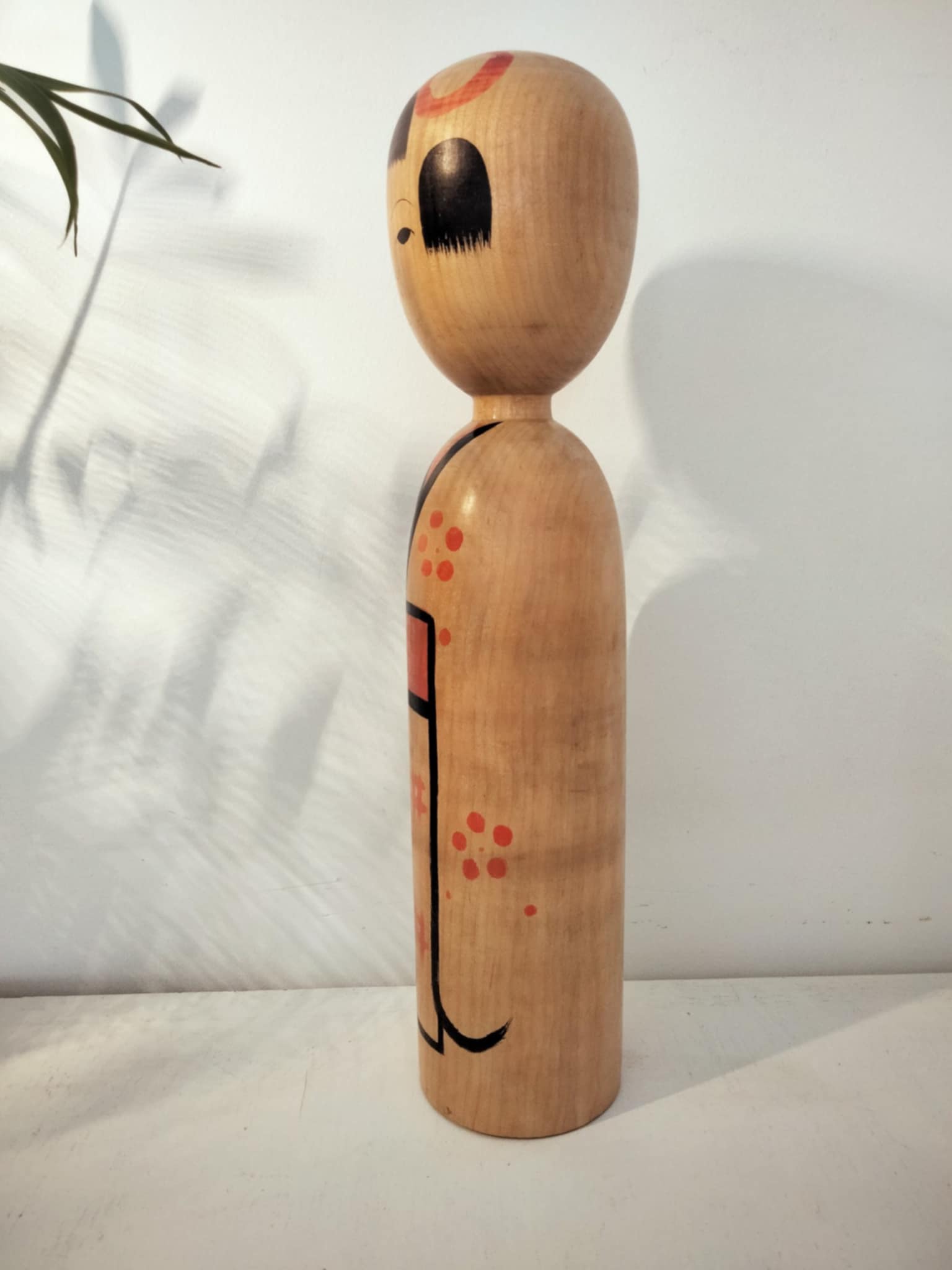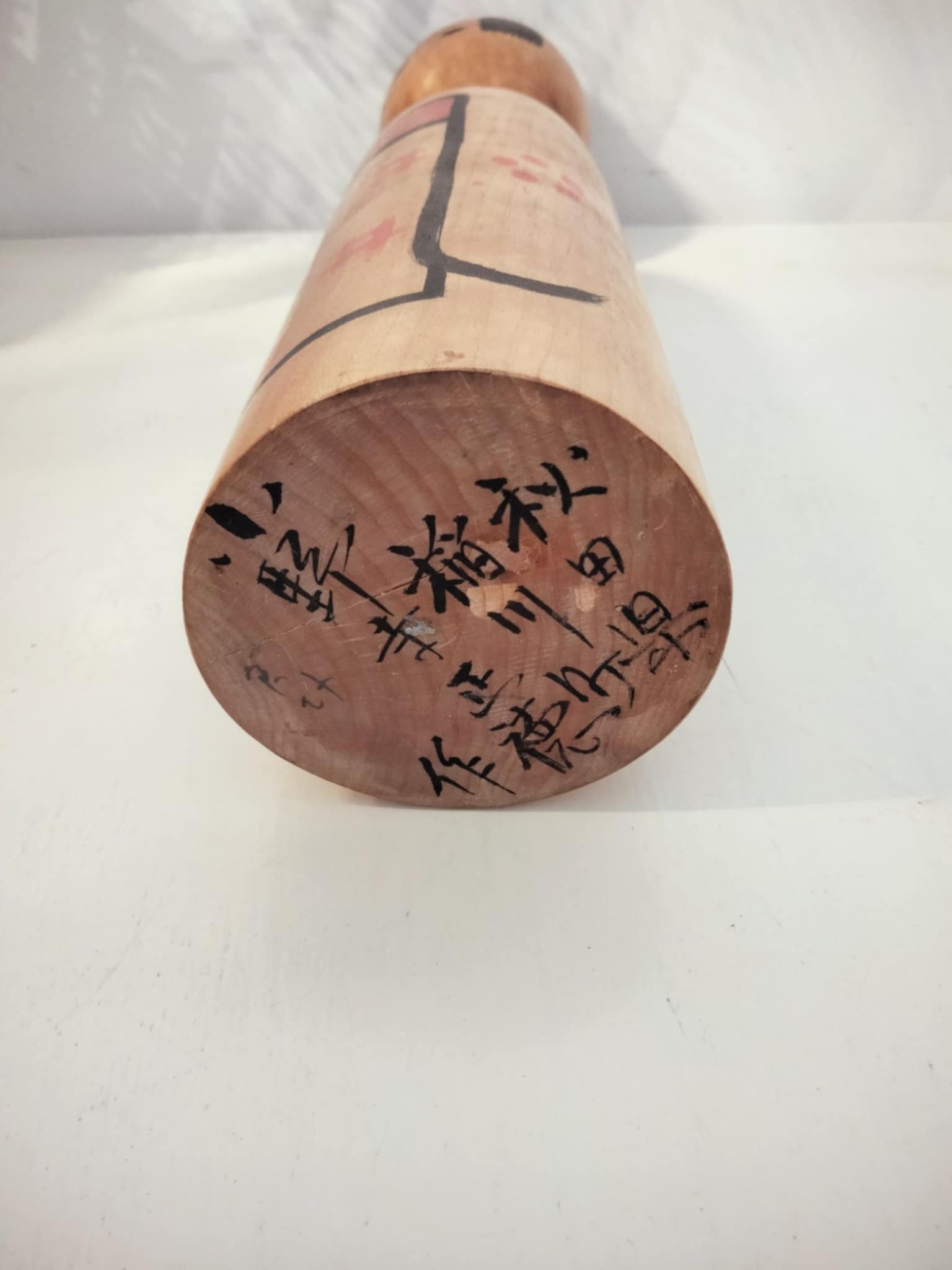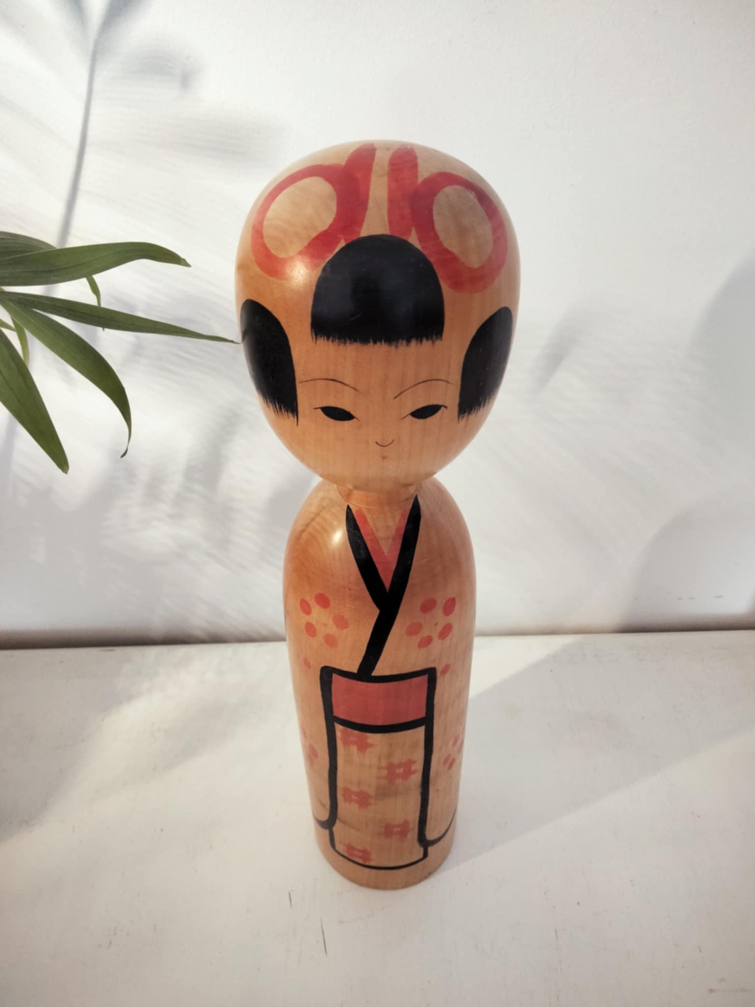 Kijiyama vintage , par Masanori Onodera ( 1948-2018 ) . Belle kokeshi , au regard sérieux, et célèbre kimono , tournée dans un seul bois, très dense, d'où une belle stabilité . Hauteur 31 cm, années 80.