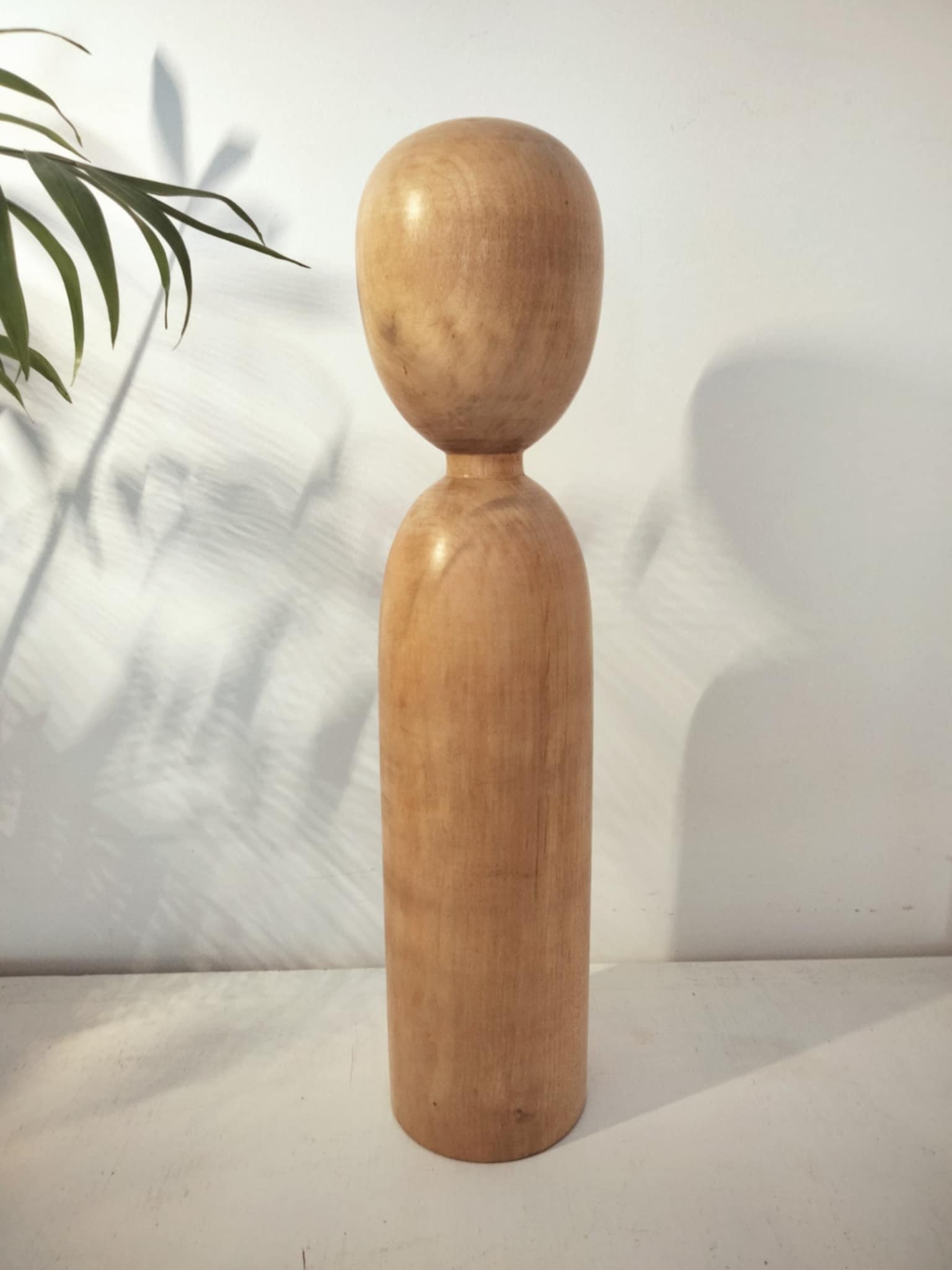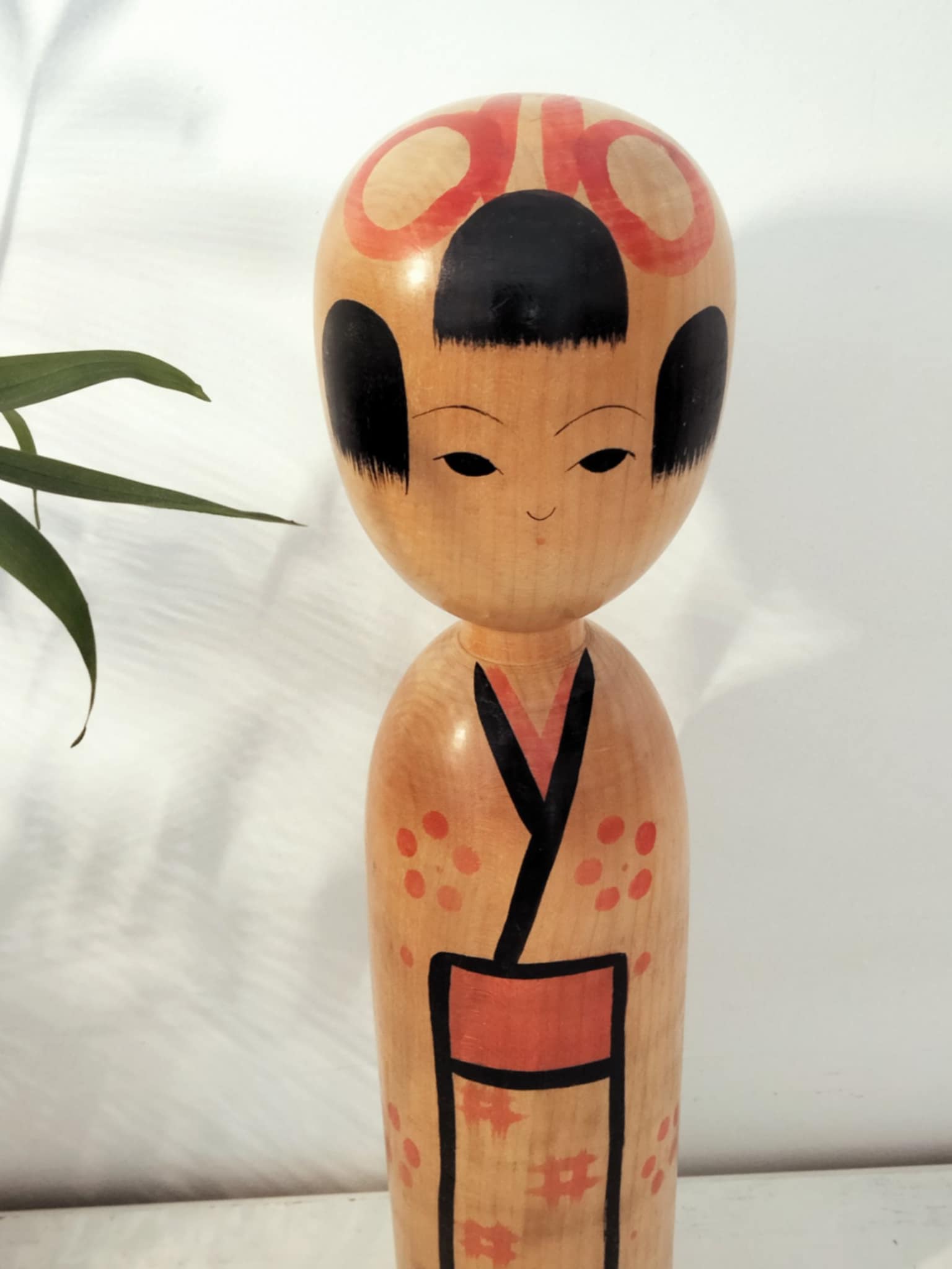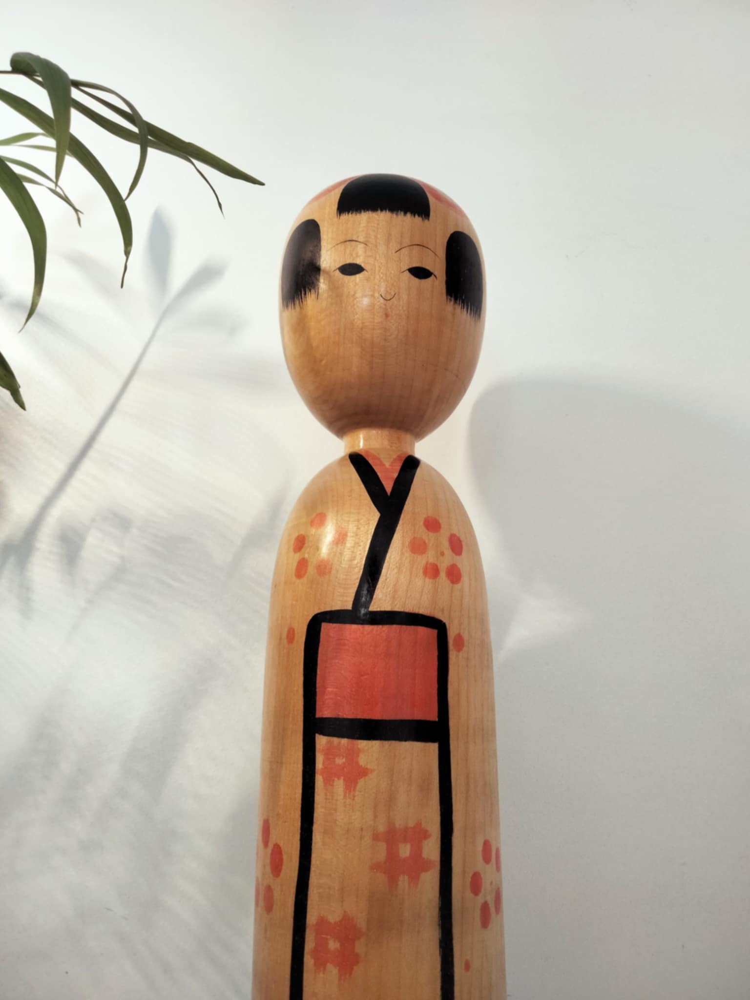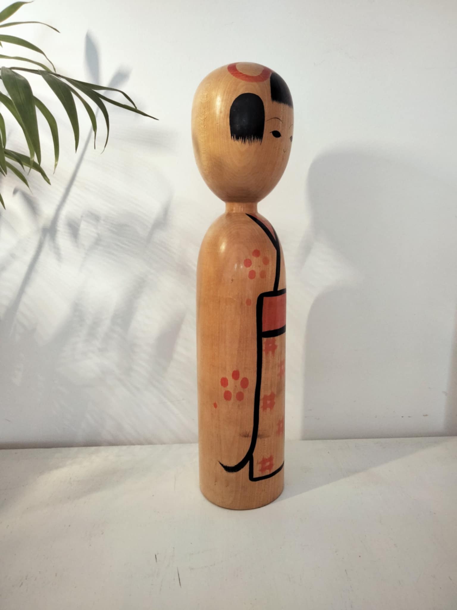 Kijiyama vintage , par Masanori Onodera ( 1948-2018 ) . Belle kokeshi , au regard sérieux, et célèbre kimono , tournée dans un seul bois, très dense, d'où une belle stabilité . Hauteur 31 cm, années 80.