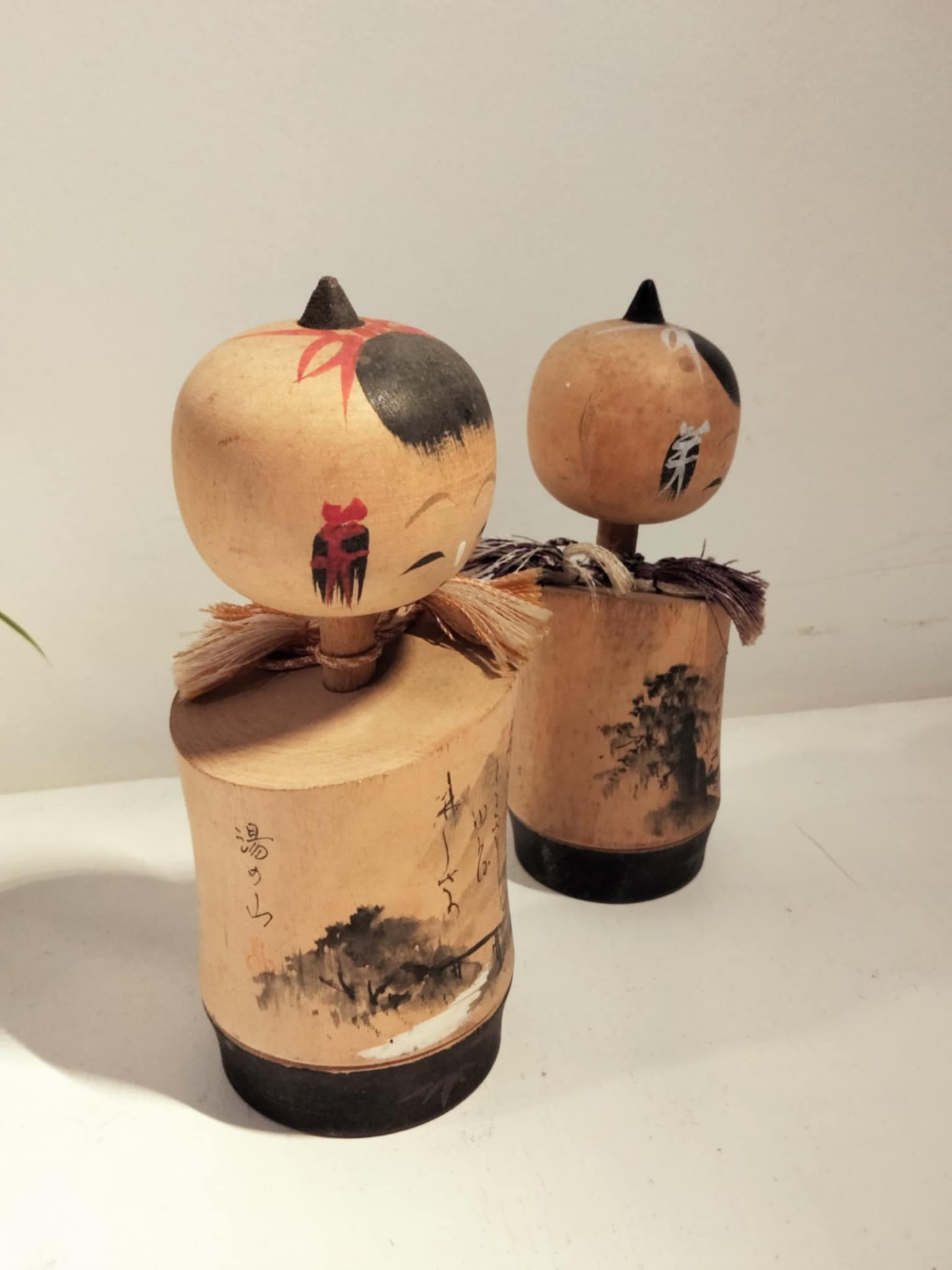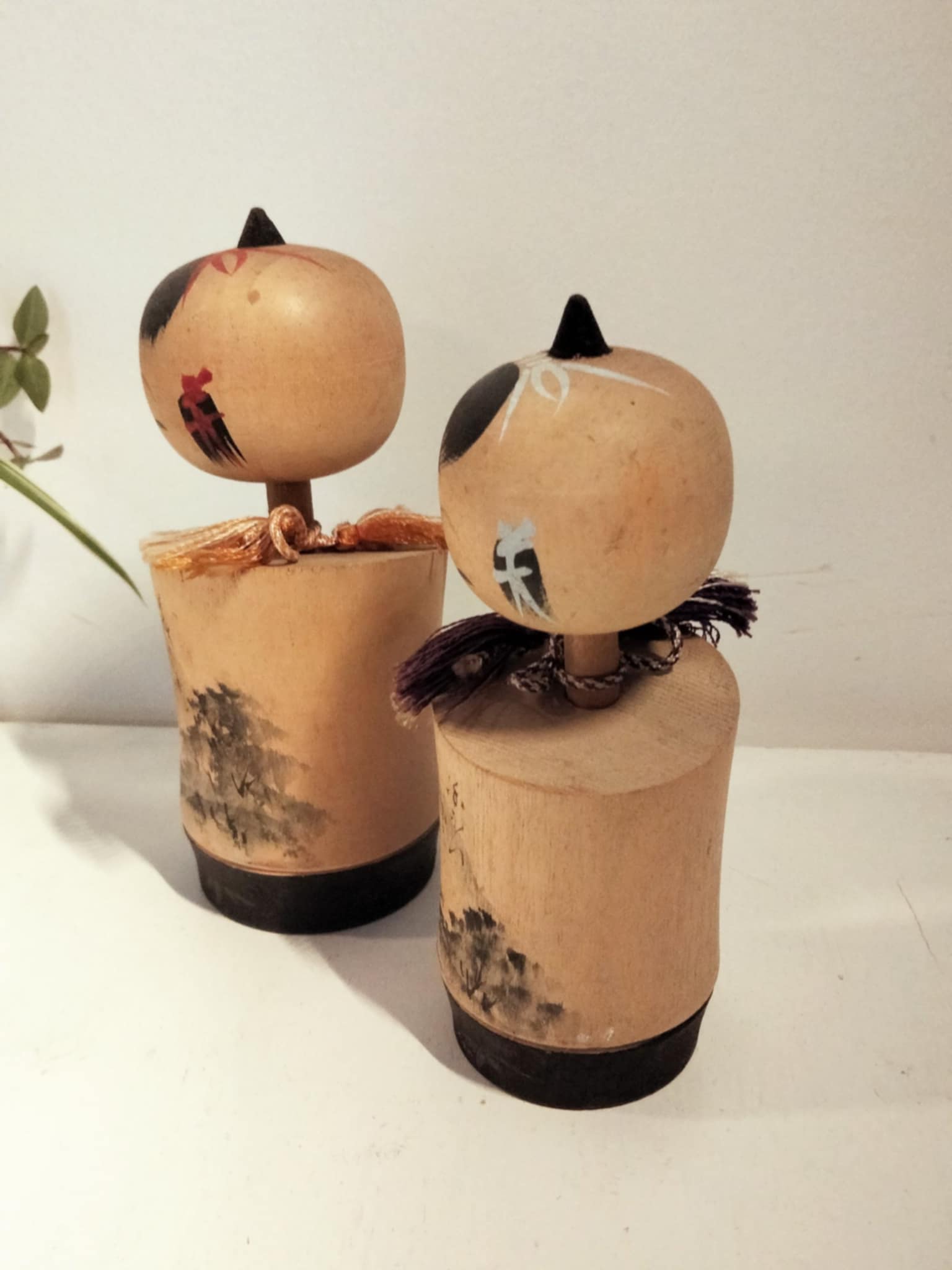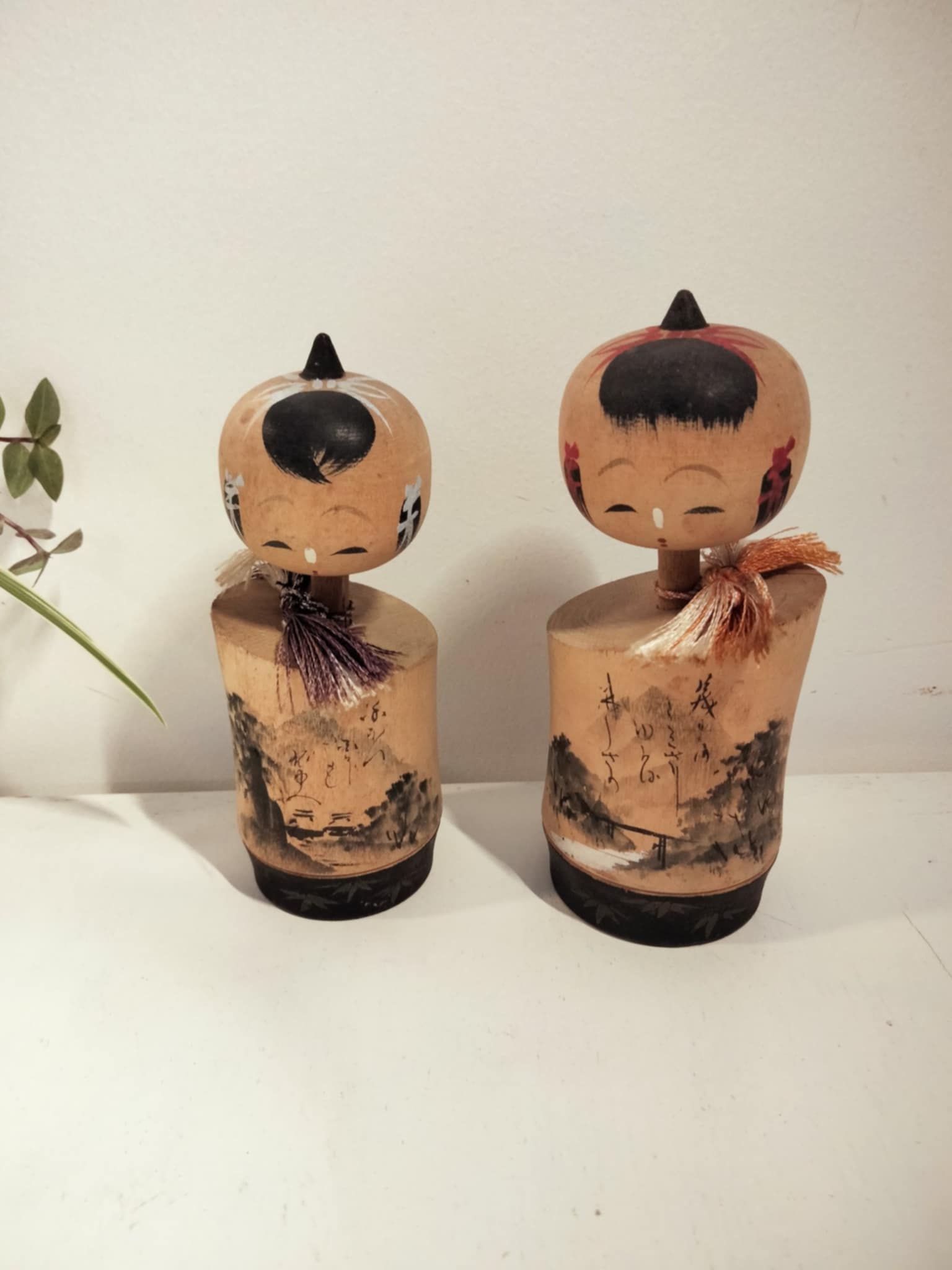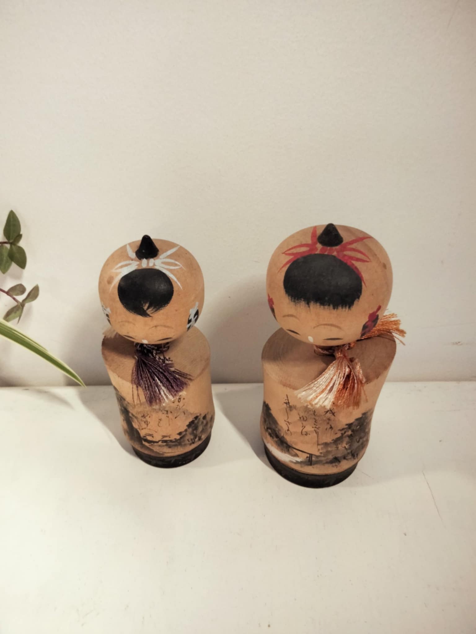 Duo kokeshi Omiyage vintage , souvenir d'Yunoyama onsen . Fins dessins monochromes . Hauteurs 12 & 11 cm. Années 60/70.