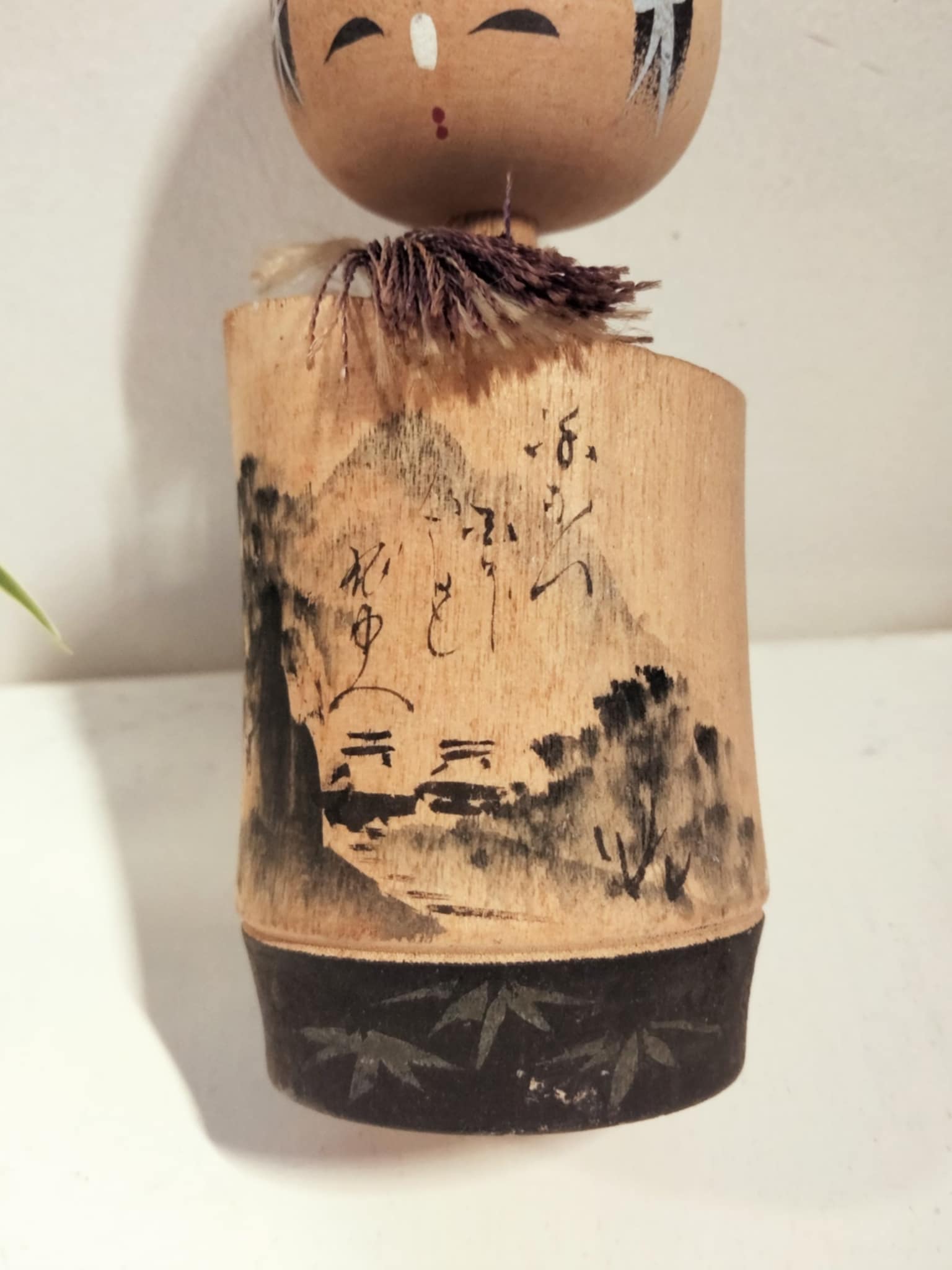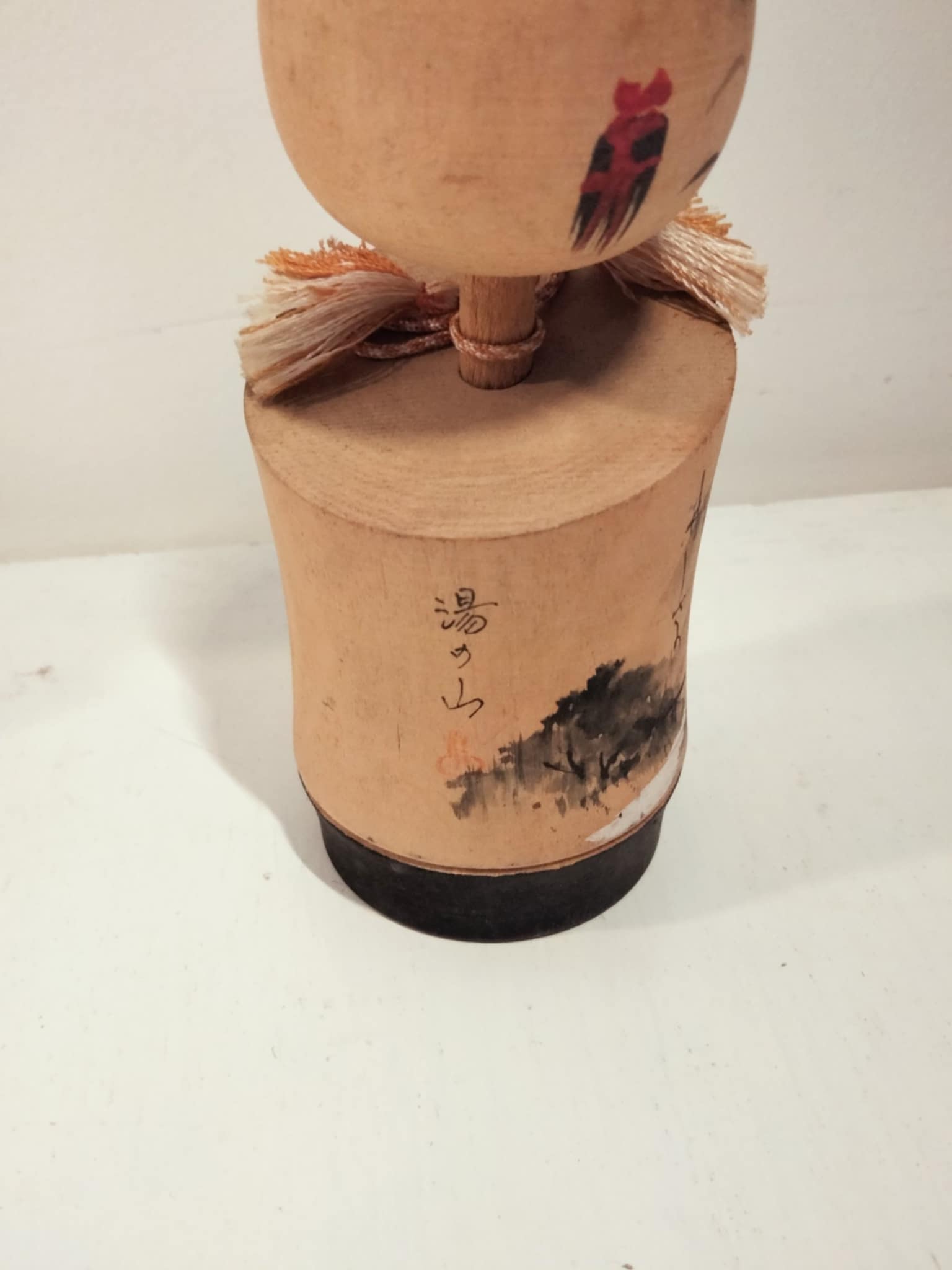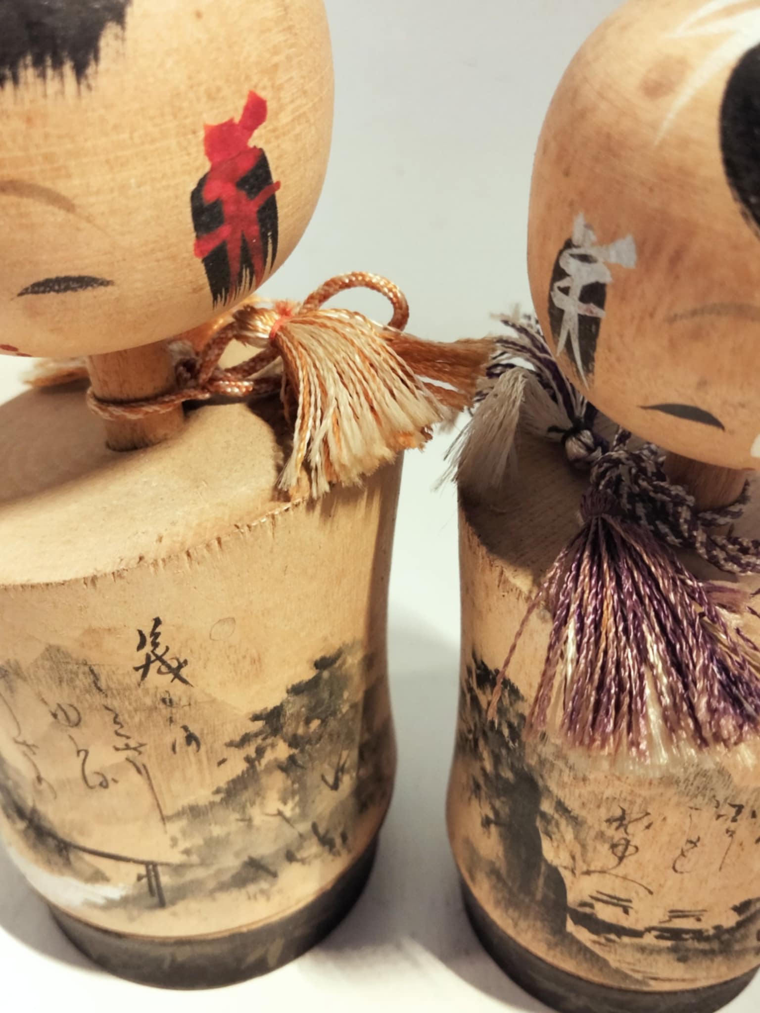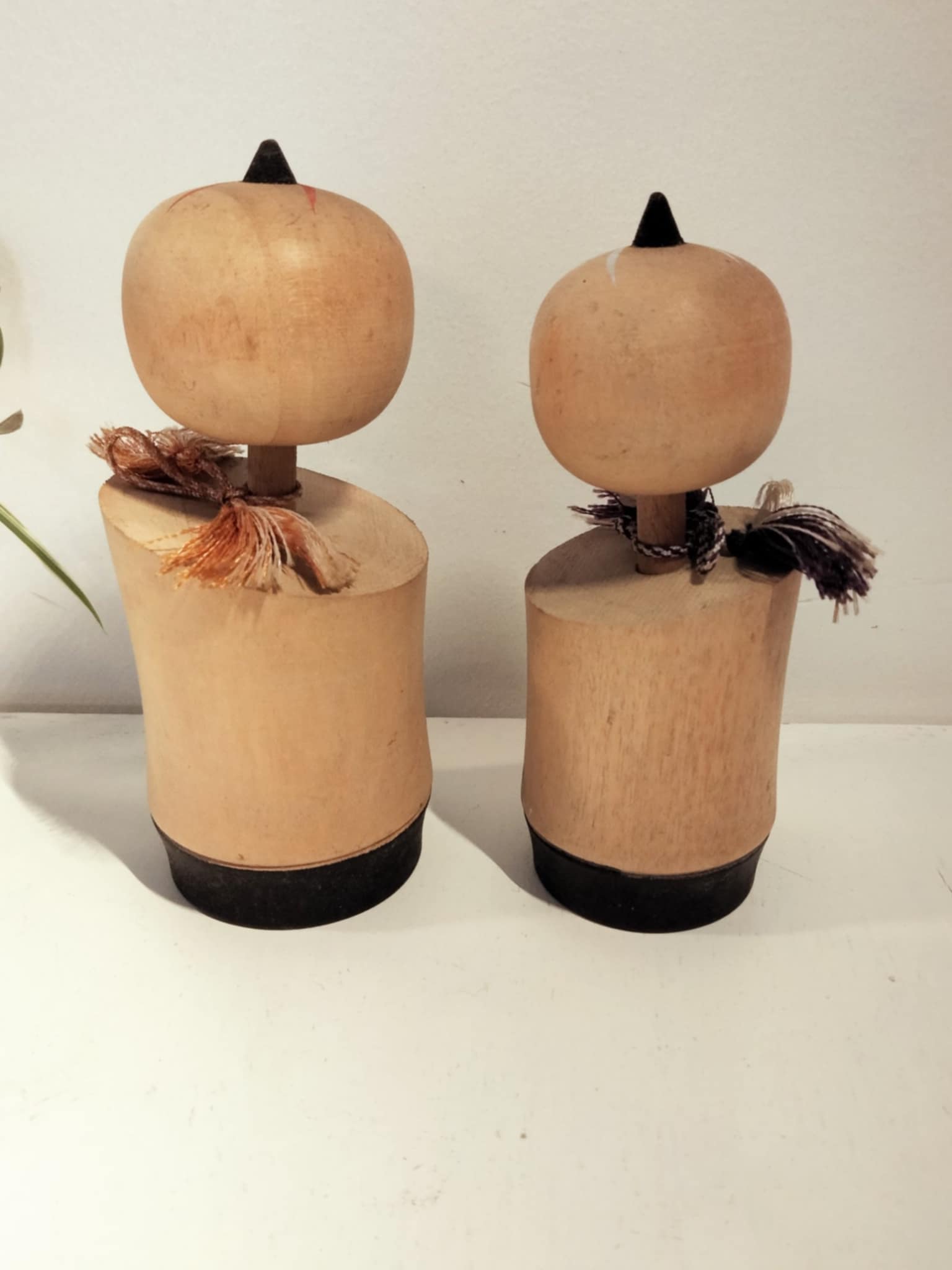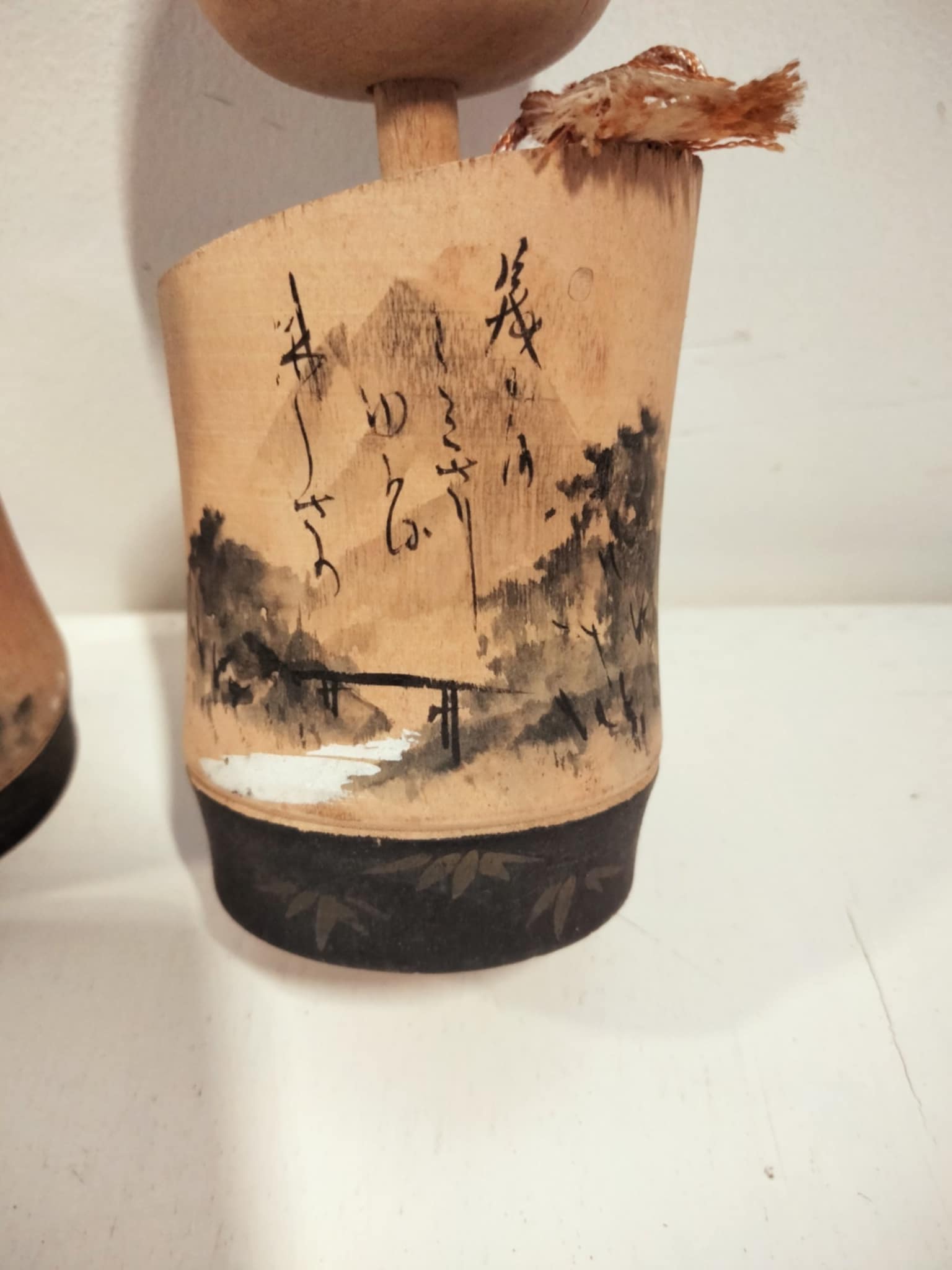 Duo kokeshi Omiyage vintage , souvenir d'Yunoyama onsen . Fins dessins monochromes . Hauteurs 12 & 11 cm. Années 60/70.